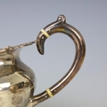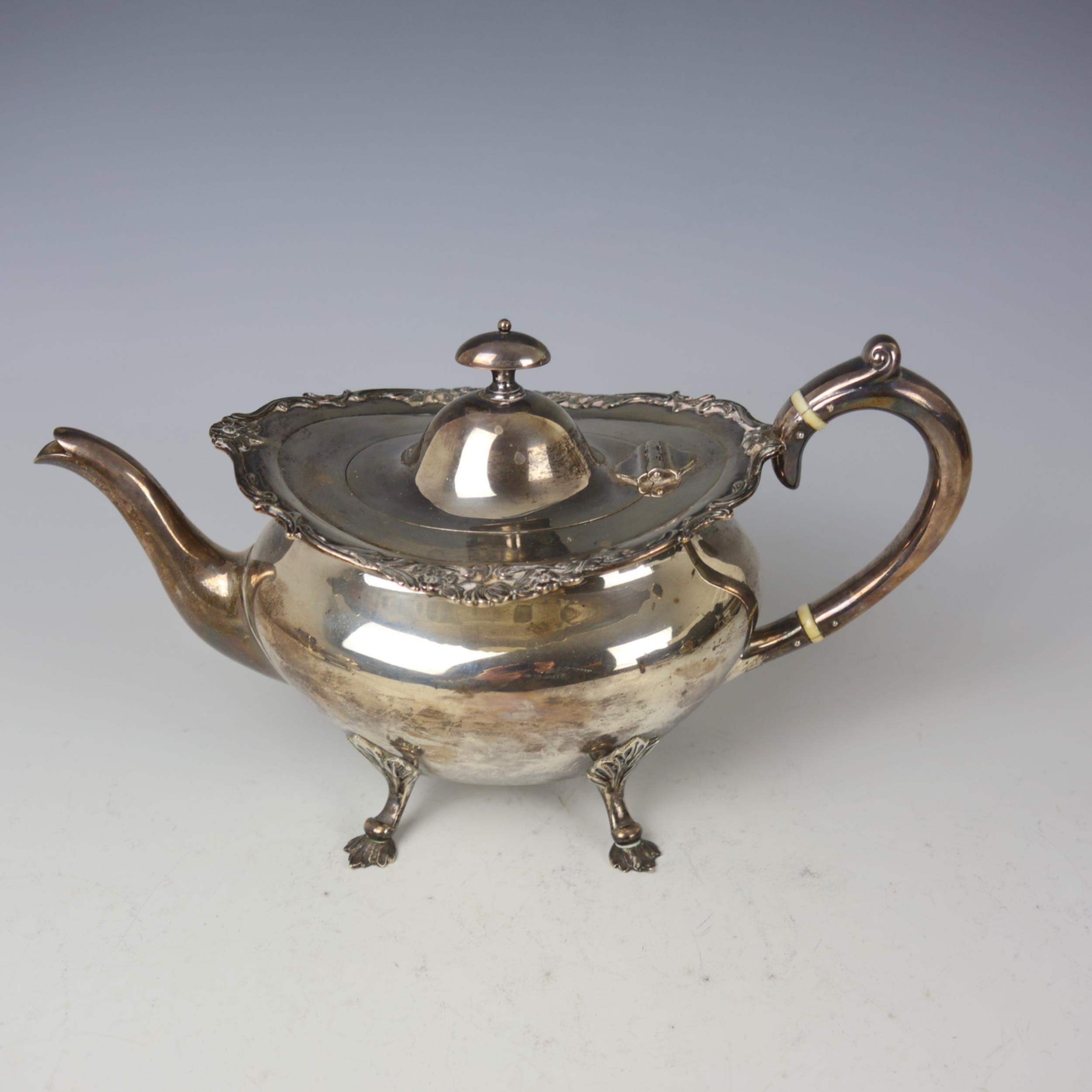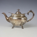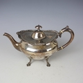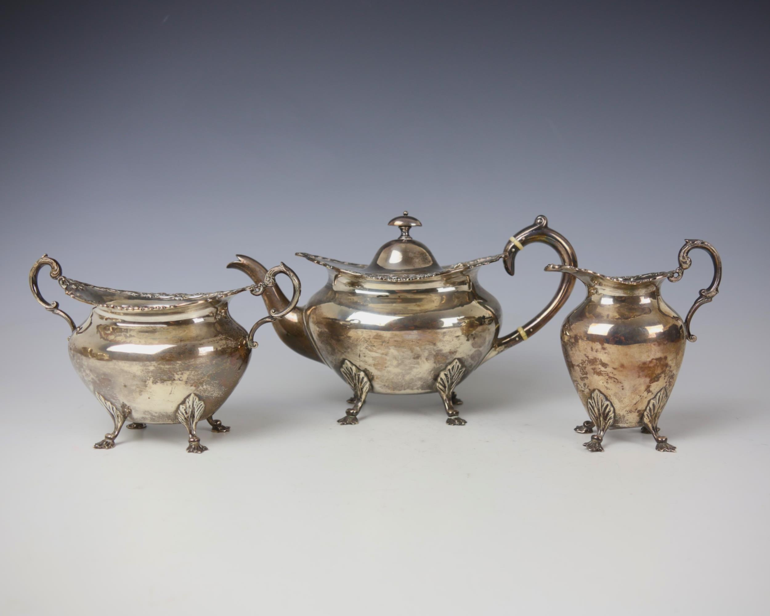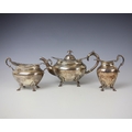 An Edwardian silver three piece tea service, John Alexander Fettes, Glasgow 1901, comprising teapot, sugar bowl and milk jug, the cast floral rim above plain polished body, upon four leaf capped styled feet, teapot 15.5cm high, 'Rd no 306677' gross weight 35ozt (3)