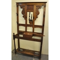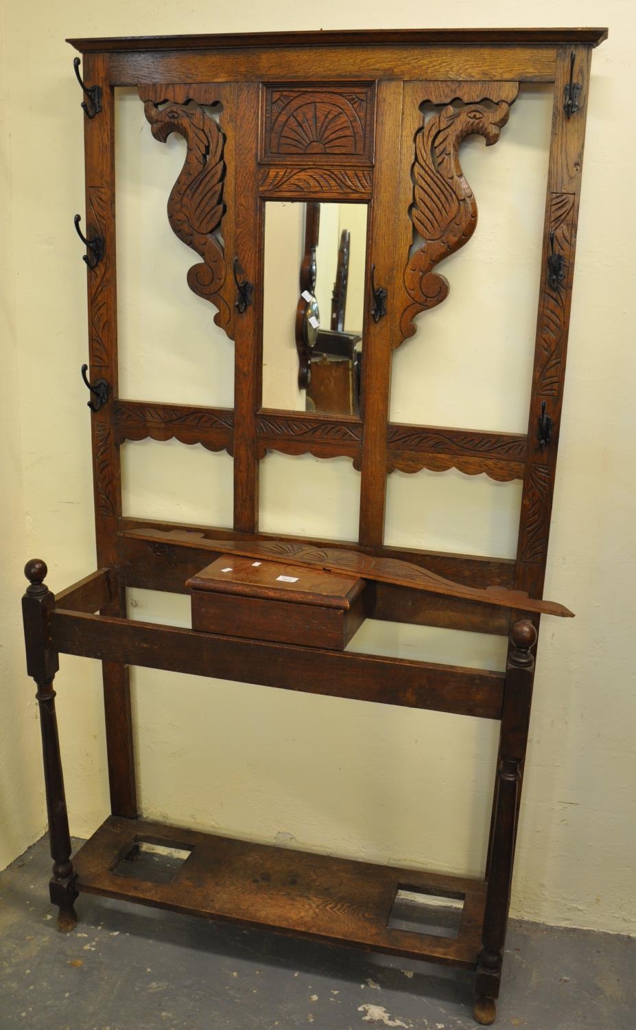 Early 20th Century carved oak mirror back hall stand with dragon decoration.