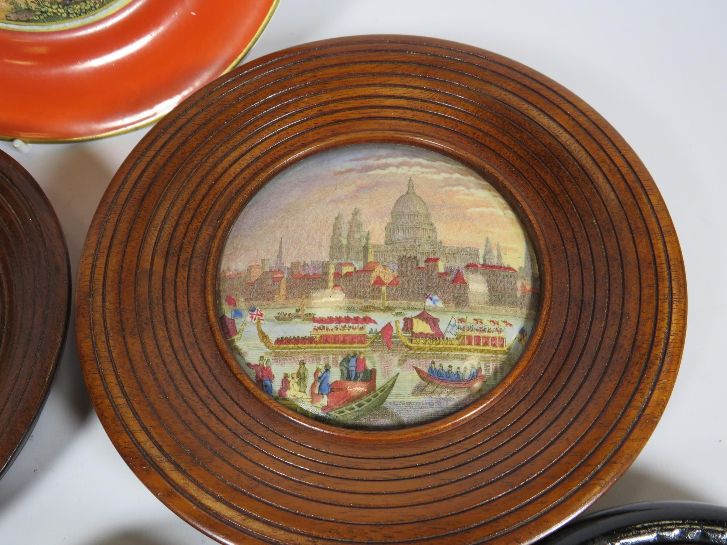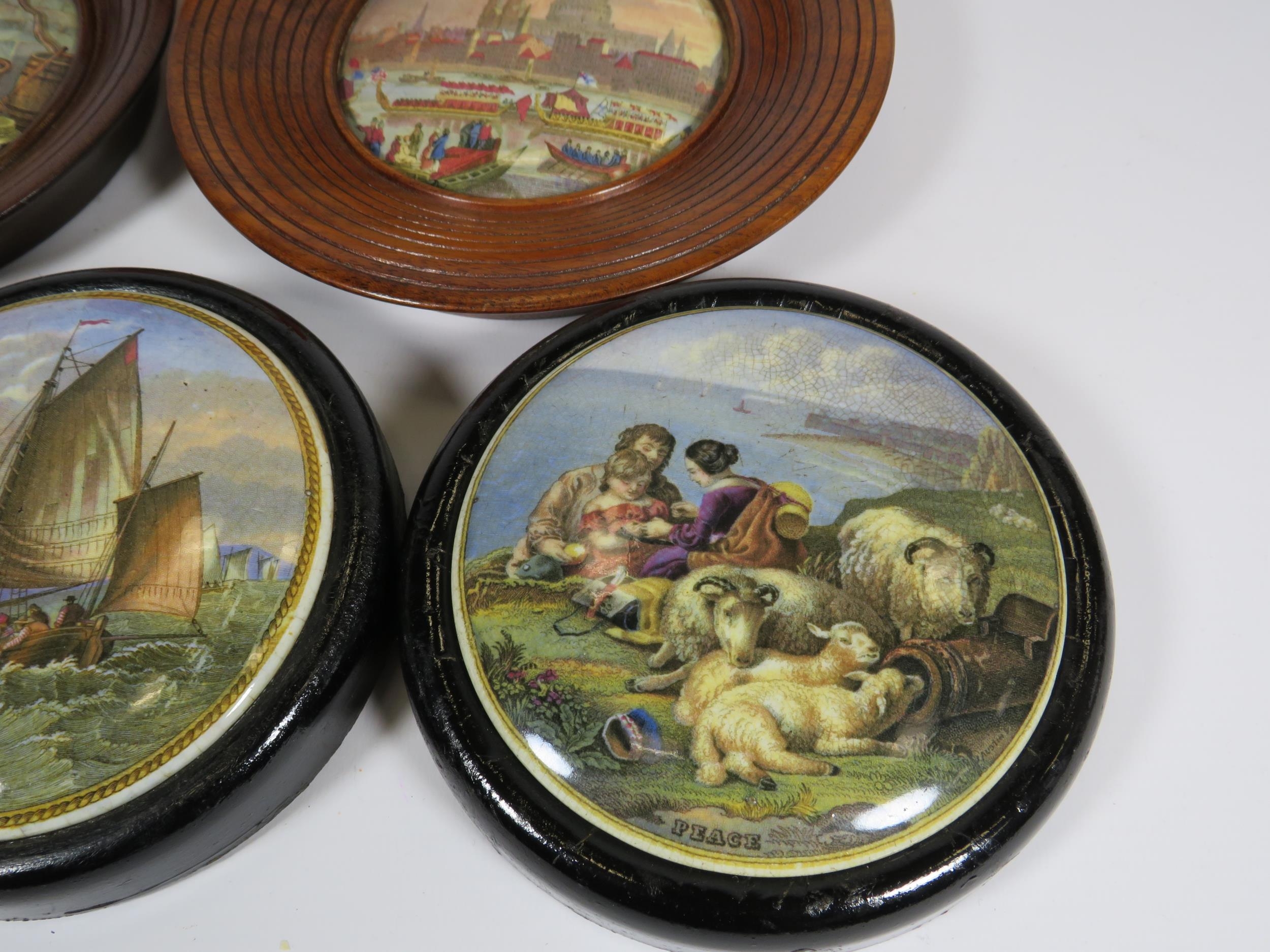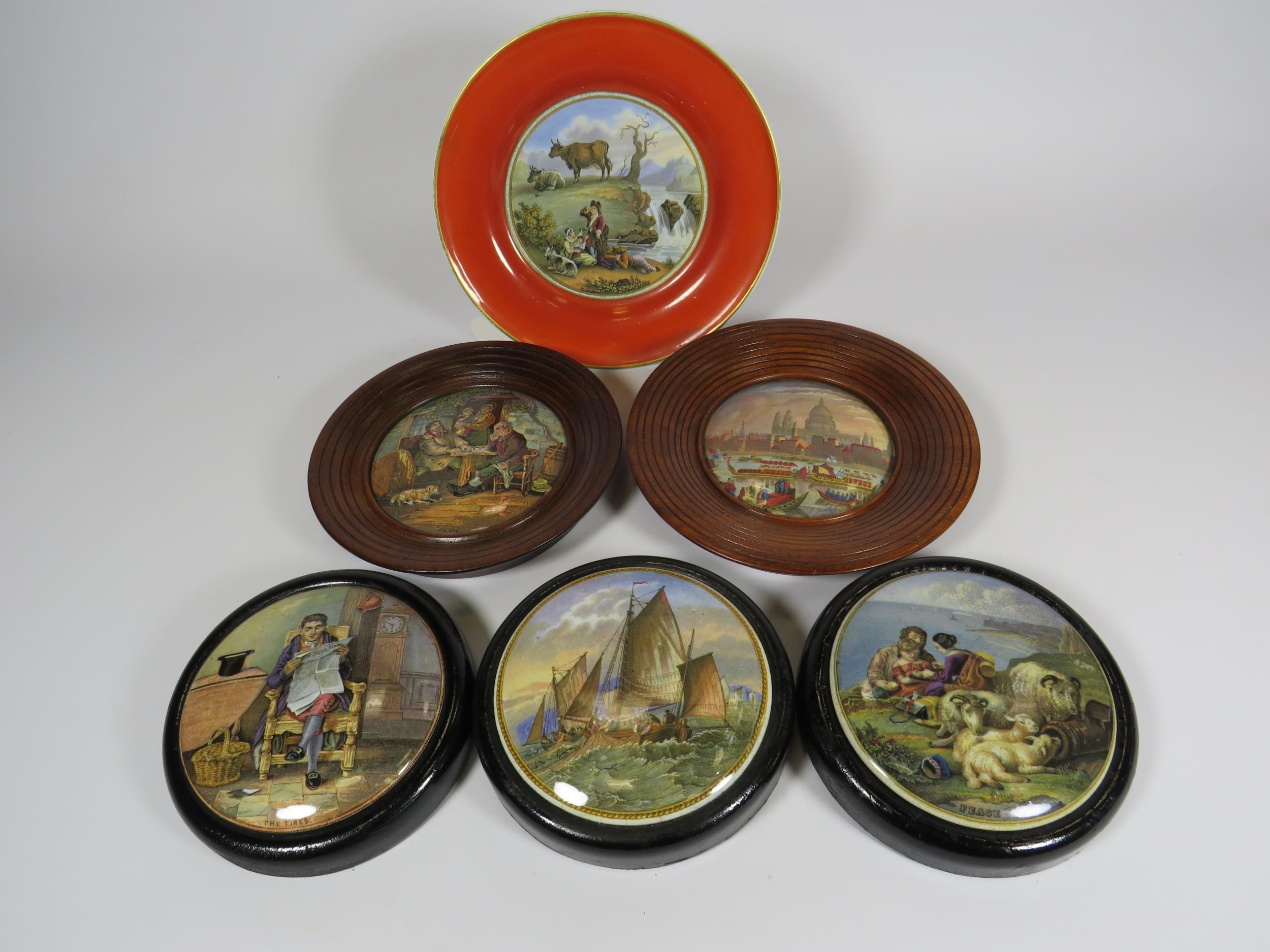 5 Framed Prattware Lids and a plate.