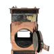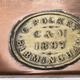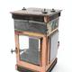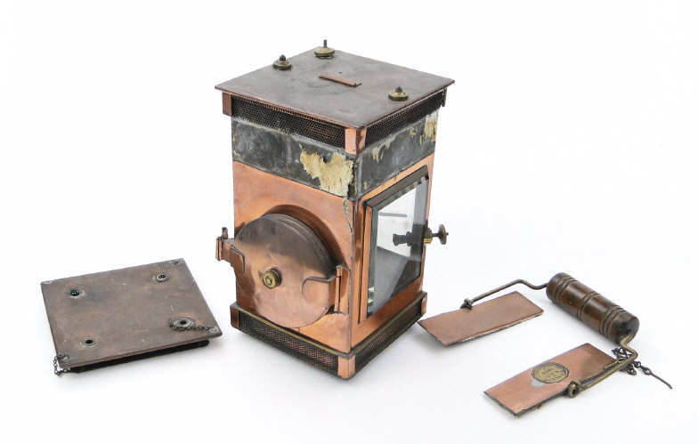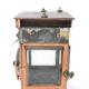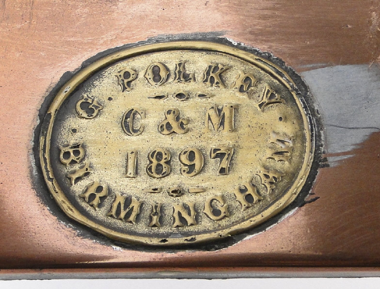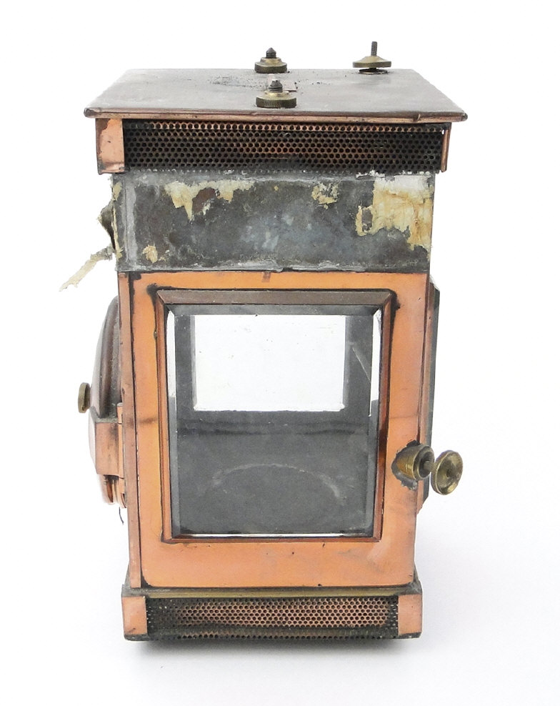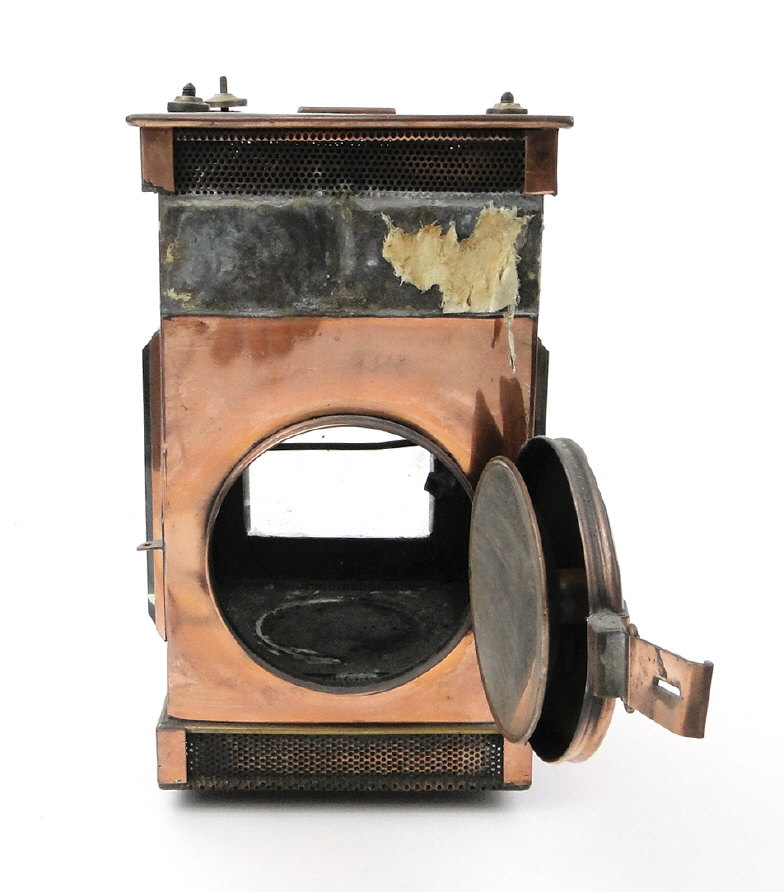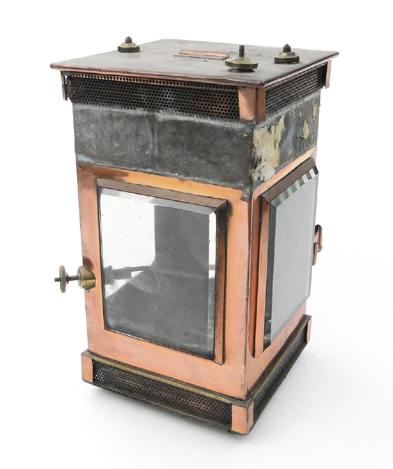 Victorian G. Polkey copper hall lantern with bevelled glass panels and turned wooden handle, approximately 40cm high