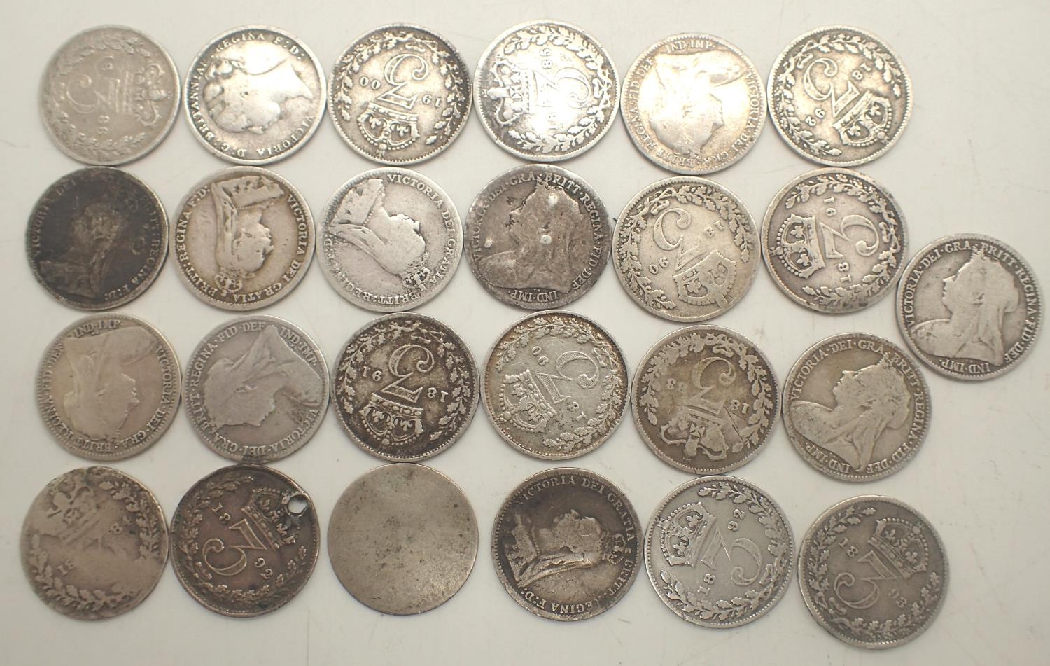Twenty five silver threepences of Queen Victoria, dates 1883-1900, mixed grades. P&P Group 1 (£14+VAT for the first lot and £1+VAT for subsequent lots)