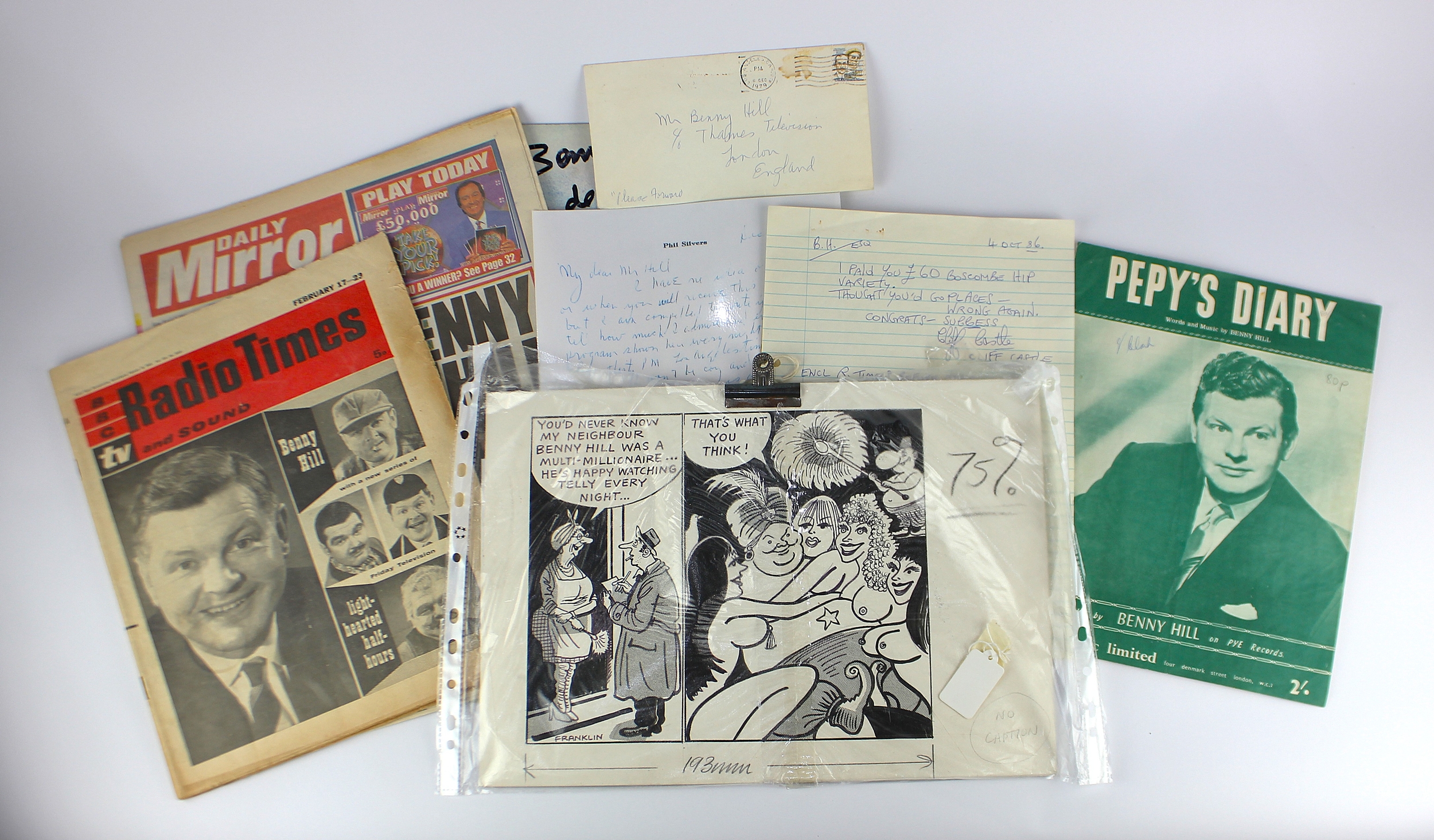 Benny Hill : Stanley Franklin (1930 - 2004), 'Thats What You Think', an original newspaper cartoon, the humourous scene featuring a journalist interviewing his neighbour, and Benny Hill with semi clad women, captioned 'You'd Never Know My Neighbour Benny Hill Was A Multi Millionaire...He's Happily Watching Telly Every Night...' 'Thats What You Think!', ink, pencil and dotted tone overlay on artists board, 36.5cm x 26cm, together with a menu dedicated to Benny Hill by restaurant staff, a copy of the 1962 Radio Times featuring Benny Hill cover, 'Pepy's Diary' Benny Hill sheet music, two tabloid newpapers, and a 'Phil Silvers' letterhead envelope, addressed in blue ink to Benny Hill Thames Television, postmarked December 1979, together with a laminated reproduction copy of the letter (qty)