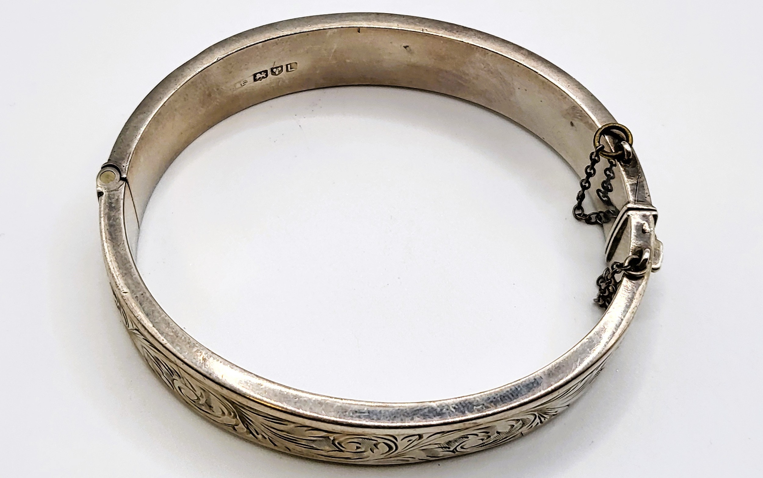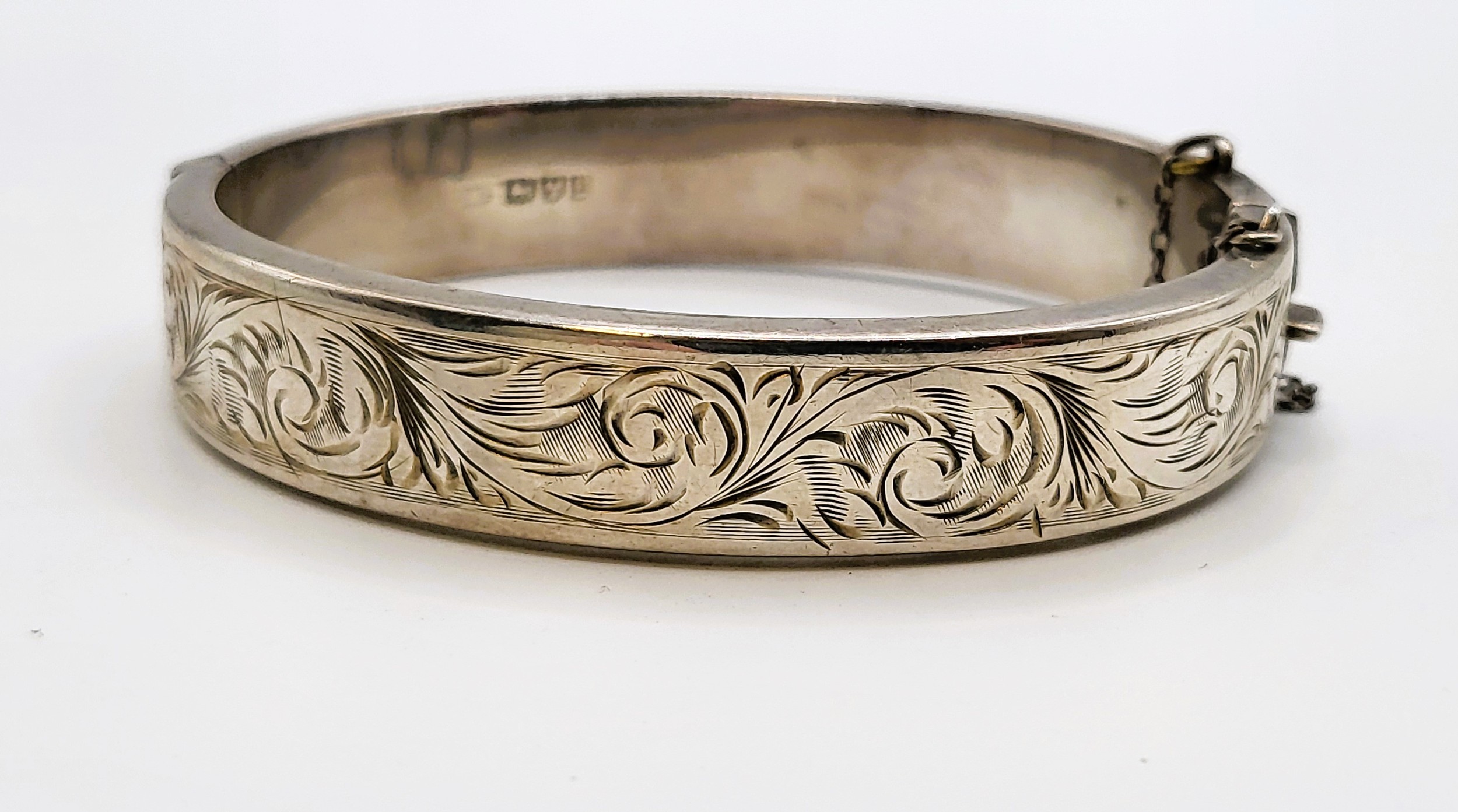 A silver hinged bracelet with safety chain and foliate design on upper half. 20.8gms