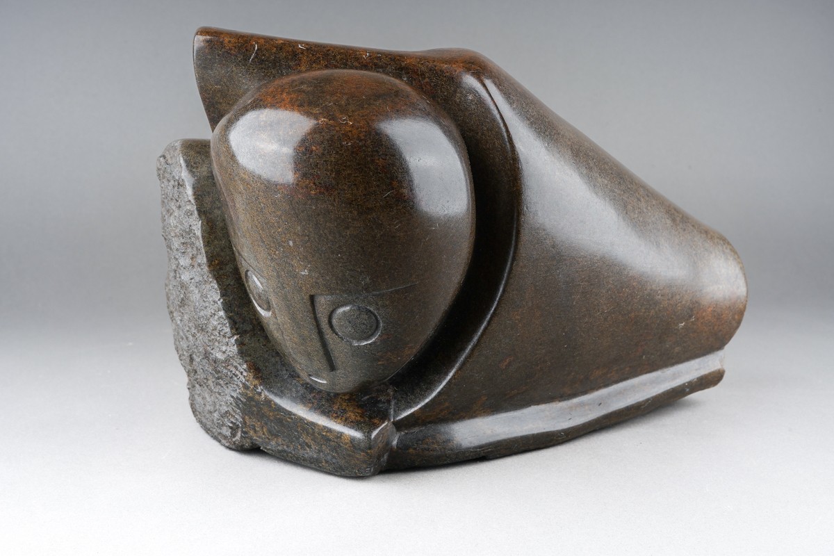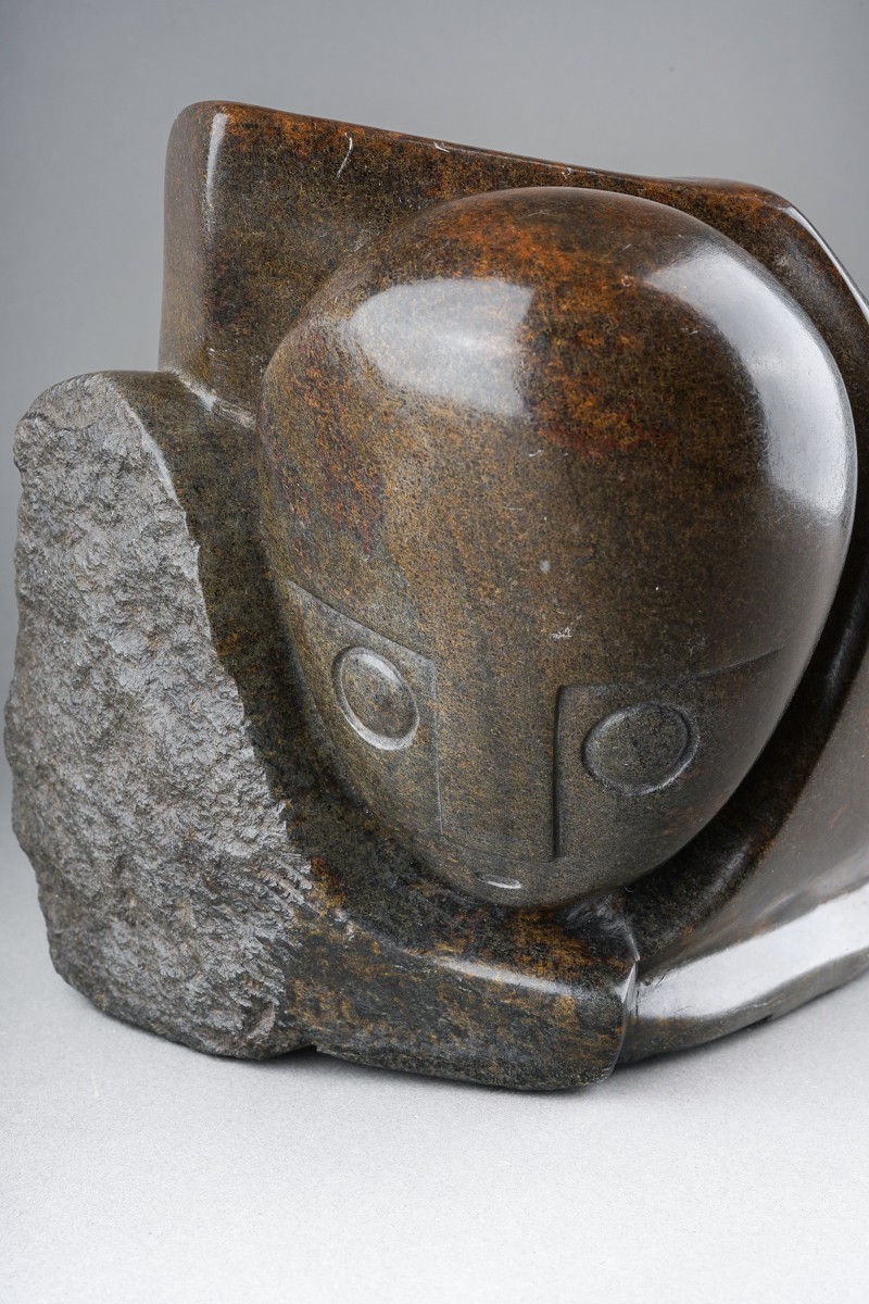 Henry Munyaradzi (Zimbabwean 1931-1998) 'Hiding Bushman', an abstract serpentine sculpture, signed to base and numbered S/11681 around bottom edge, length 26cm x height 18cm approx., comes with certificate of authenticity bearing reference Sn11691, comes with two photographs (2)