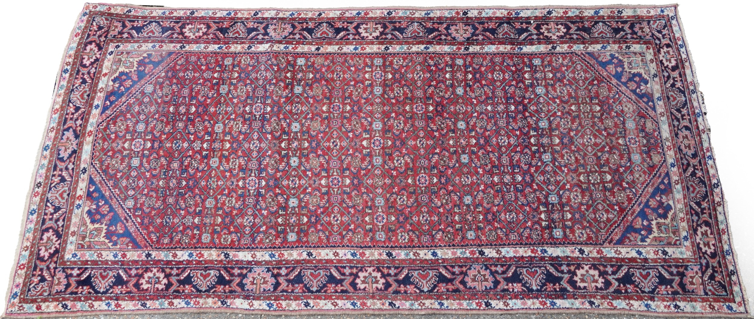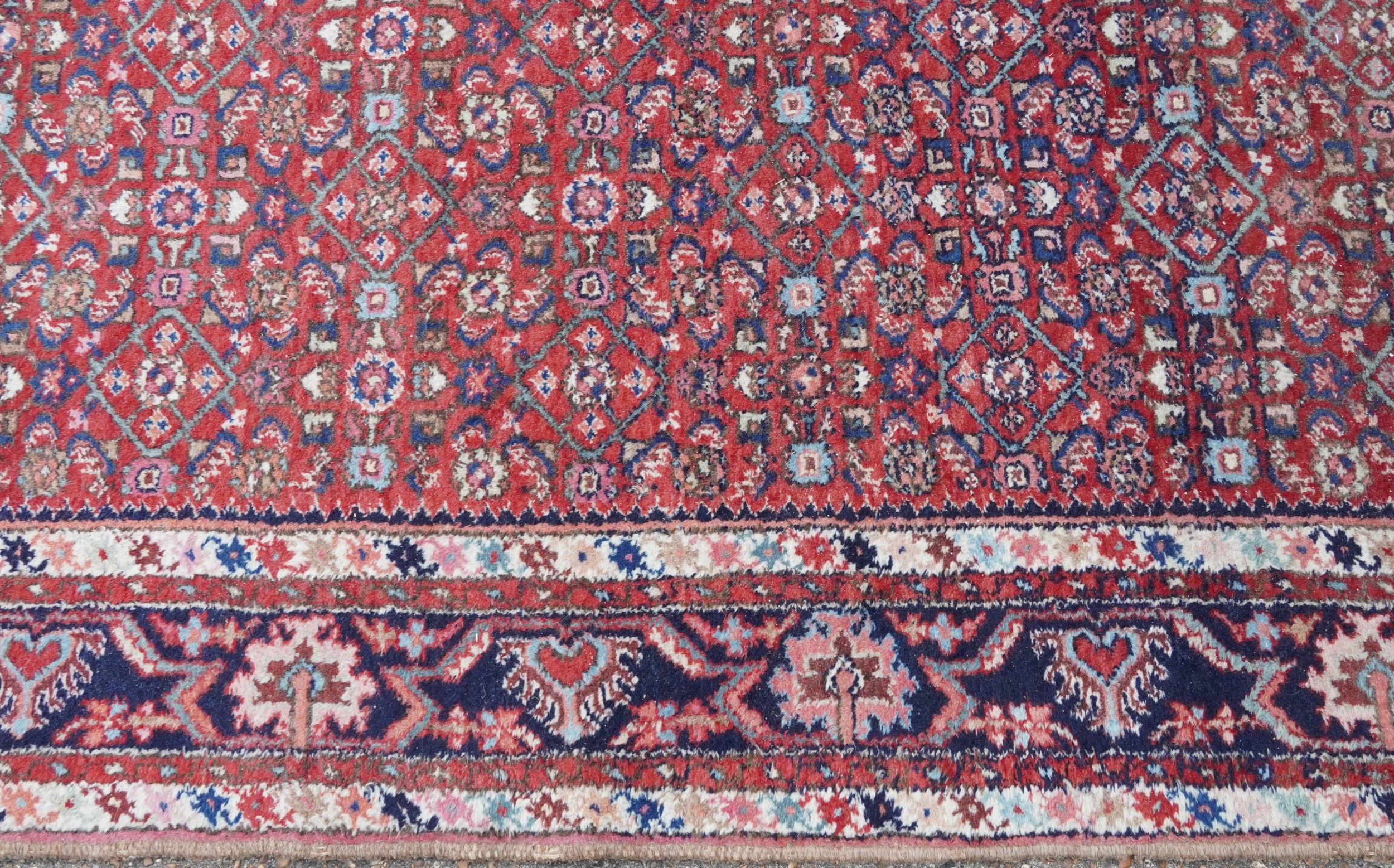 A Persian Sarouk gallery runner, 20th century, the red field with an allover flower head design within a complementary border, 316cm x 160cm.