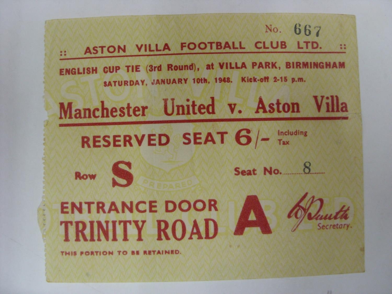 ASTON VILLA, 1947/1948, versus Manchester United [FA Cup 3rd Round], a used Football Ticket for the game played 10/01/1948 (some nicks and minor tears to edges, folded). Estimate: £30/£40 - Opening Bid: £20
