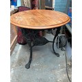 A heavy cast iron pub table by George Allison & Sons, Sheffield, the legs with the King’s crowned head (Edward VII?) with oak top. 76cm dia