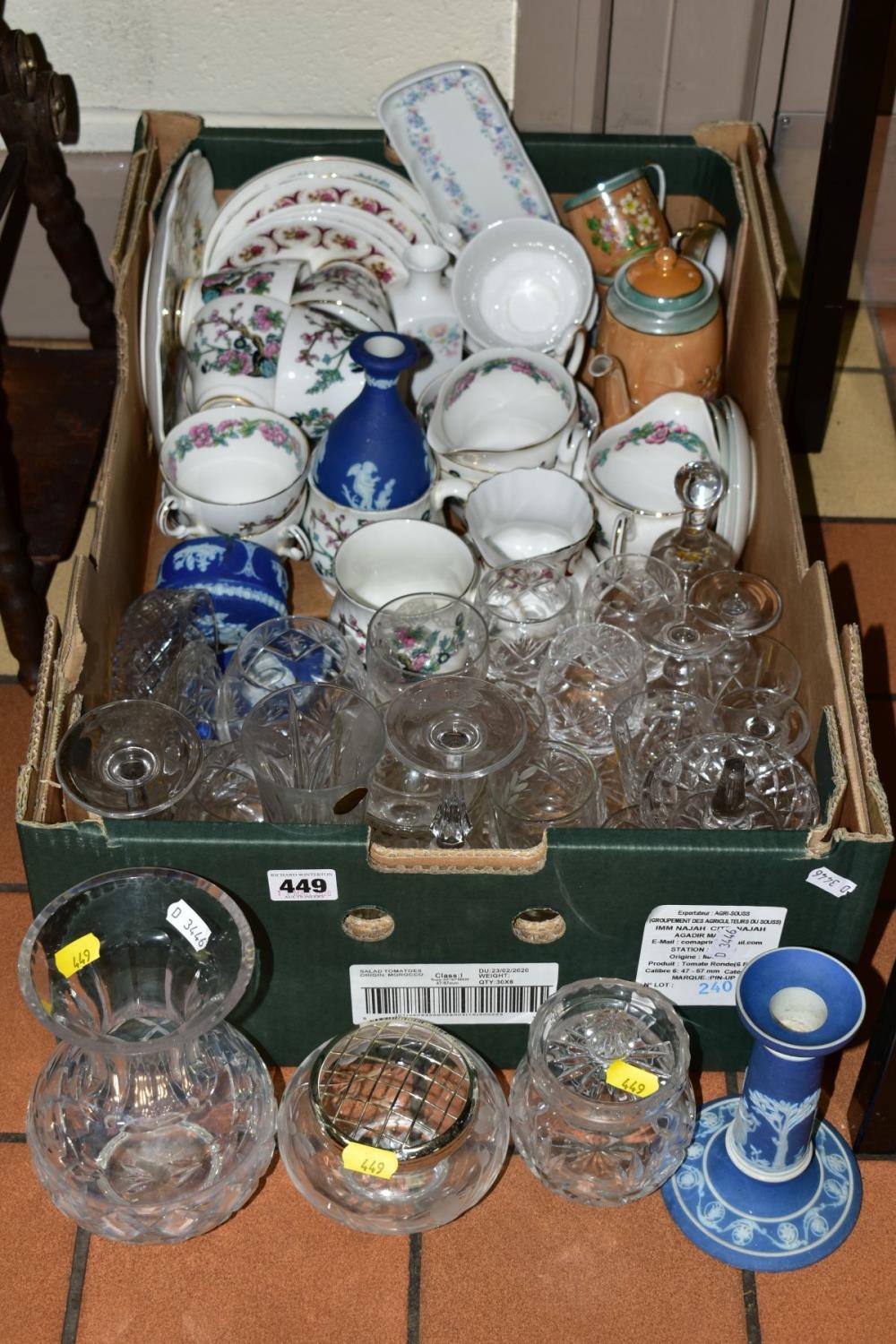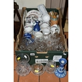 A BOX AND LOOSE OF CERAMICS AND GLASSWARES, to include Dartington cut glass vase, Stuart crystal posy bowl, Wedgwood jasperware and 'angela' trinkets (sd), part teawares etc