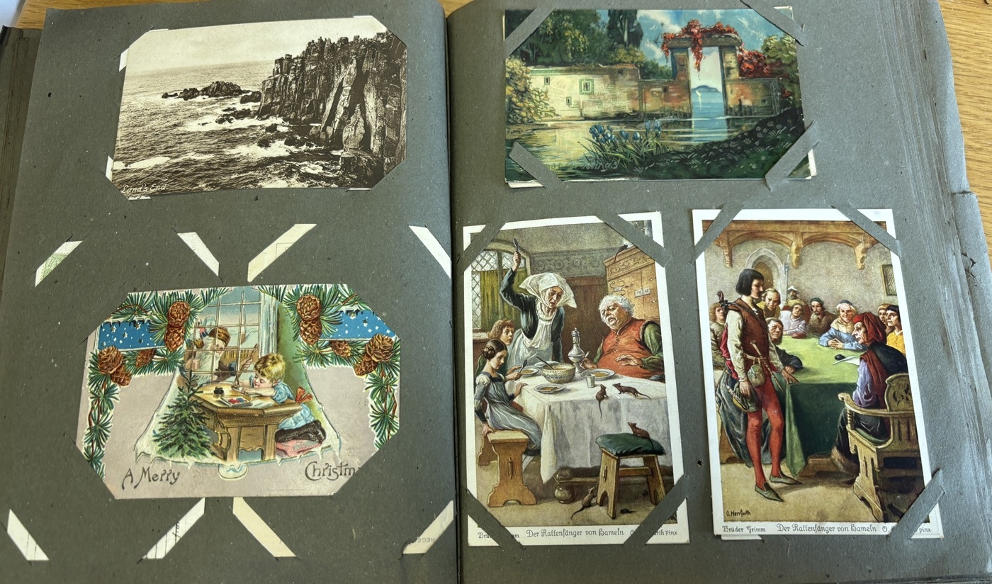 Misc. coln. in 8 albums and loose, incl. ptd, R.P., artist drawn with comic, coastal scenes, flowers, greetings, etc. Plus ranges of stamps incl. mint issues, used GB and cigarette cards. (B)