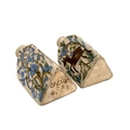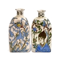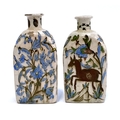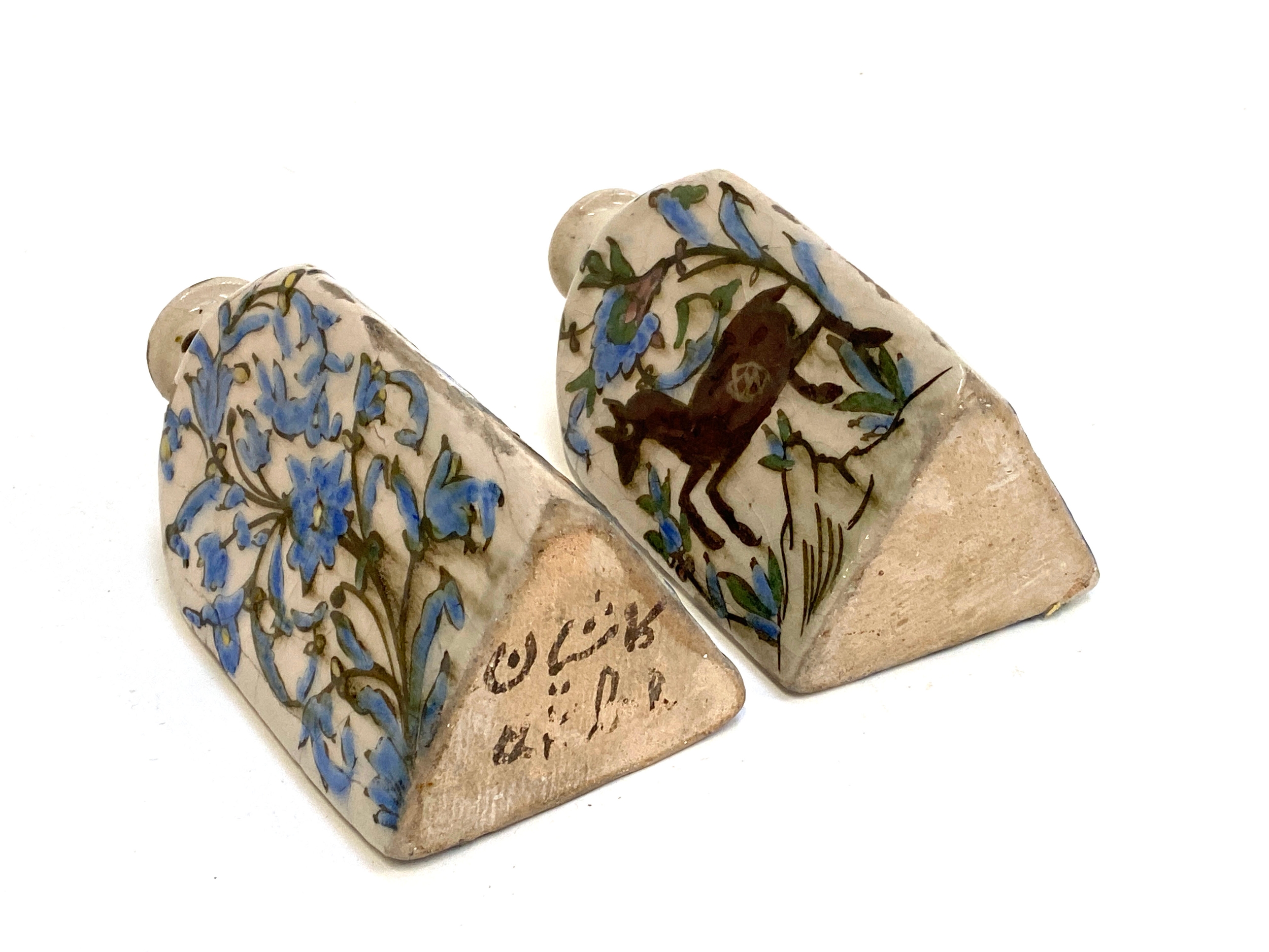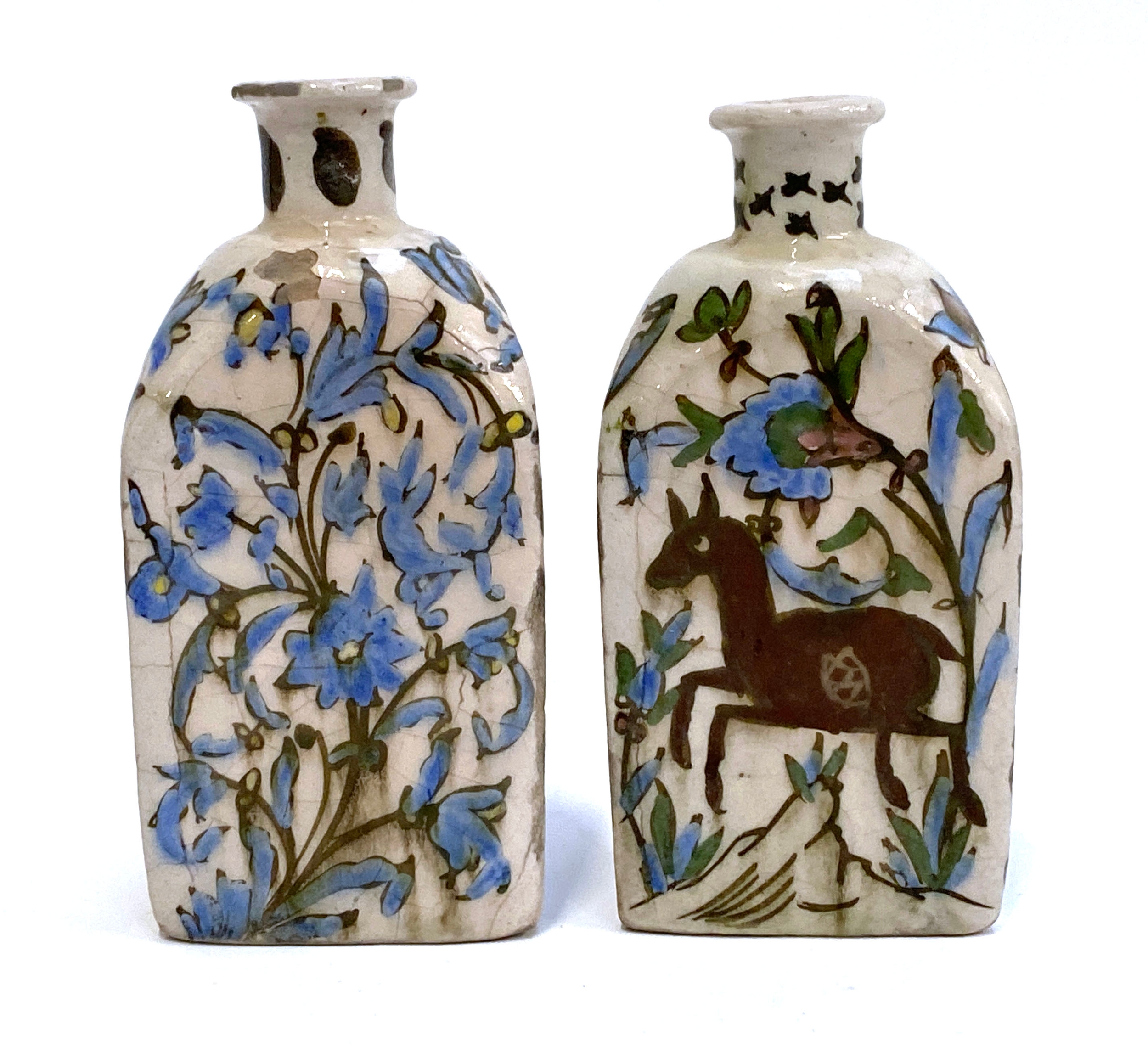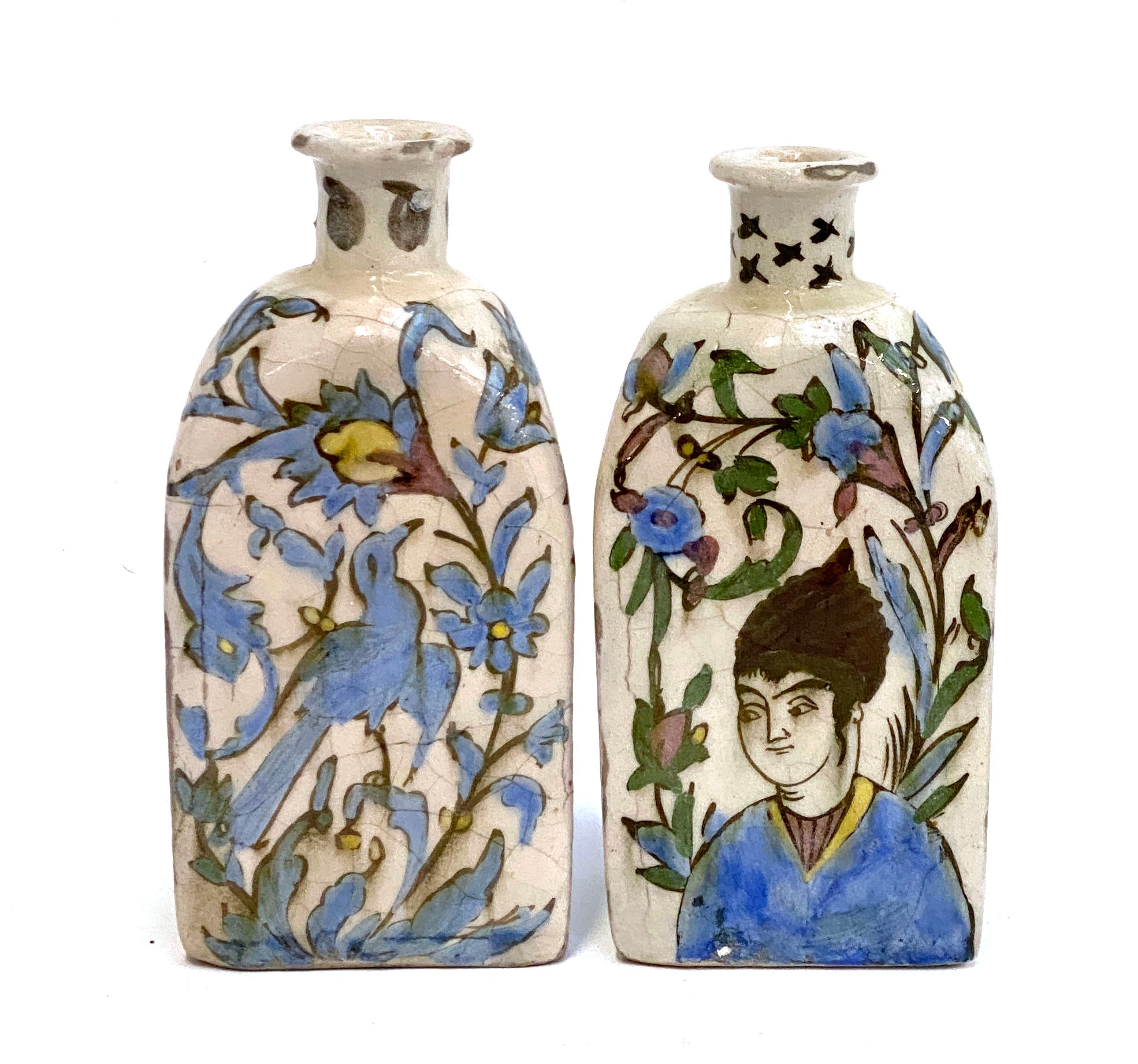 A pair of Persian Qajar Iznik style tri-sided pottery vases, one decorated with a youth and horse, the other with bird amongst flowers, 19cm high, one signed to base