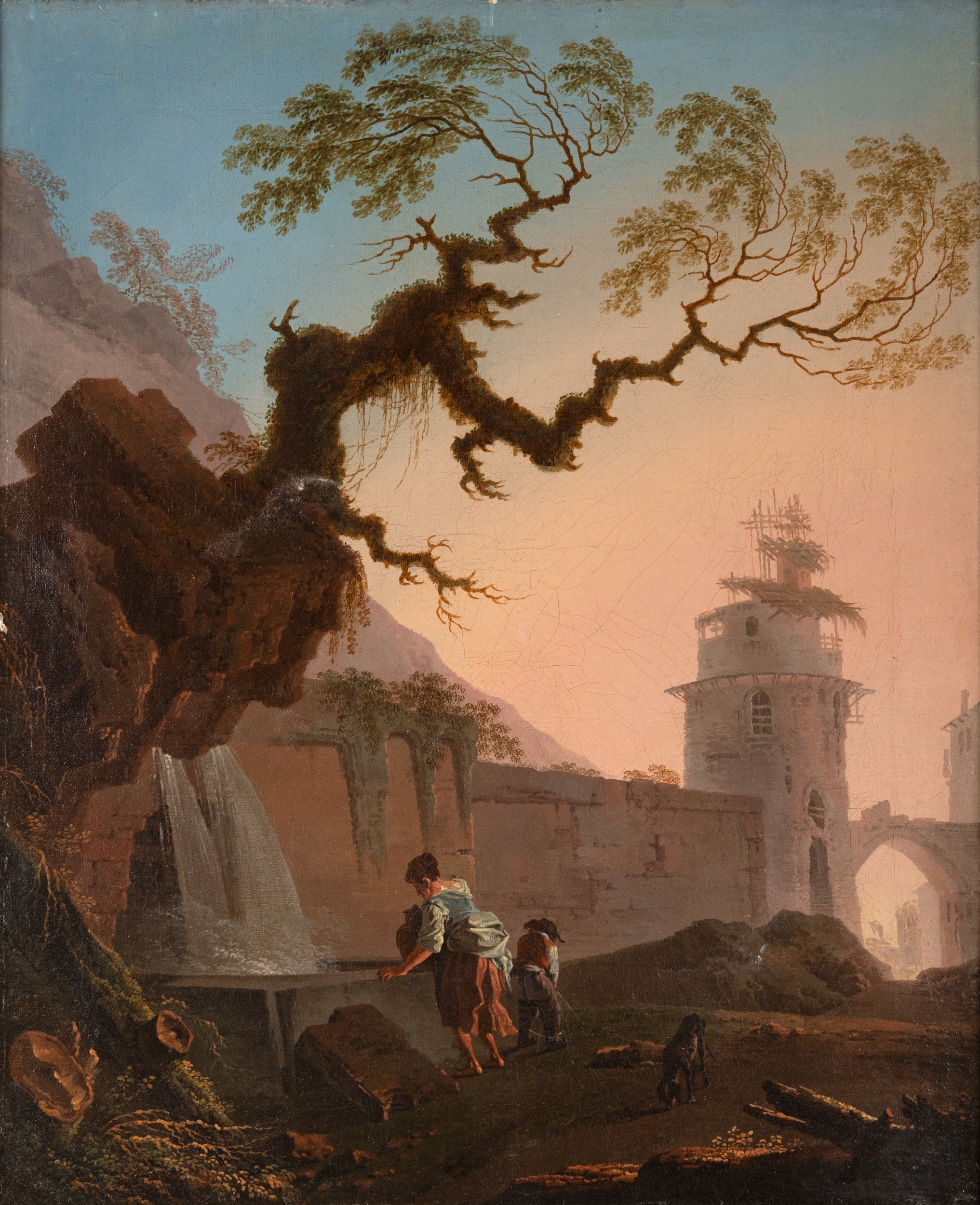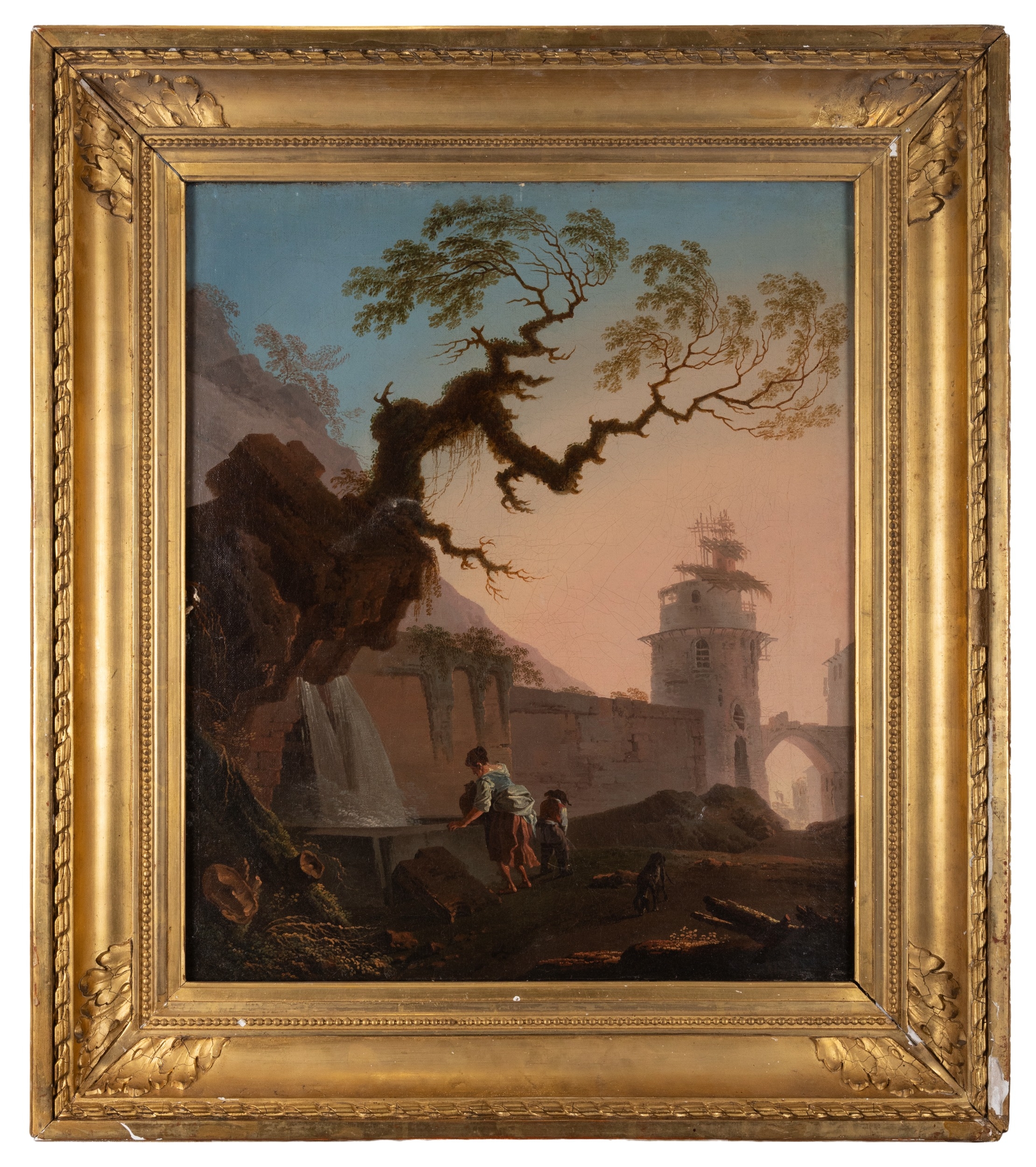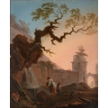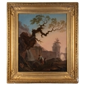 ATTRIBUTED TO JEAN-BAPTISTE PILLEMENT Figures Drawing Water from a Well Outside a Walled Town Oil on canvas laid on board, 55.2 x 46.5cm