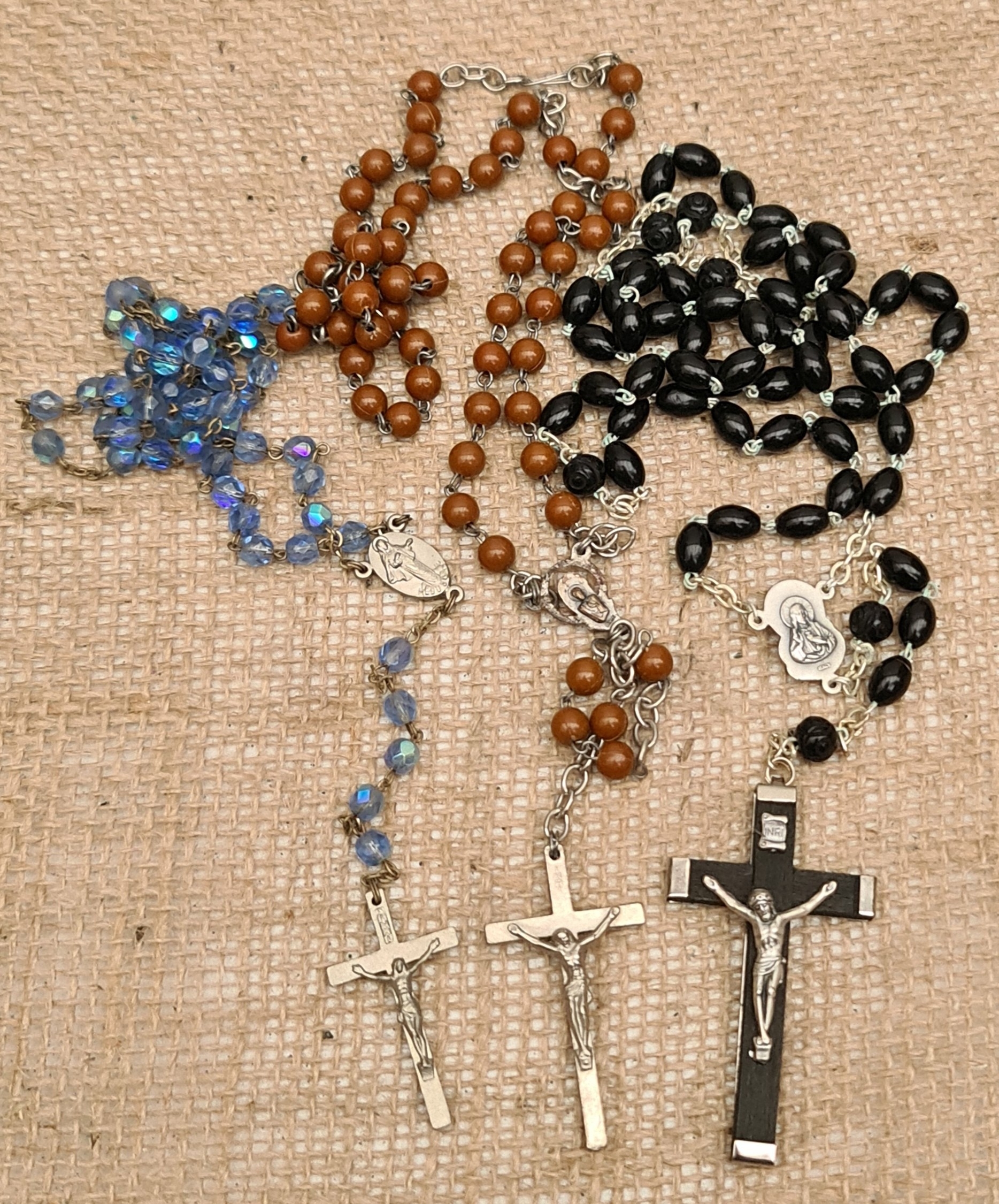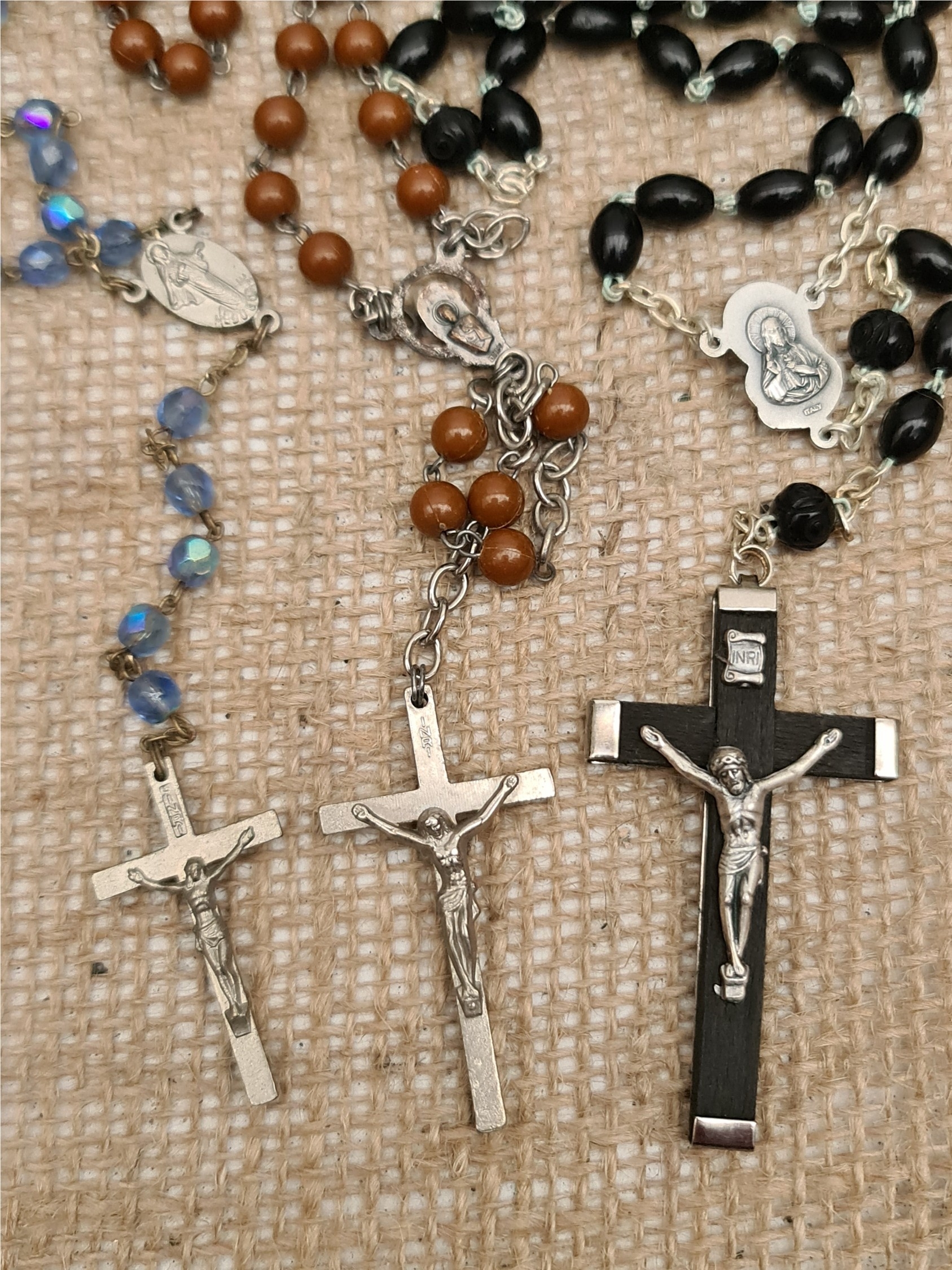 Vintage 3 x Crucifix Rosary Chains. The largest Crucifix is 5cm long. Shipping is available. Please ask for a quote before bidding. Where possible we combine shipping costs. Remember, if you are the highest bidder above reserve on this Lot you have bought the item and are legally responsible for the item. Viewing is recommended in either person or via video link. Contact us to arrange.