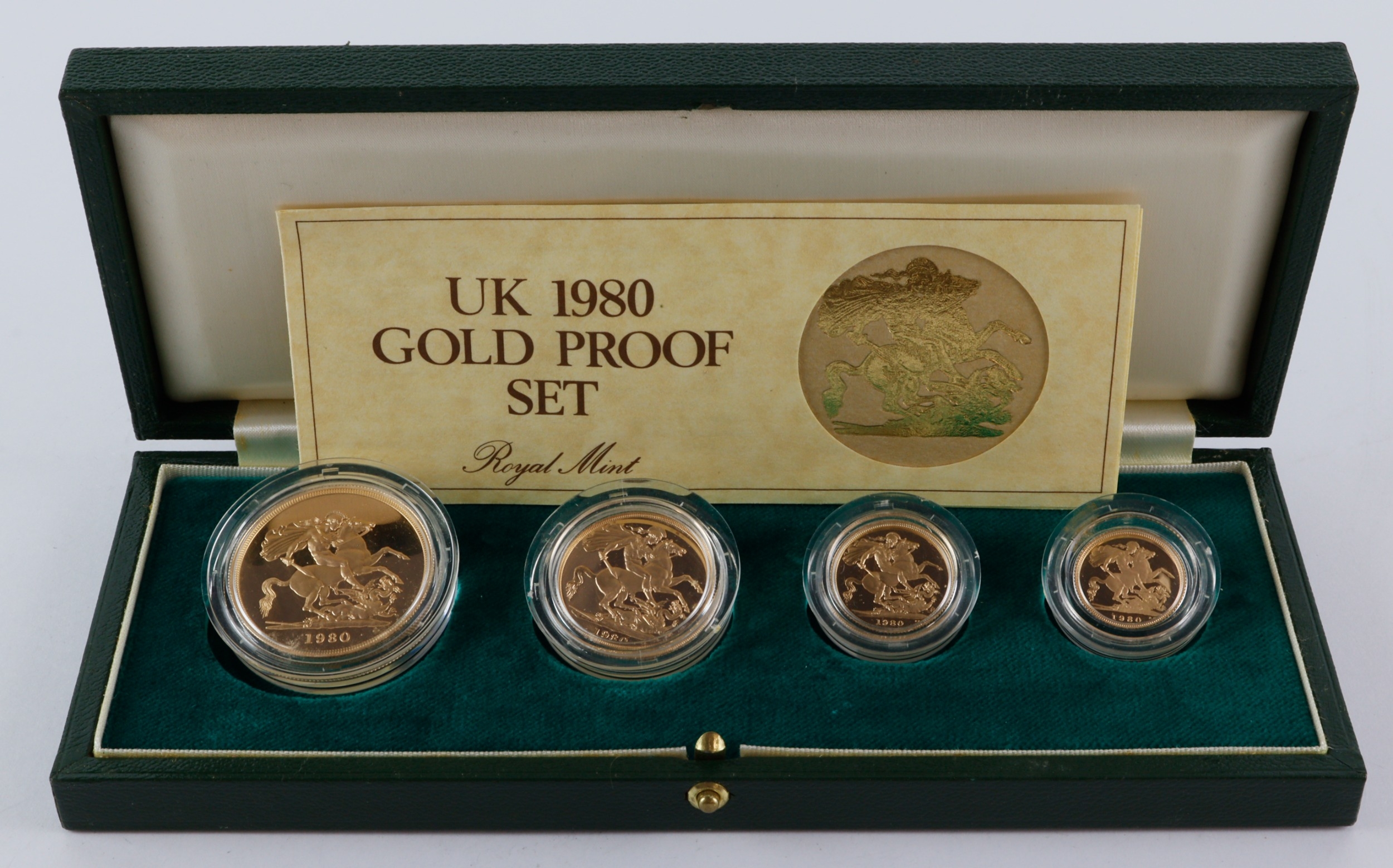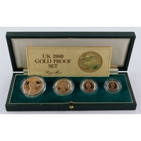 Four coin set 1980 (Five Pounds, Two Pounds, Sovereign & Half Sovereign). Proof FDC boxed as issued
