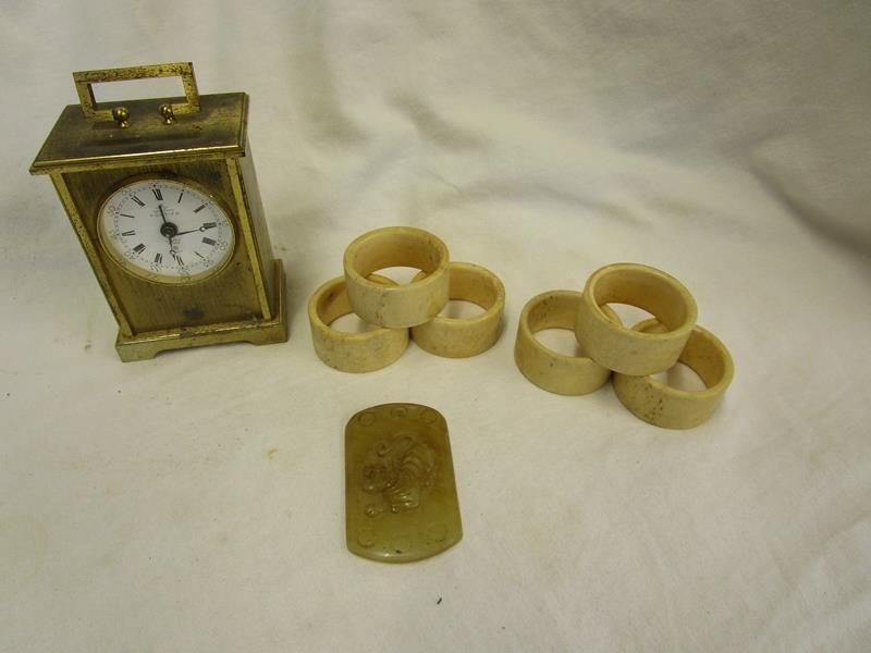 Small carriage clock, set of six ivory napkin rings and onyx cartouche