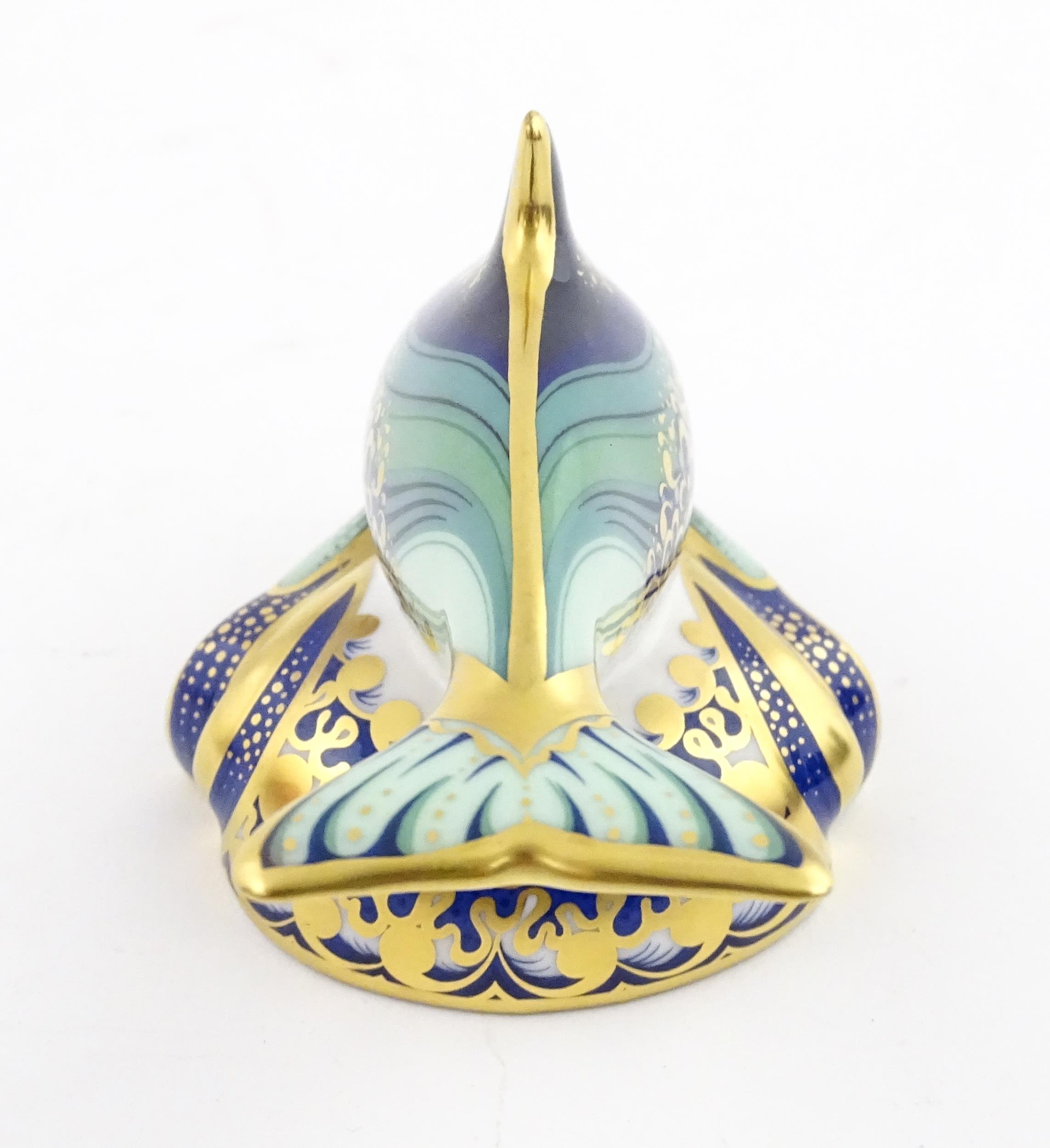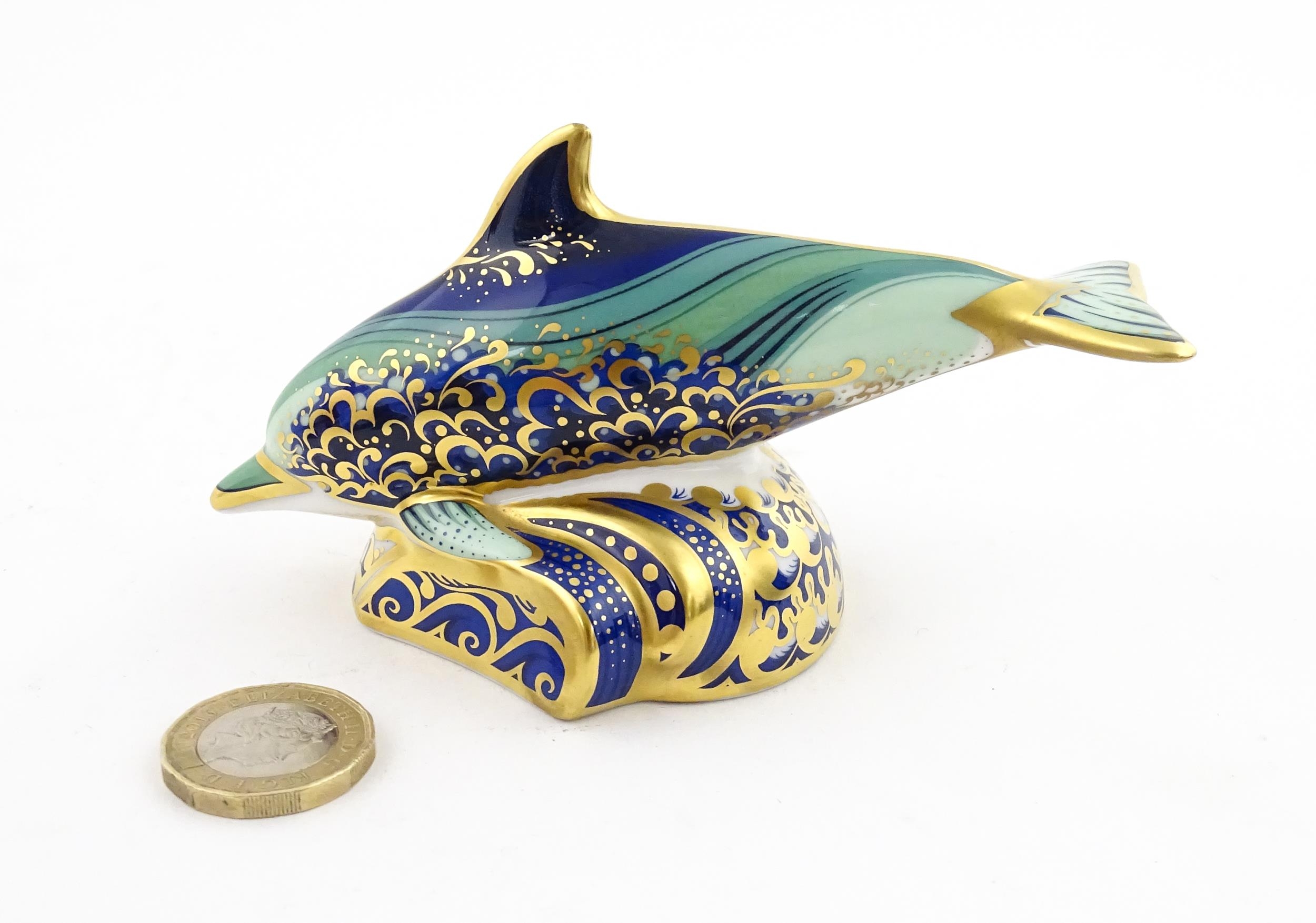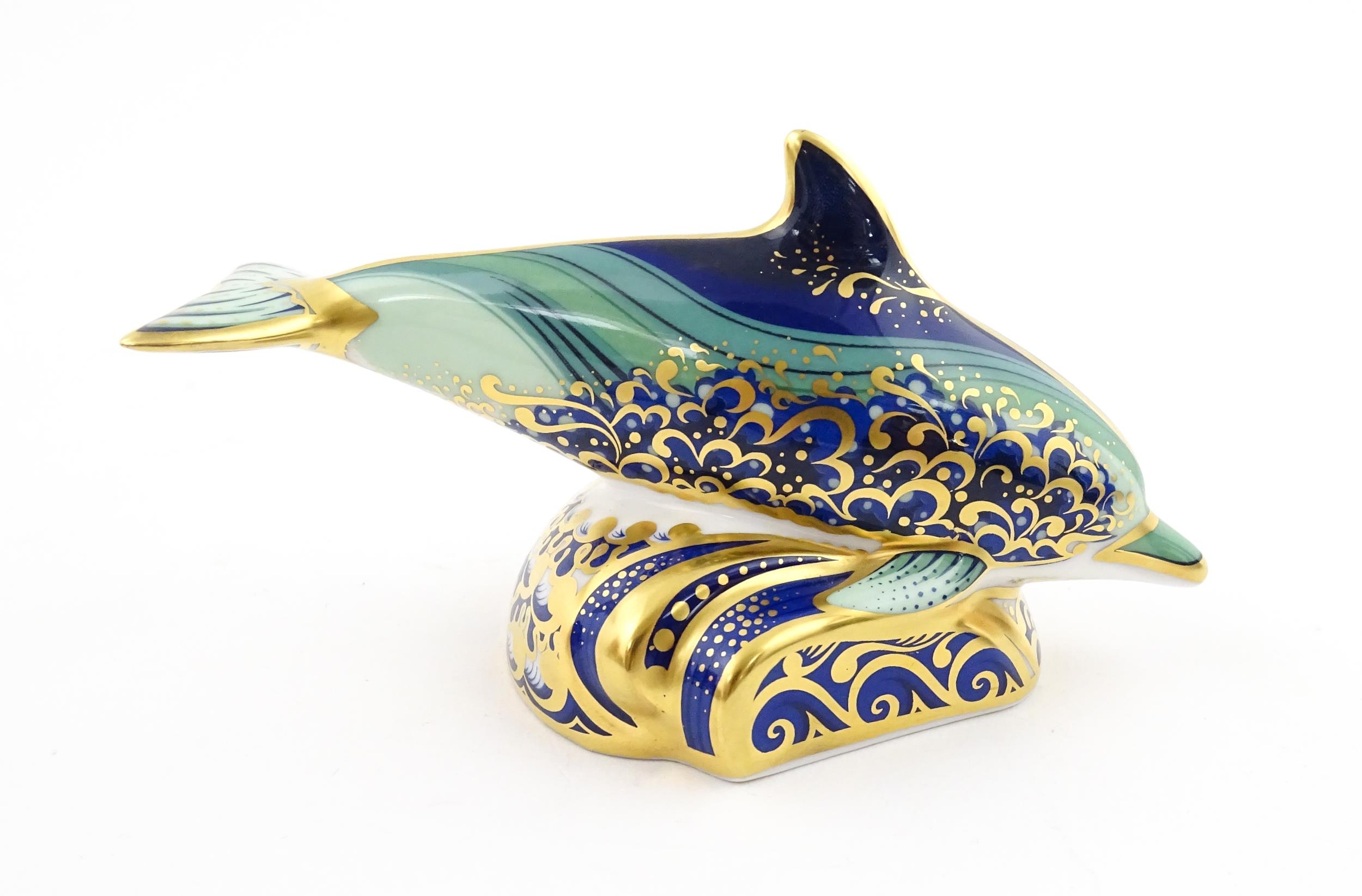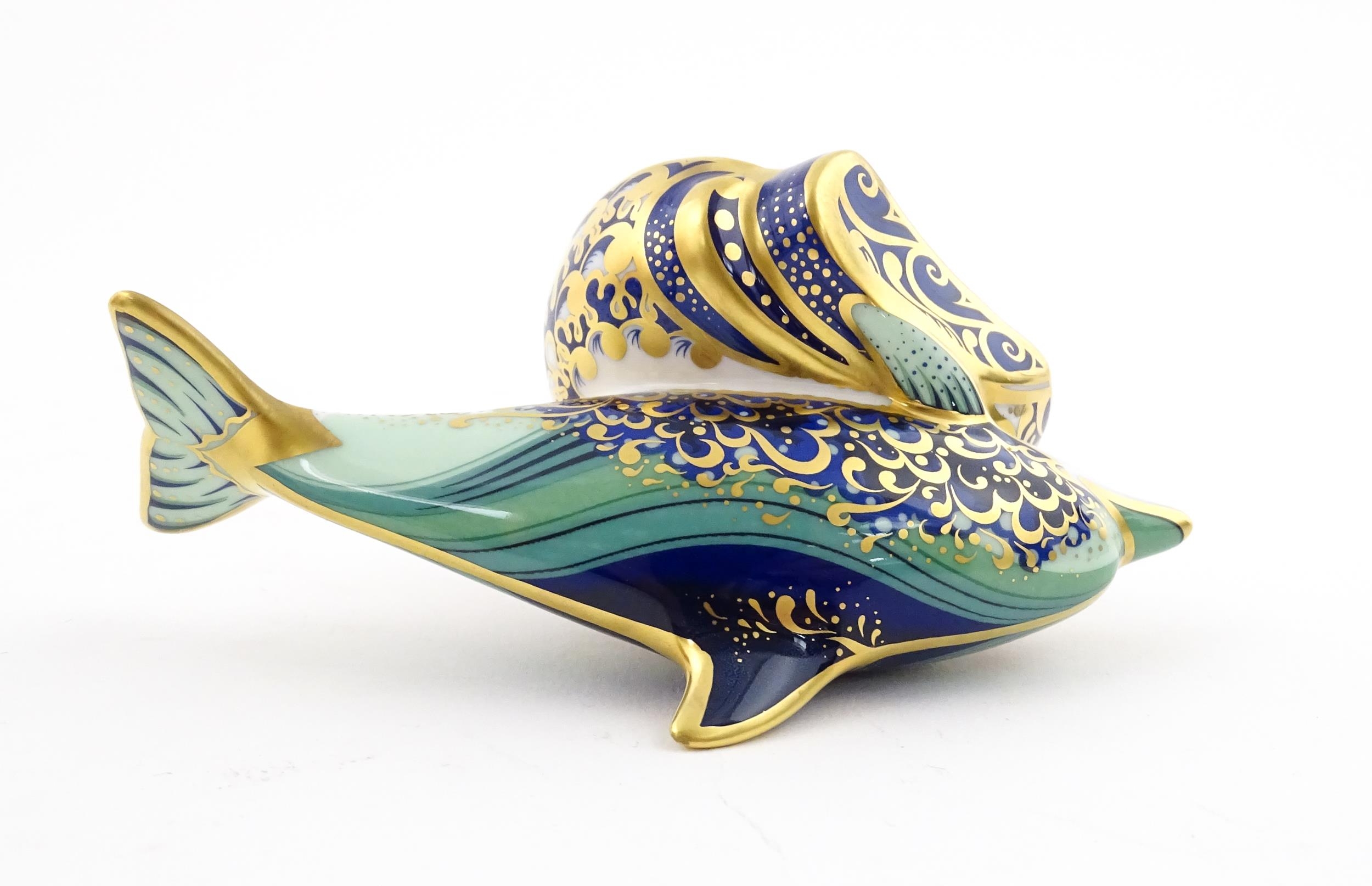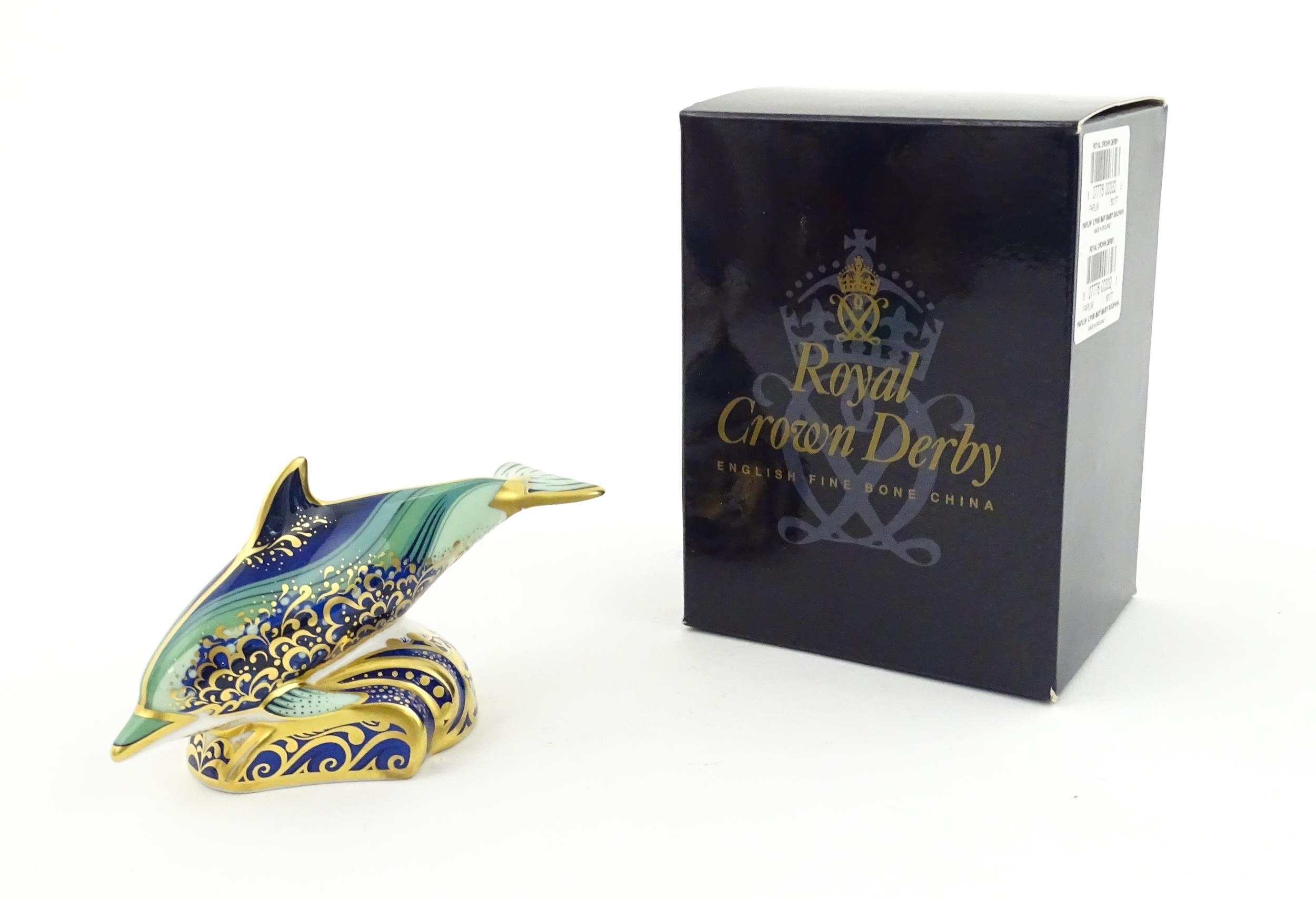 A Royal Crown Derby paperweight modelled as a Lyme Bay Baby Dolphin. A signature edition of 1500 for Govier's of Sidmouth. Boxed. Approx. 4 3/4" long