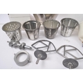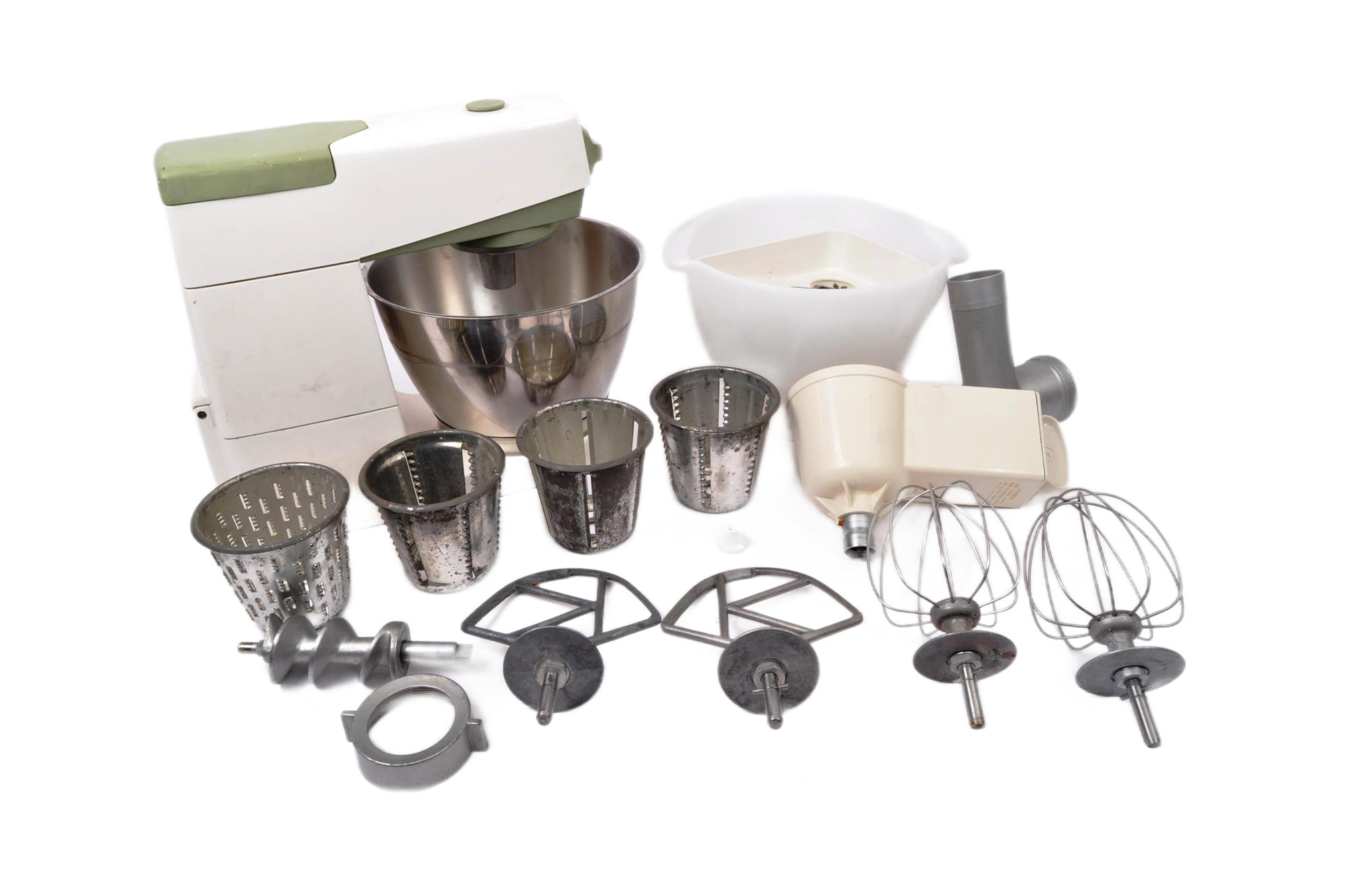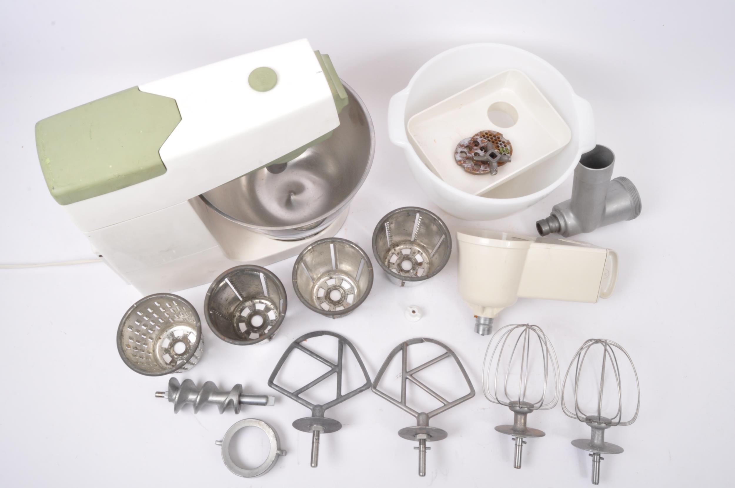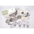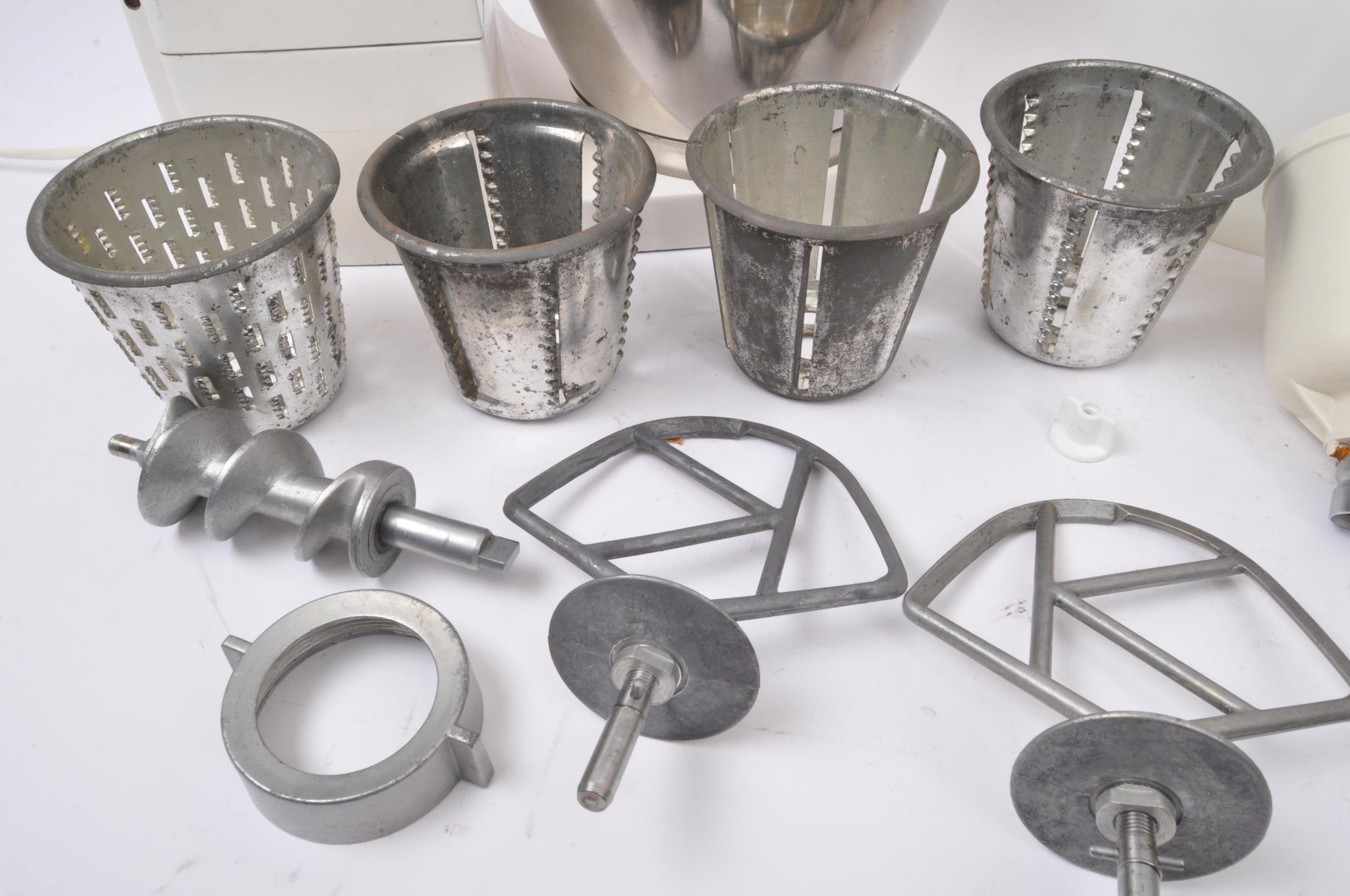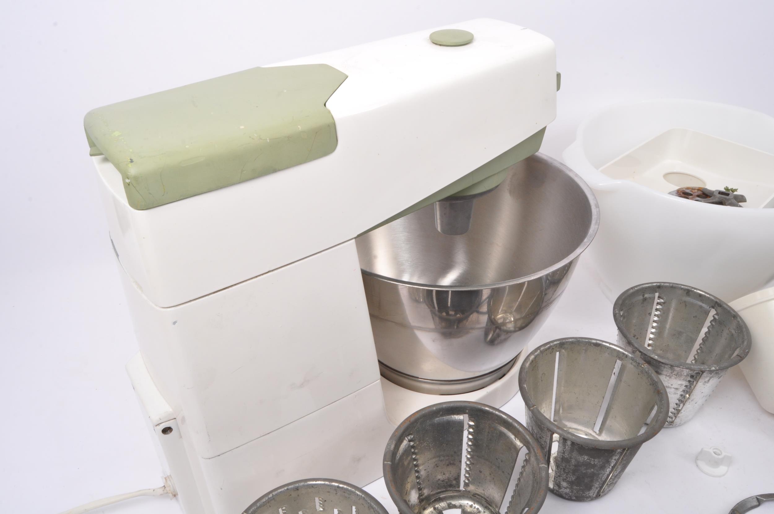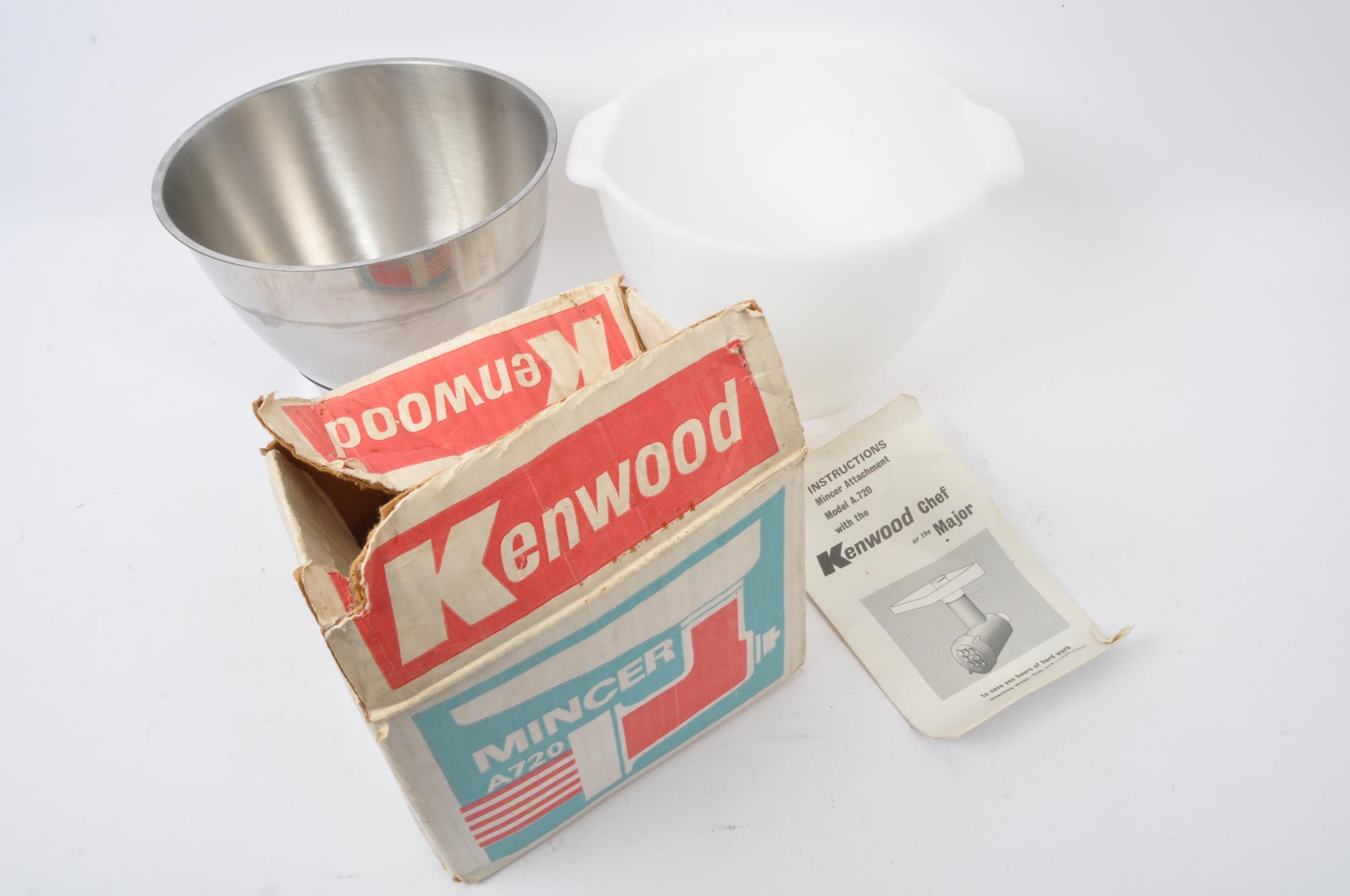Kenwood food mixer A701A - A retro vintage mid 20th Century mix kitchen appliance for baking and cooking, comes with attachments some in original boxes. Dough hook and mincer A720, with large mixing bowl. Measures approx. 30cm tall 33cm long. Untested, plug removed.