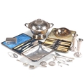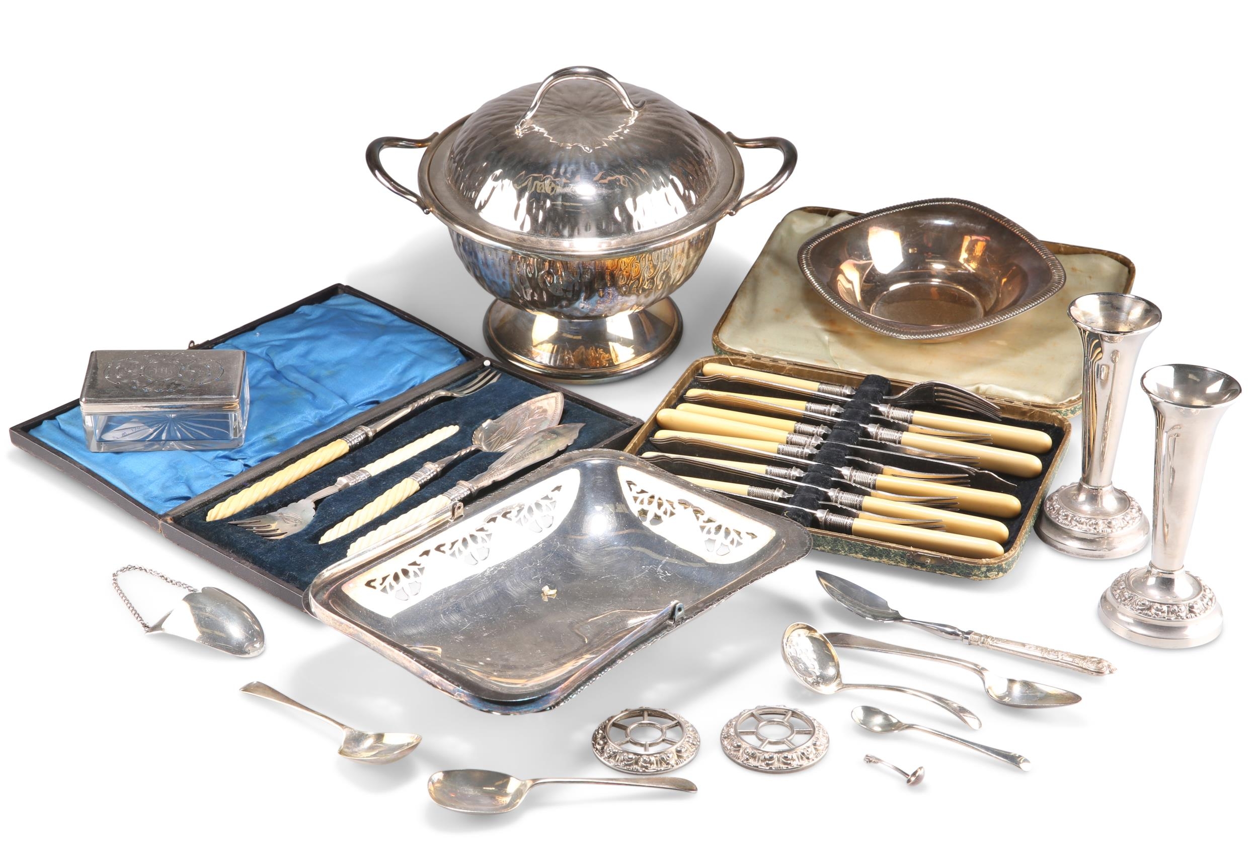 A GROUP OF SILVER-PLATE, including a two-handled covered bowl, bud vases, etc. (Qty) Bowl 26cm across handles