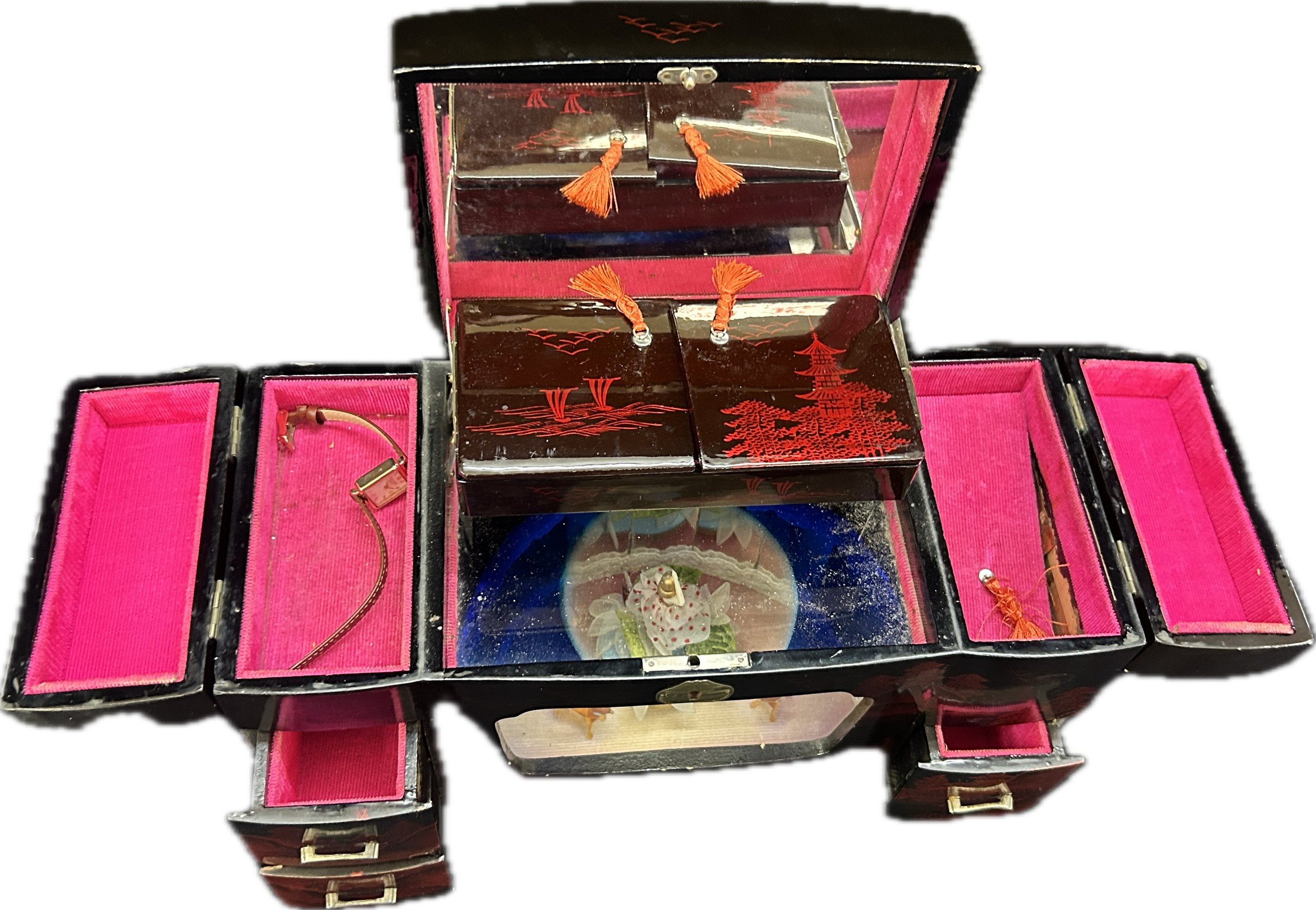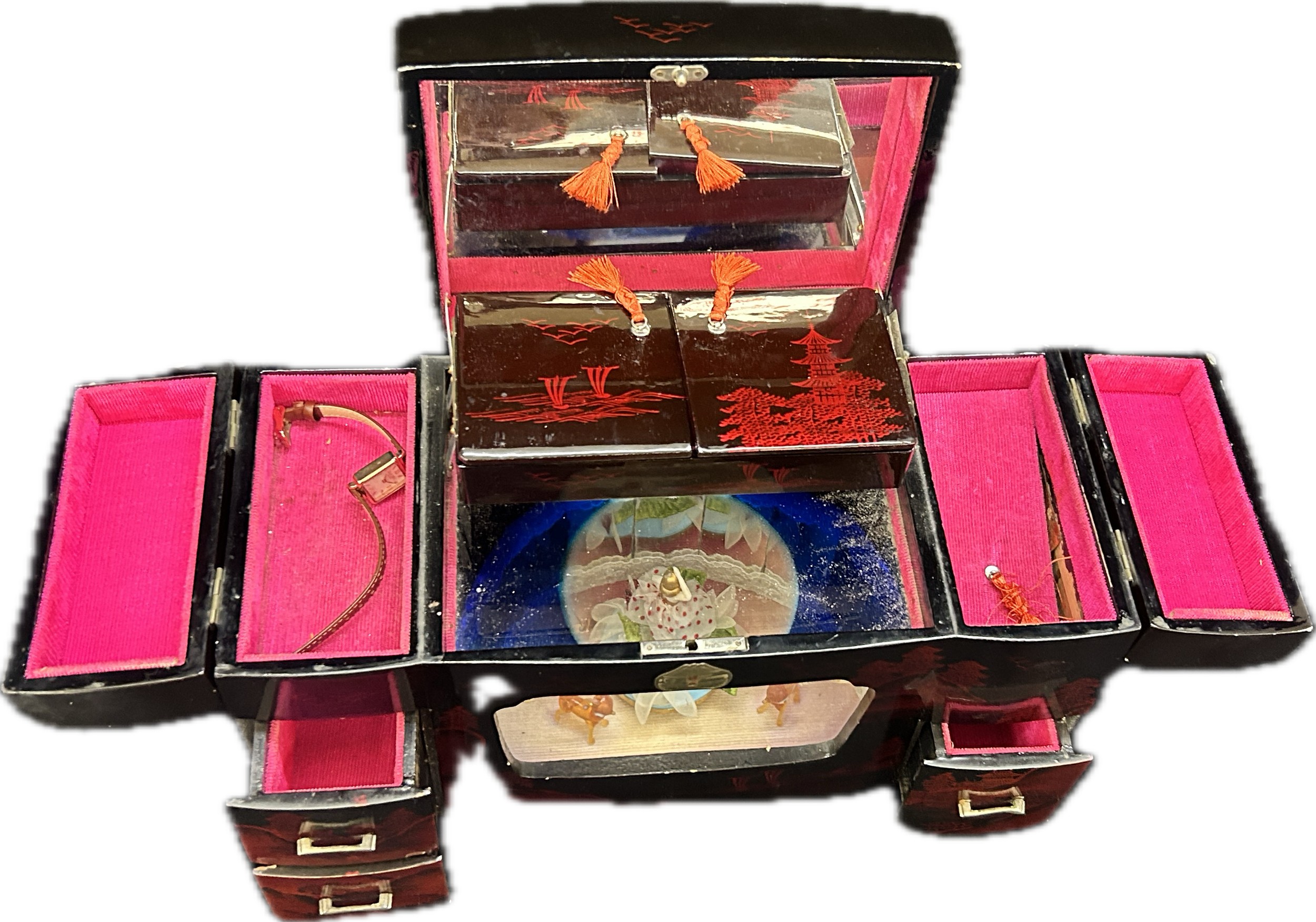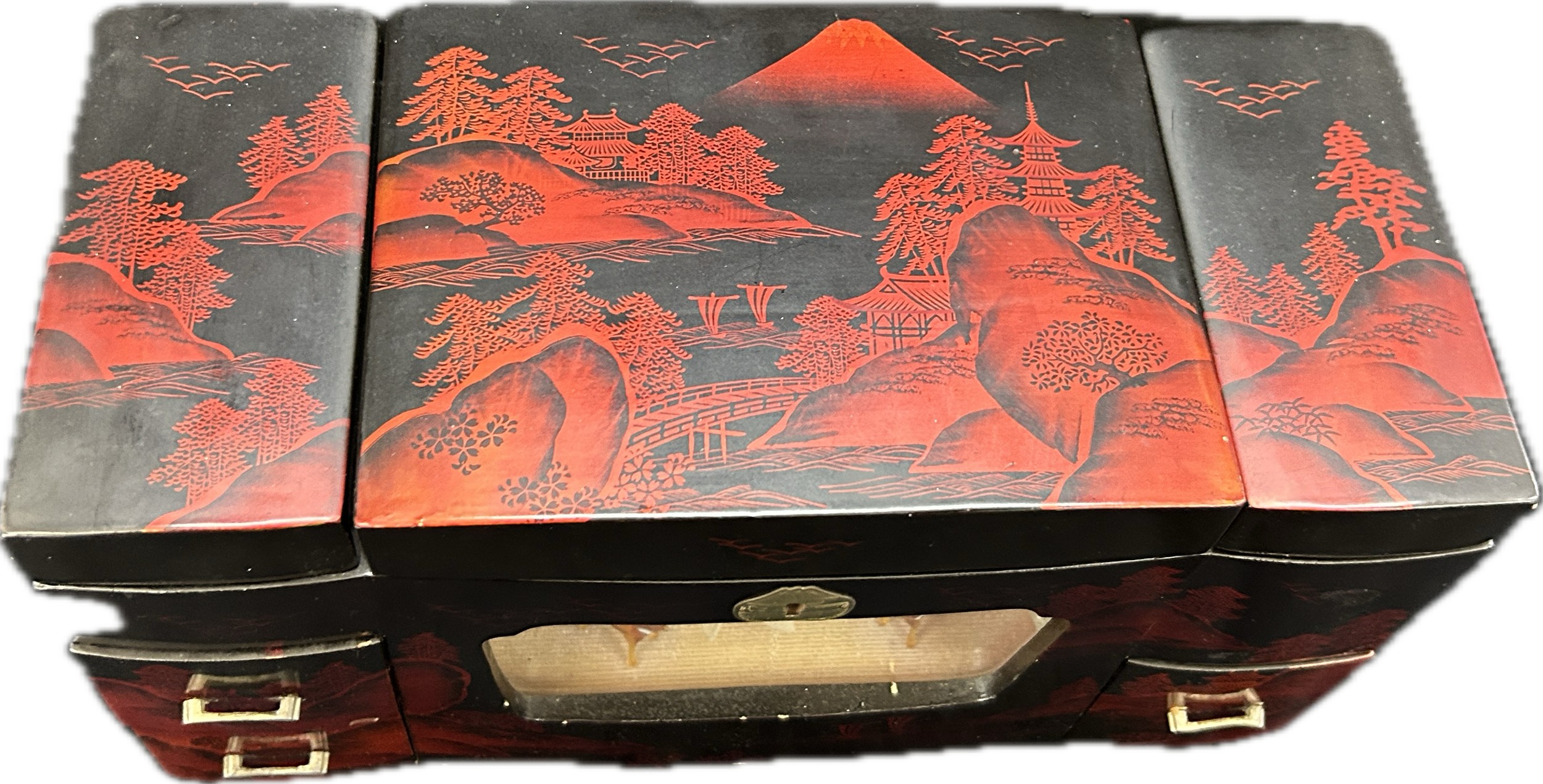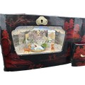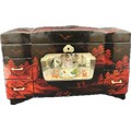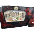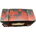 Oriental black lacquer Rickshaw music jewellery box measures approximately: 9 inches tall x 14 inches wide and 6 deep
