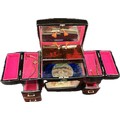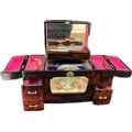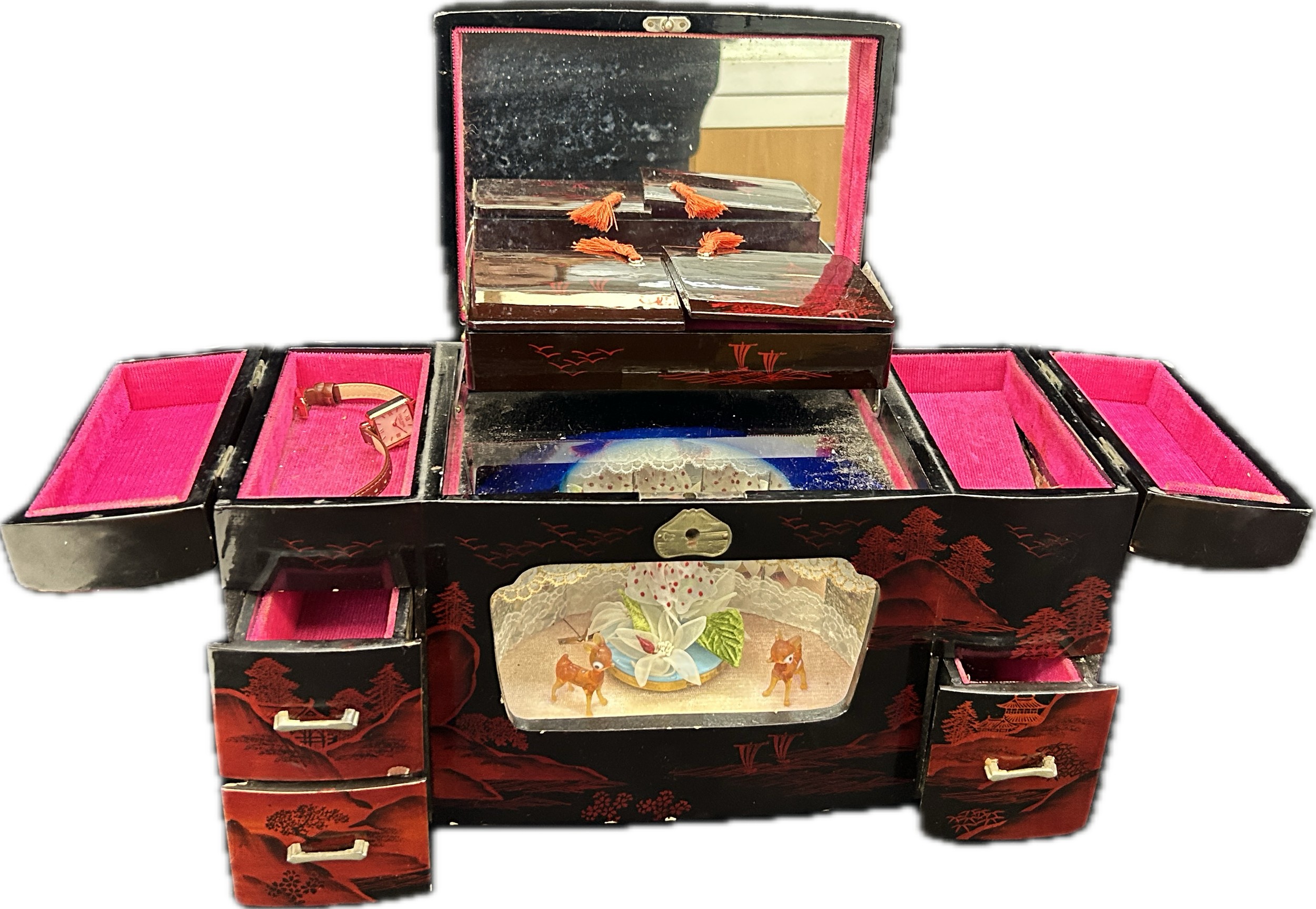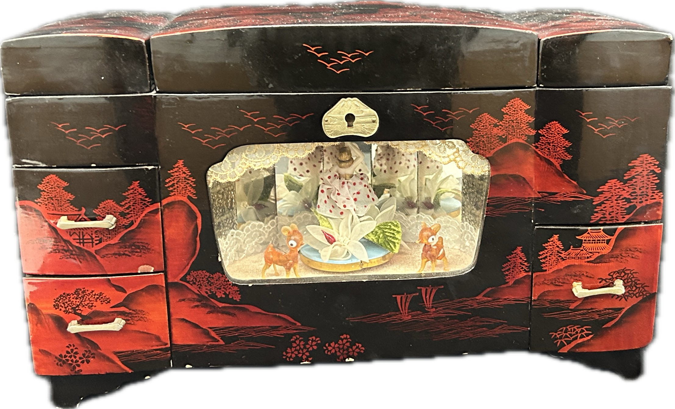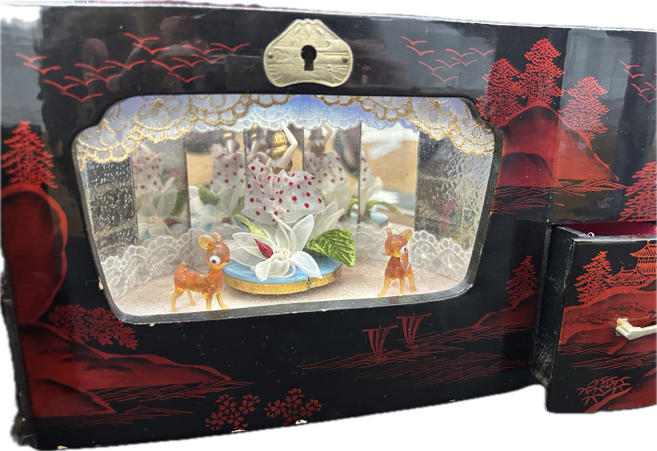 Oriental black lacquer Rickshaw music jewellery box measures approximately: 9 inches tall x 14 inches wide and 6 deep