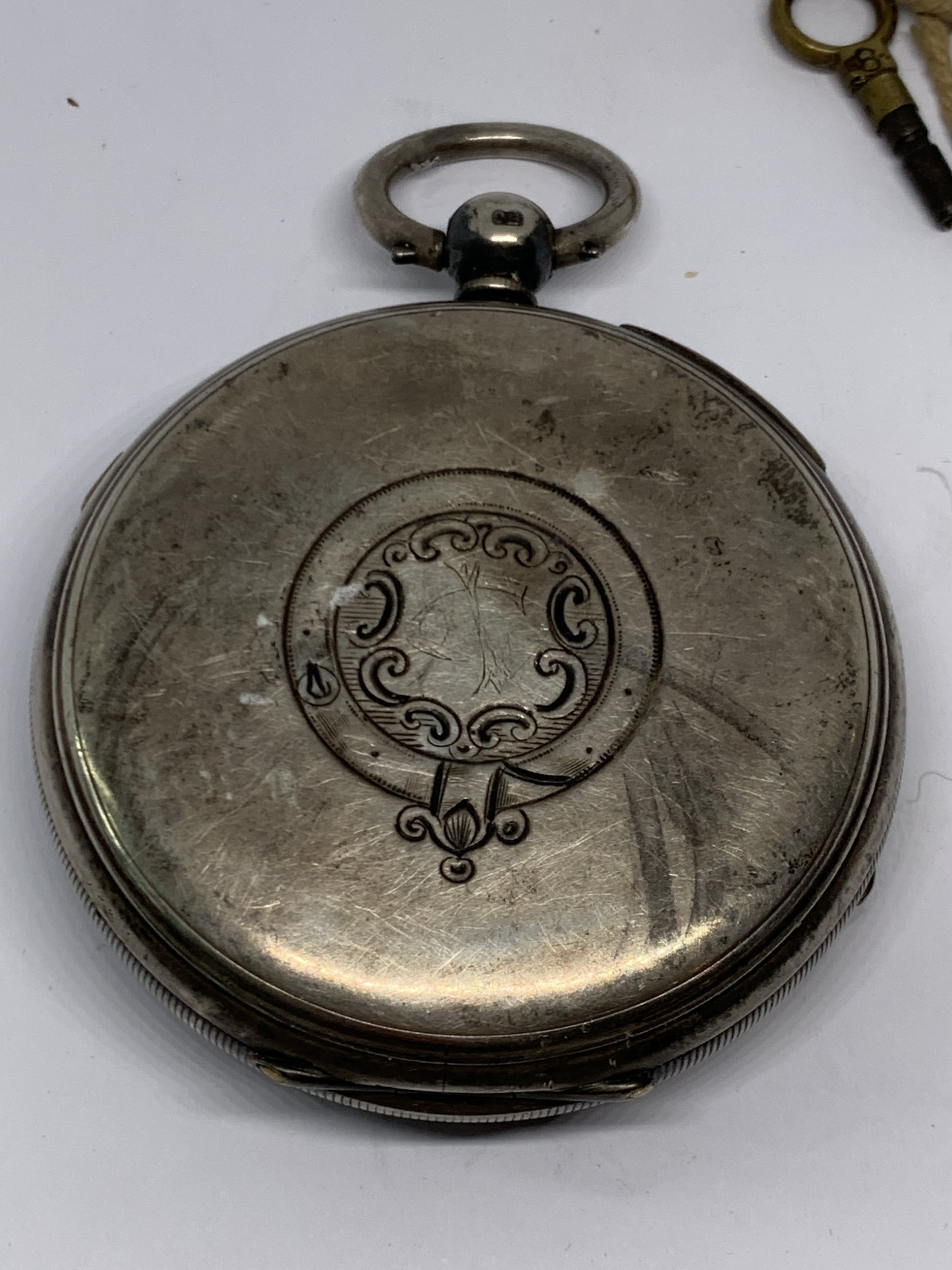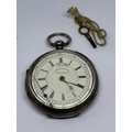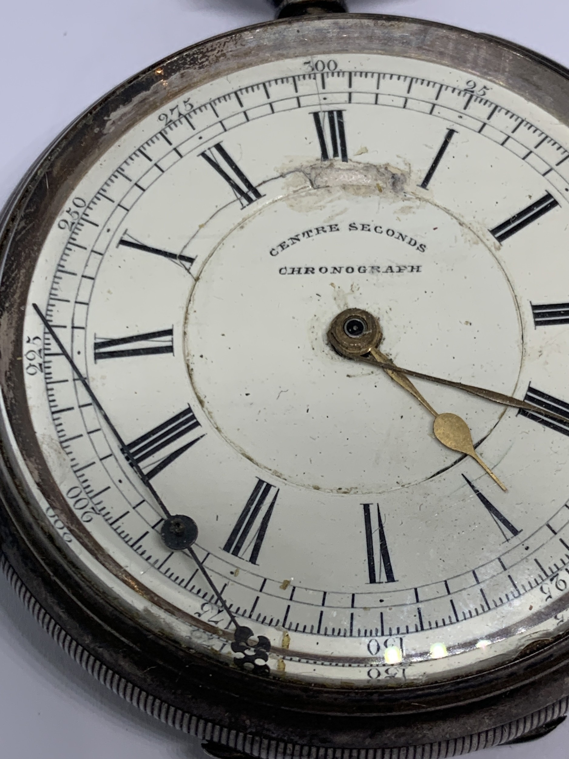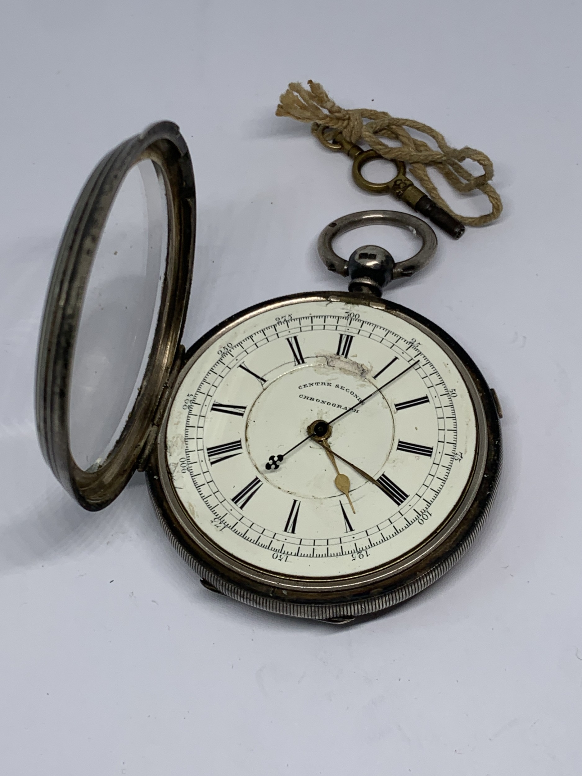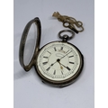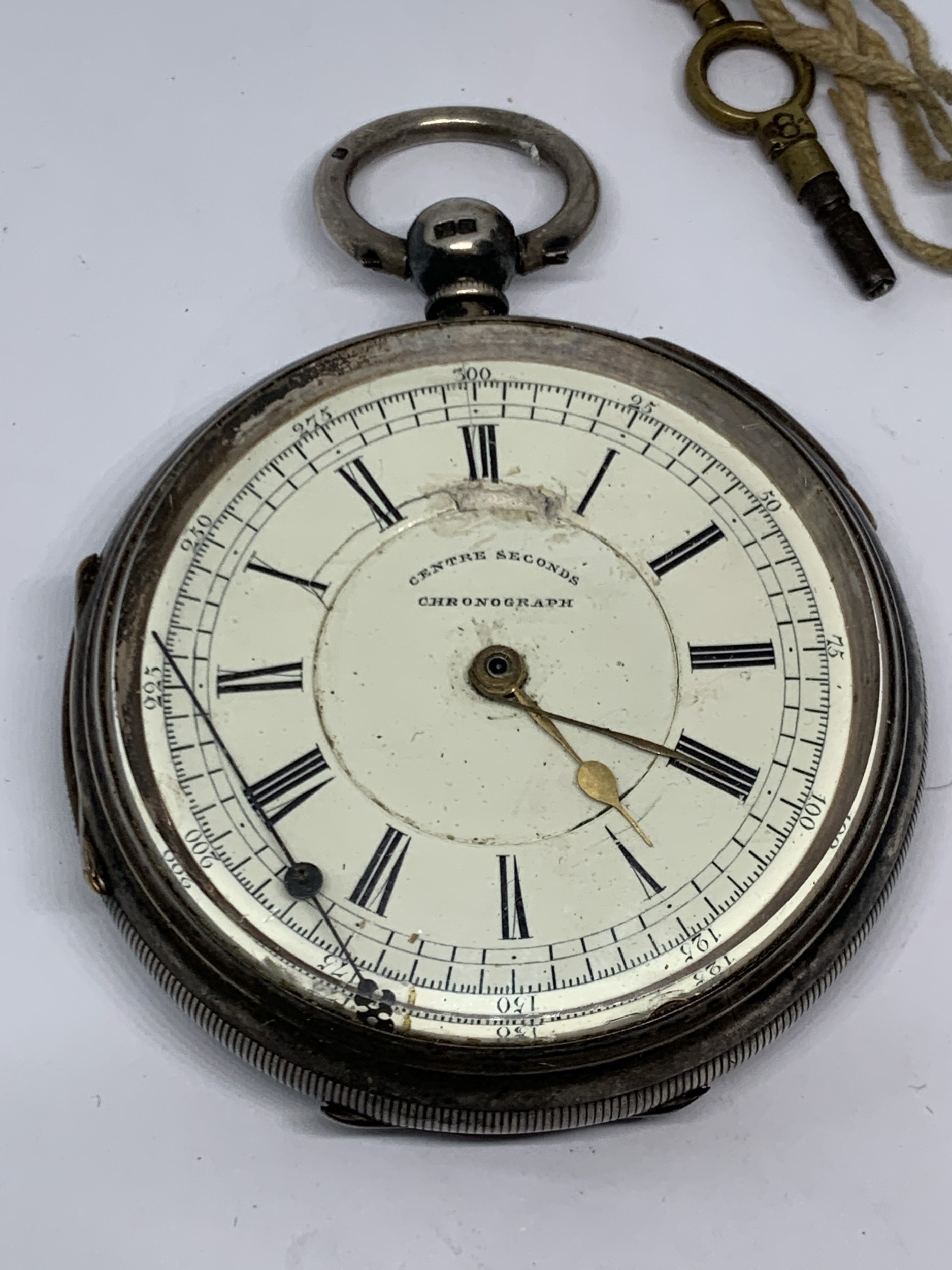 A HALLMARKED CHESTER SILVER CENTRE SECONDS CHRONOGRAPH WRIST WATCH WITH WHITE ENAMEL FACE, ROMAN NUMERALS AND KEY GROSS WEIGHT (WITHOUT KEY) 177.1 GRAMS