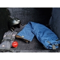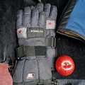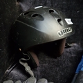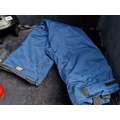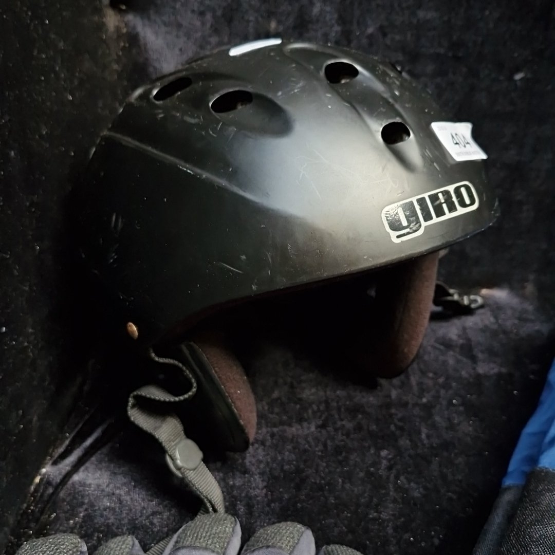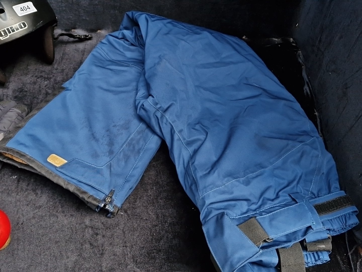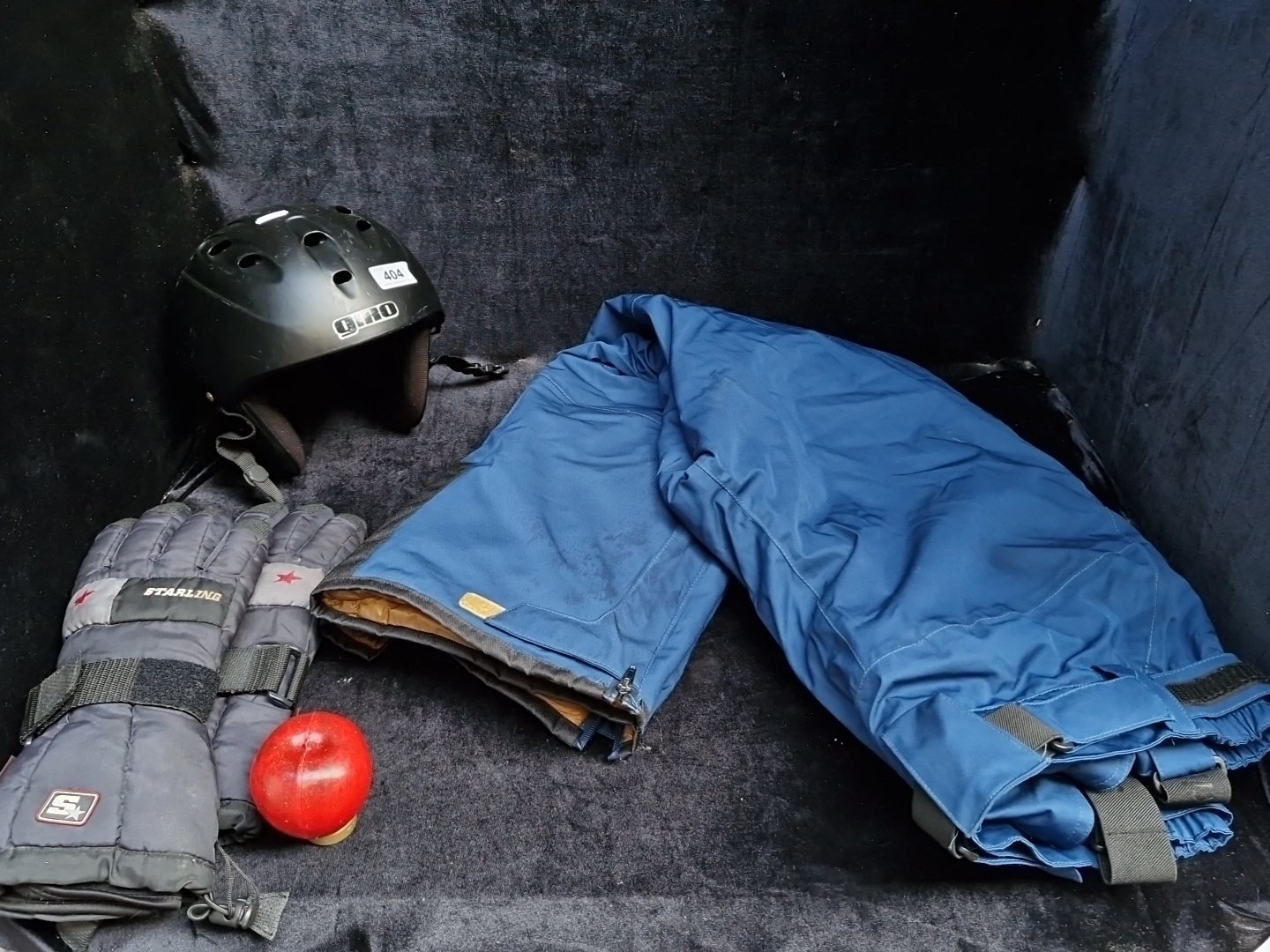 A group of winter sports accessories comprising a Giro vented helmet, Starling padded gloves, and blue insulated over-trousers with zip hems and adjustable gaiters. Sizes of Over trousers - Large.