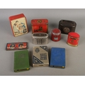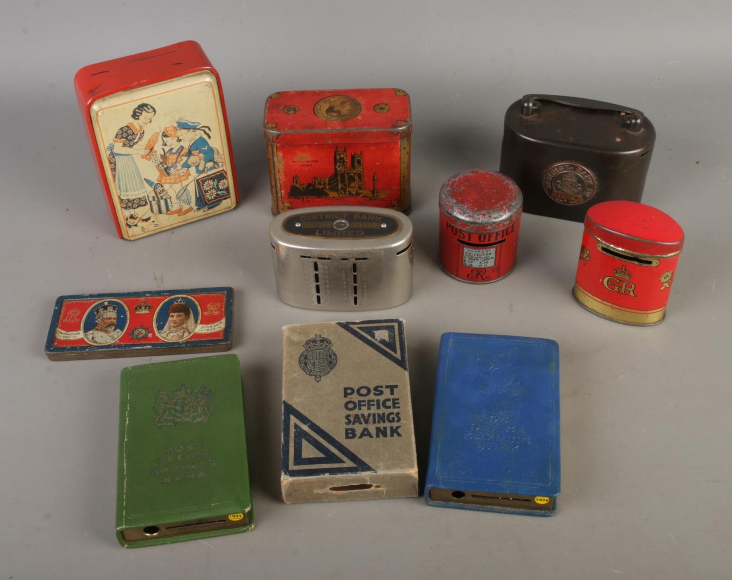 A box of assorted vintage tins to include post office savings bank, Oxo Coronation Treasure Chest, Post Box money box, etc.