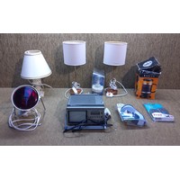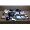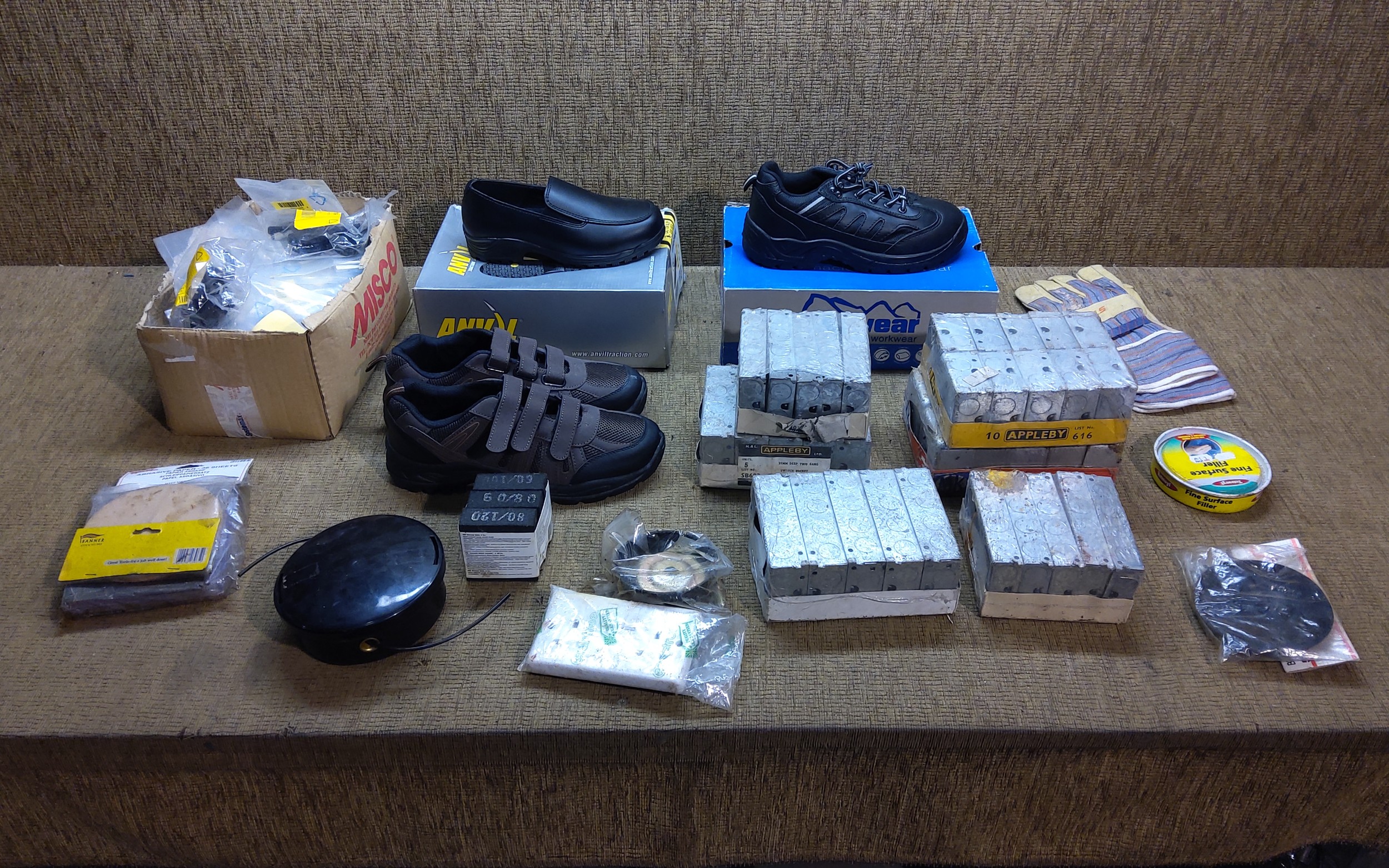 Collection of Electrical fittings boxed work boots size 3 and computer parts.