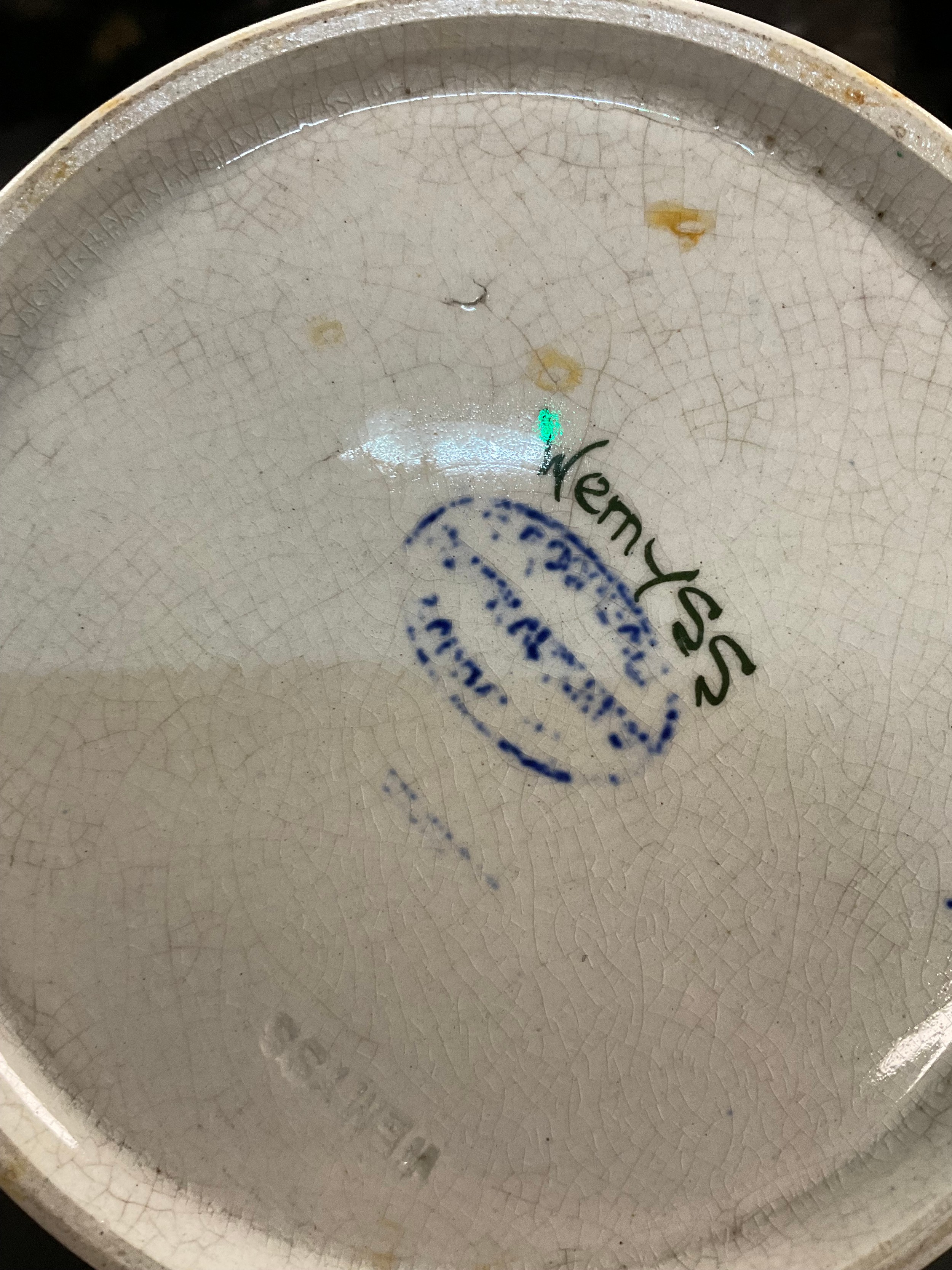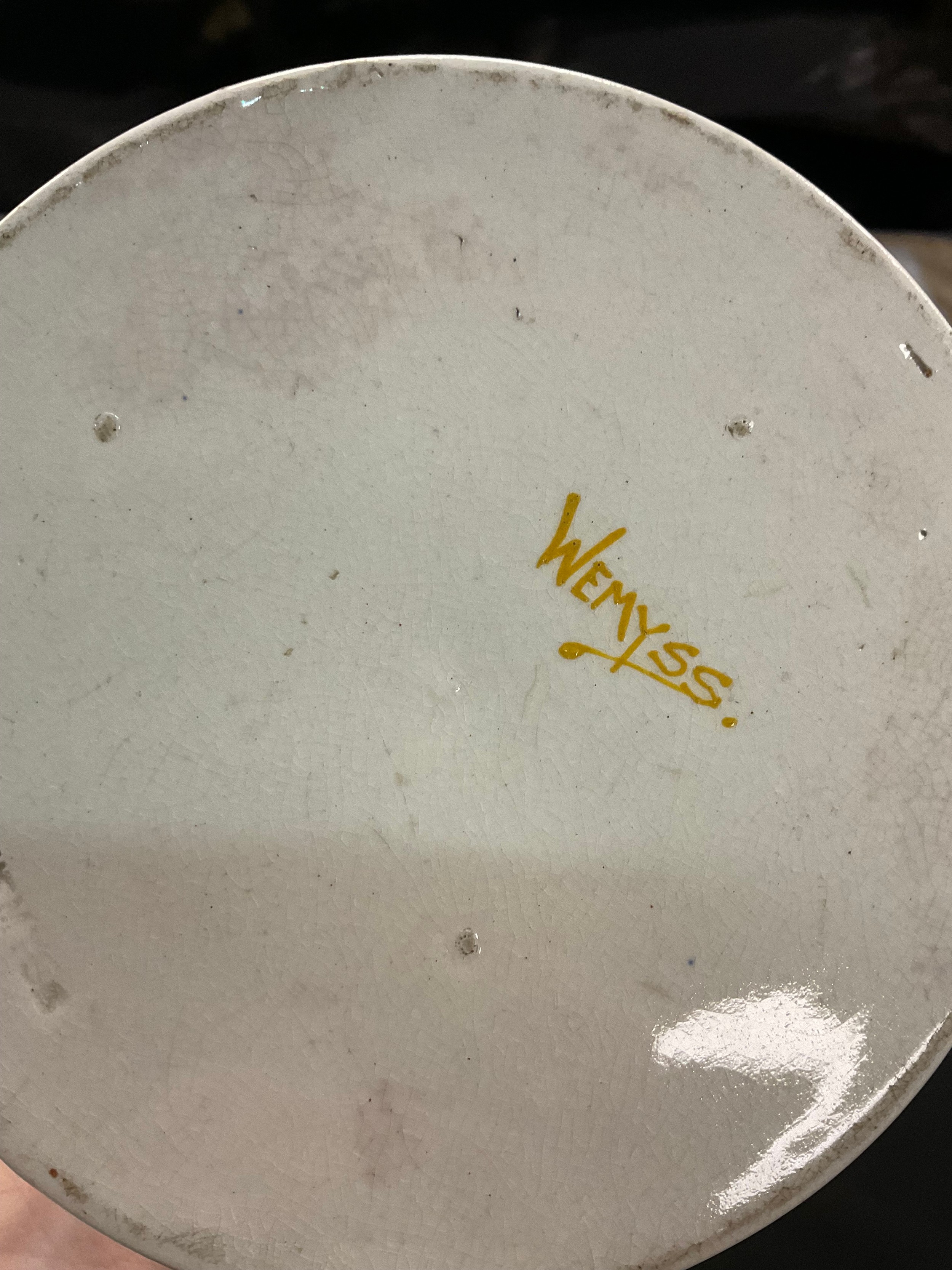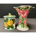 An early 20th century Wemyss ware ‘Lady Eva’ vase, decorated with cabbage roses, mark to base, 20.5cm high; another, a Wemyss earthenware ‘oranges’ preserve jar and cover, mark to base, 15cm high (2)