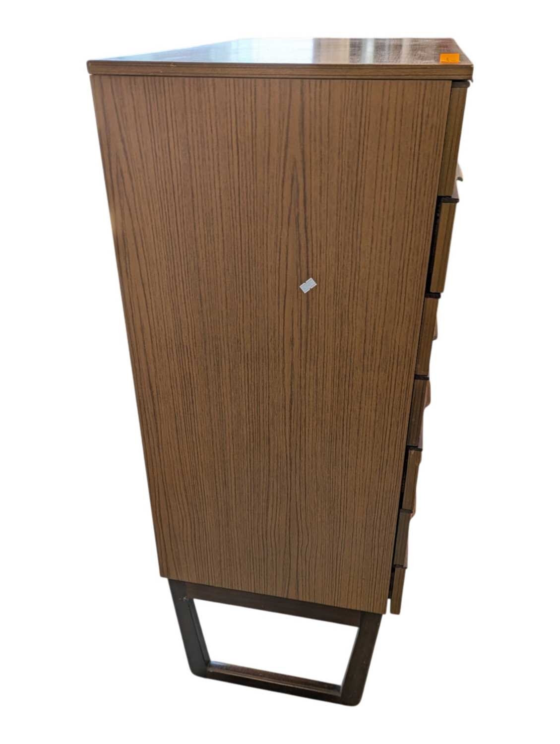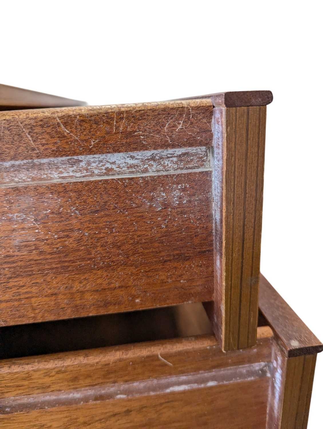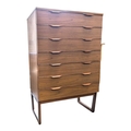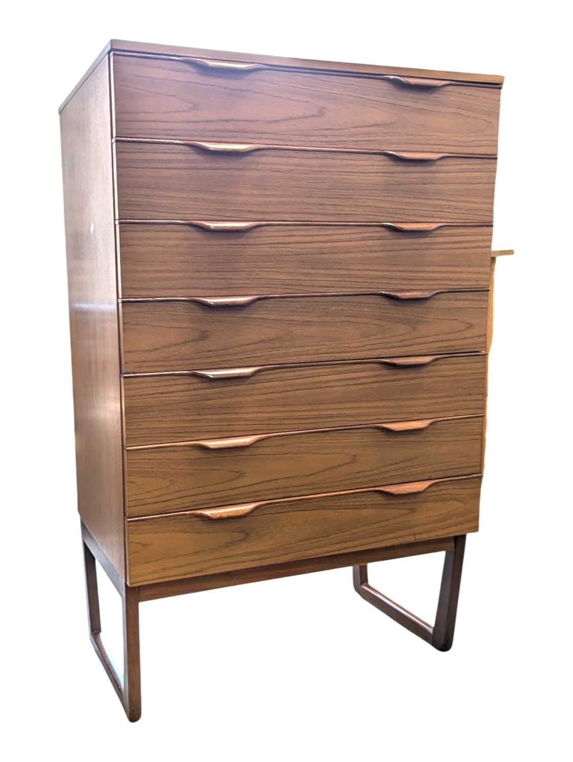 Schreiber Furniture - A vintage mid 20th century teak veneer chest of drawers. Rectangular form with a bank of seven drawers. All raised on quadrille style legs with lipped pull handles. Measures approx: 119x76x46cm
