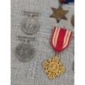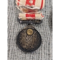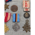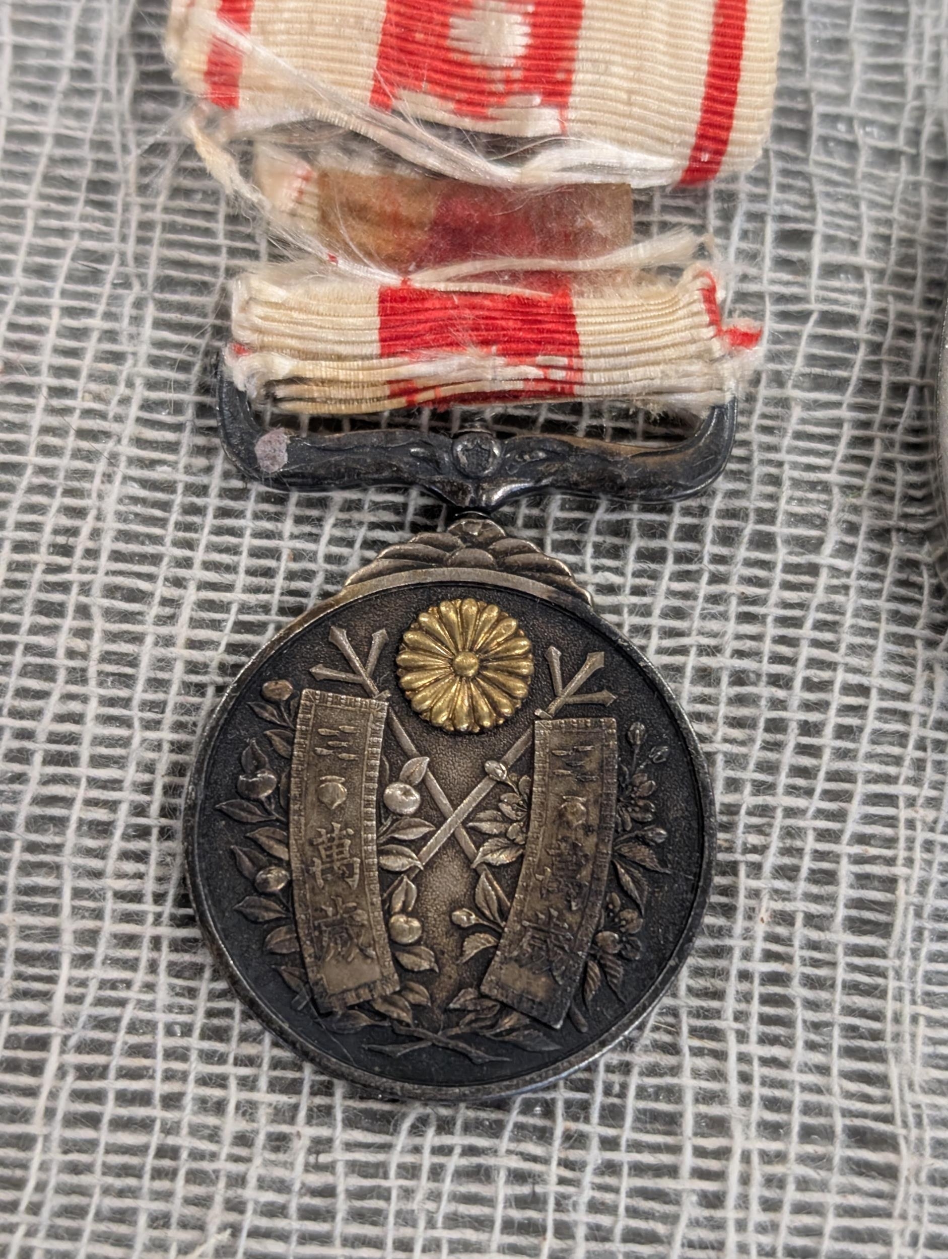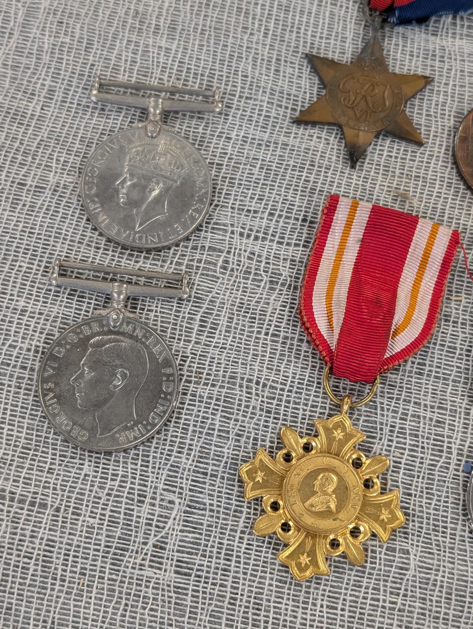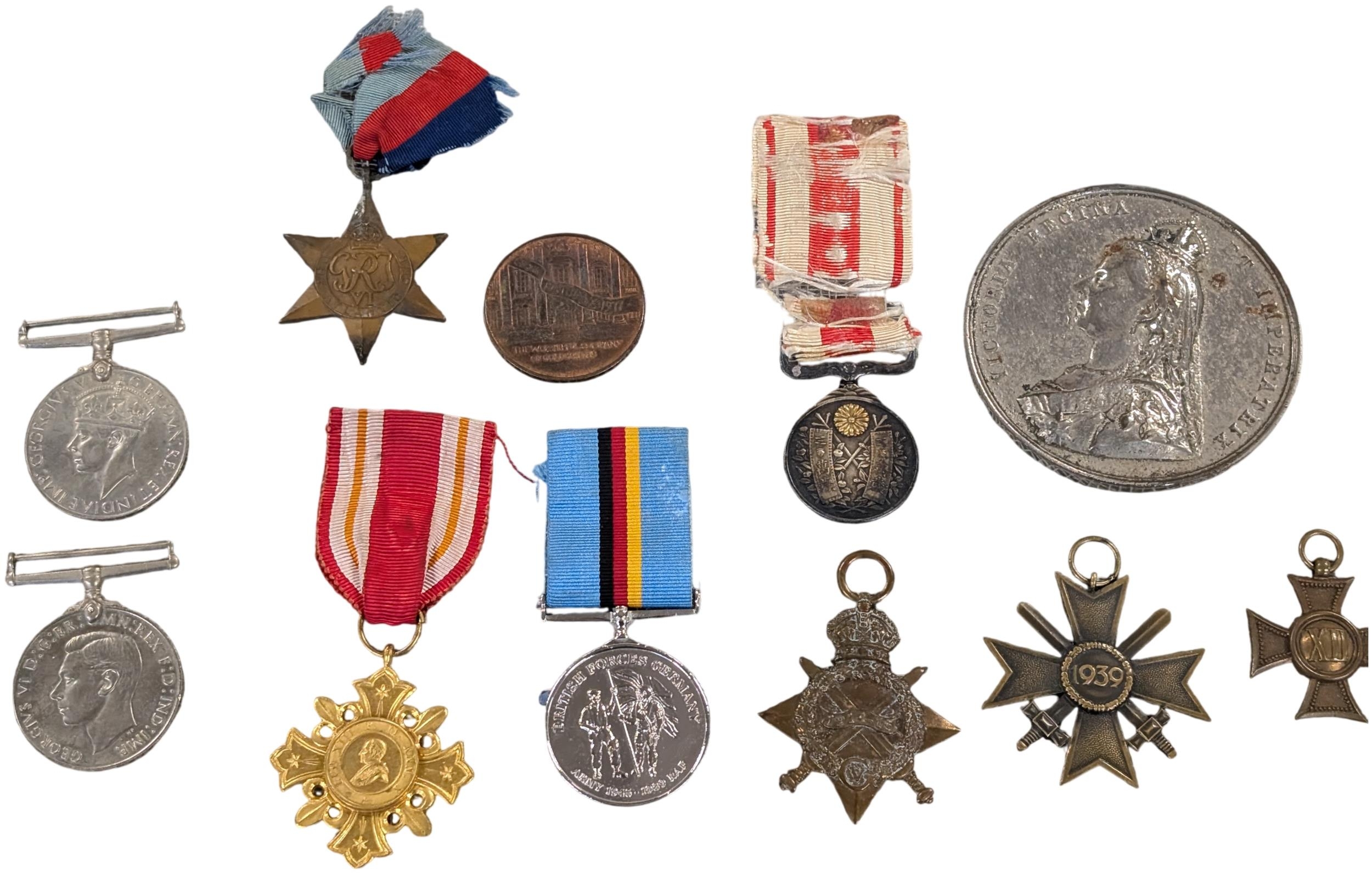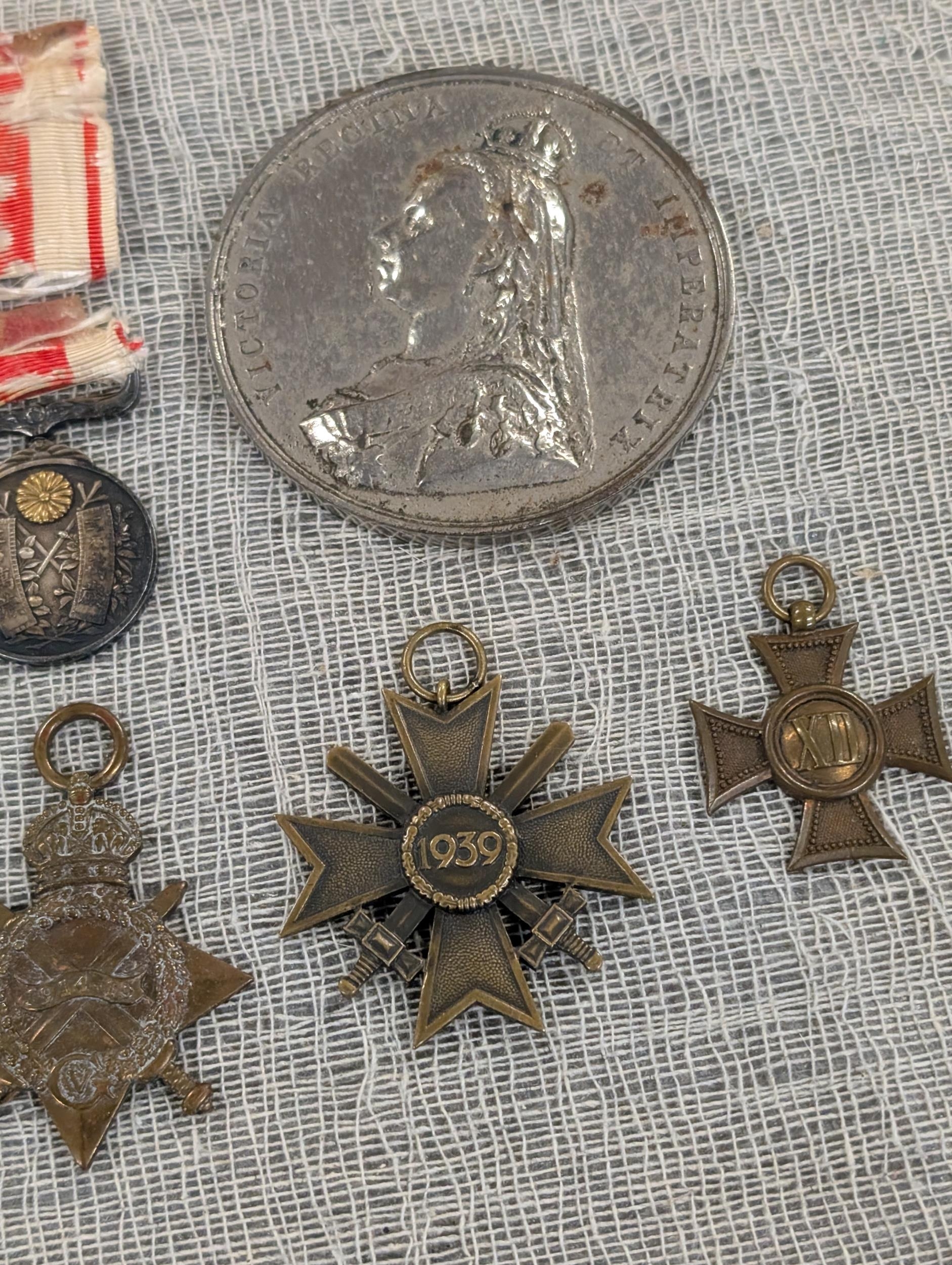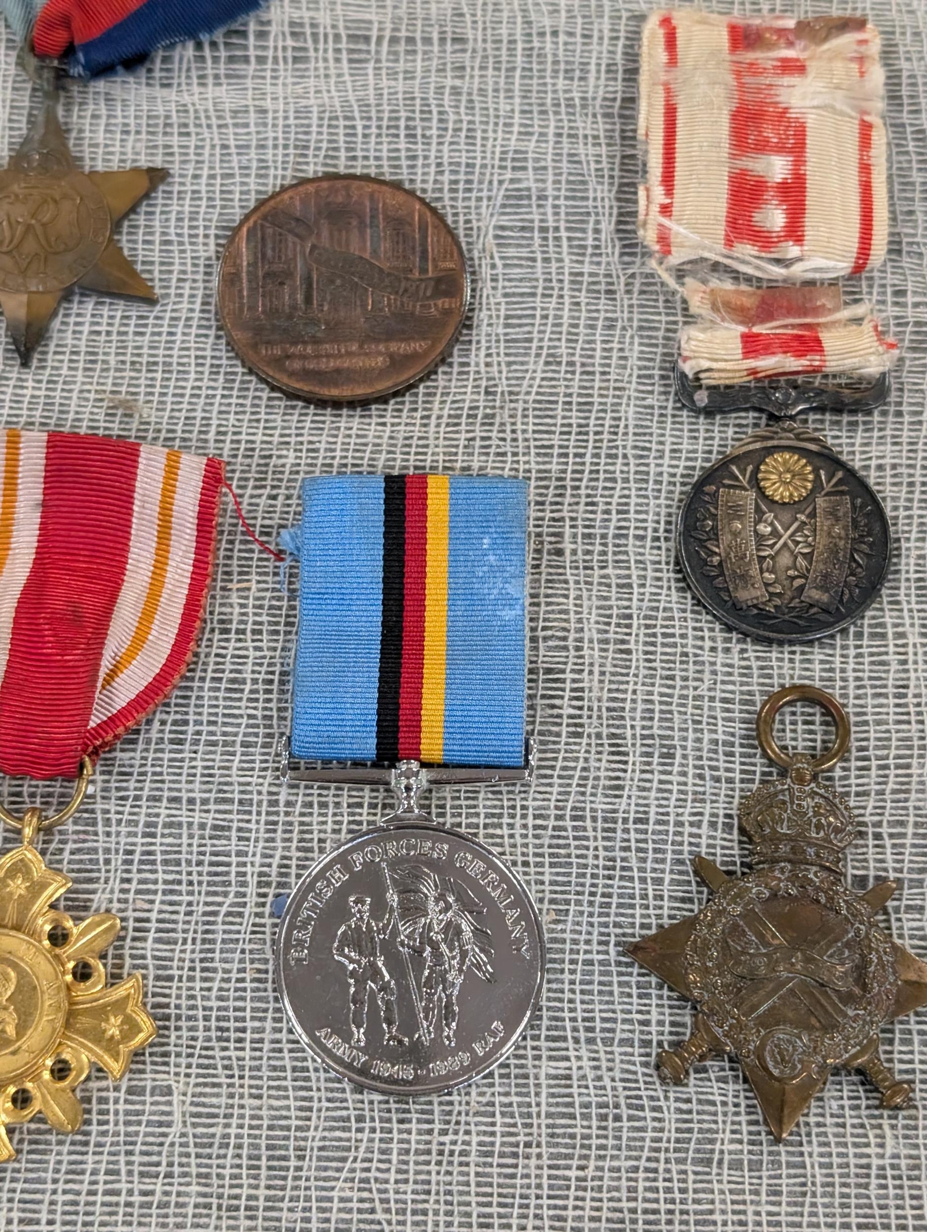 A Collection of British, German, and International Military and Commemorative Medals Including WW1 Imperial Japanese 1915 Medal, British 1914-15 Star. Vatican Cross, WWI Era Austro-Hungarian Cross, (Replica) Third Reich Merit Cross