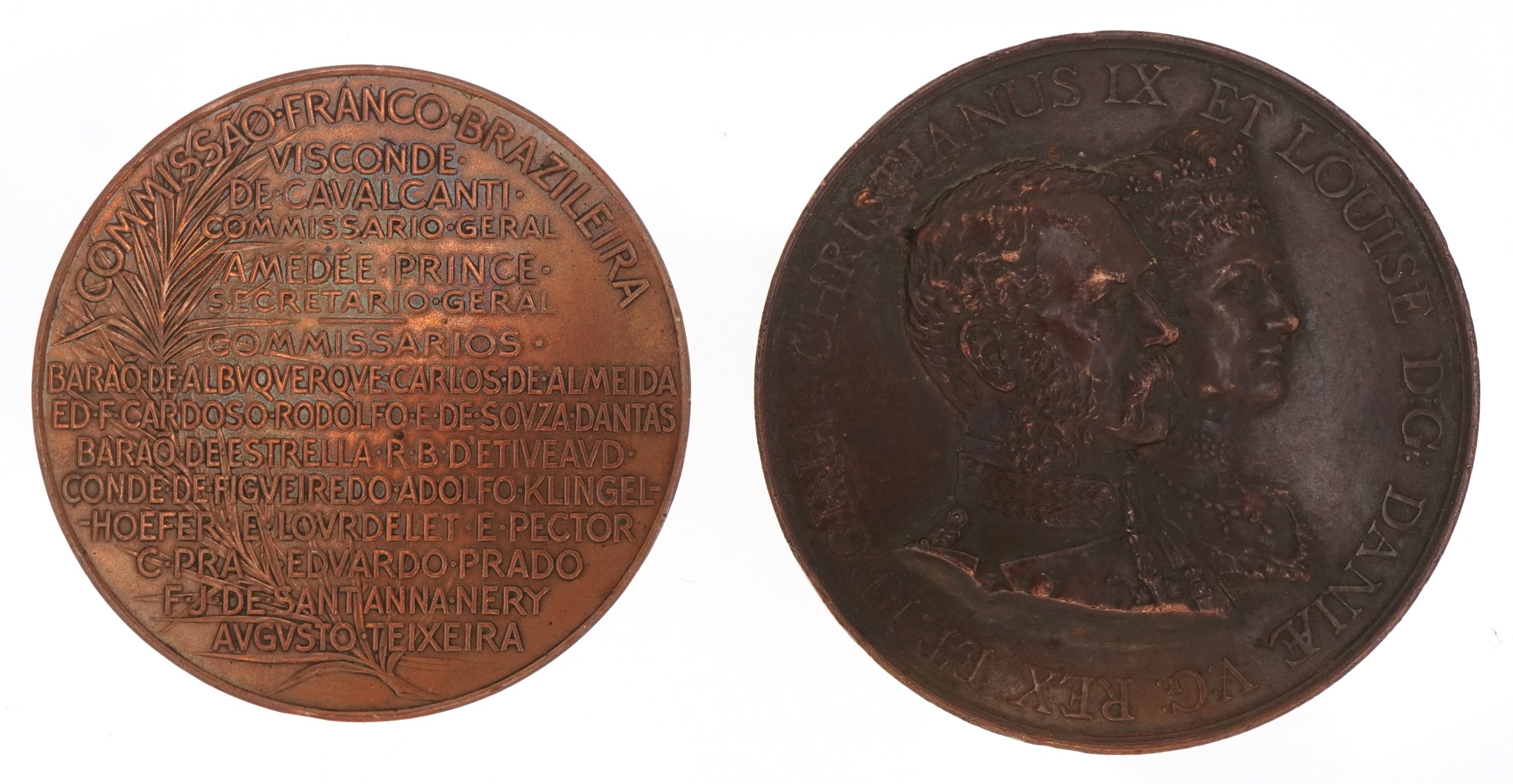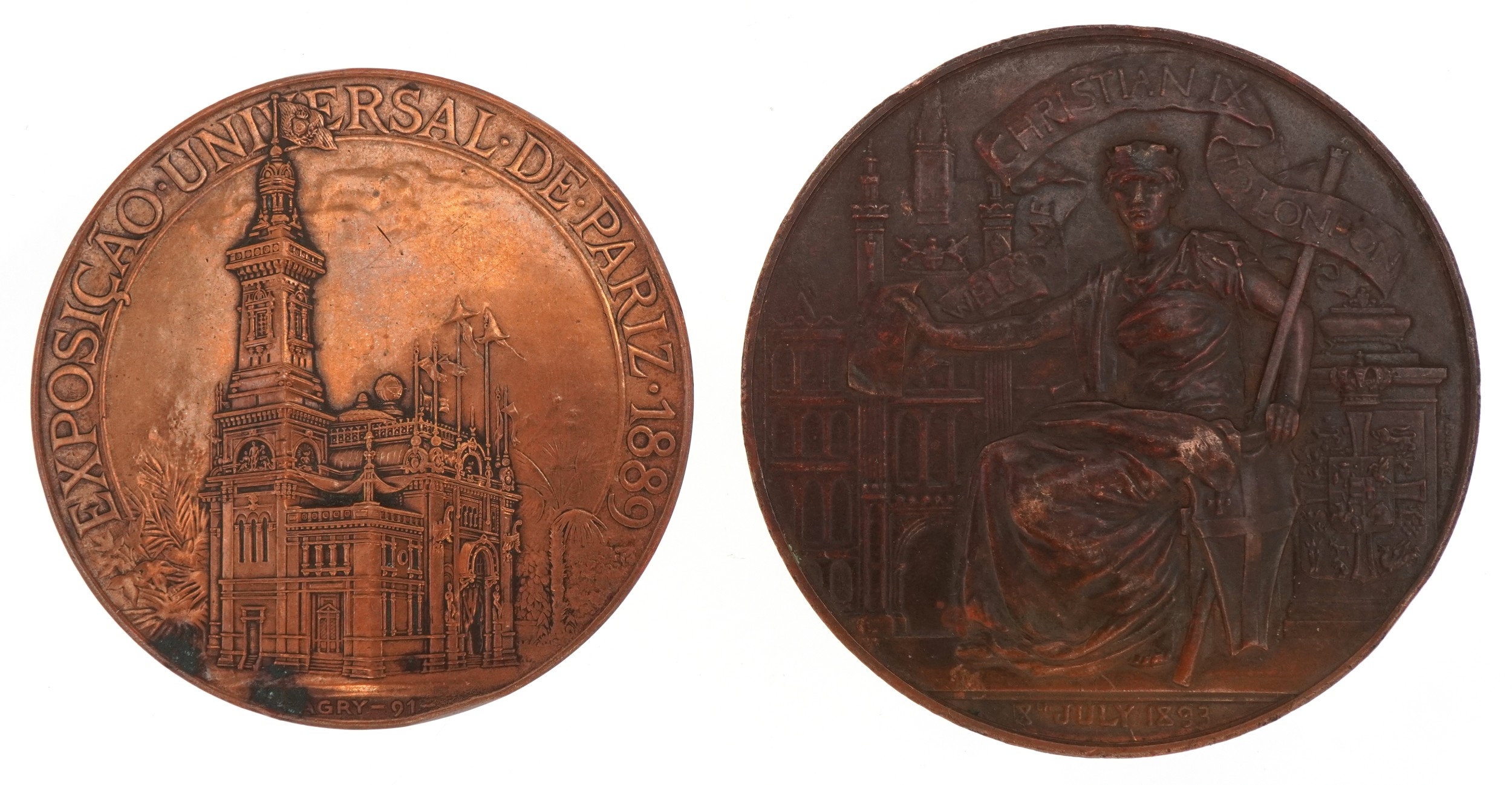 Two late 19th century bronze medallions comprising The Golden Wedding of King Christian IX and Queen Louise of Denmark and Exposition Universelle de Paris 1889, the largest 7.5cm in diameter.