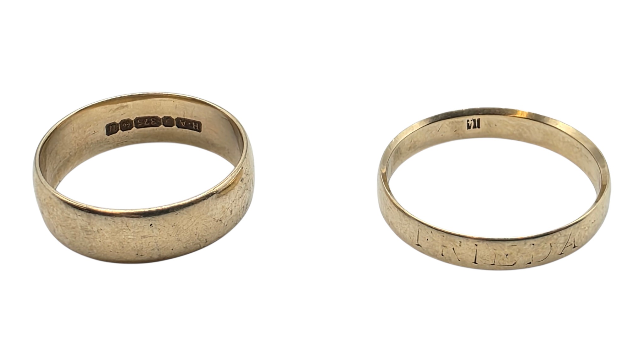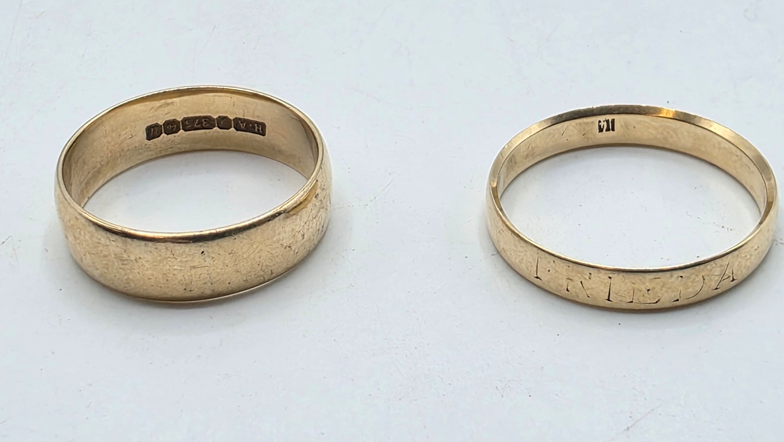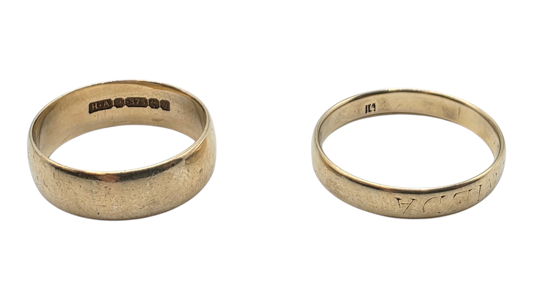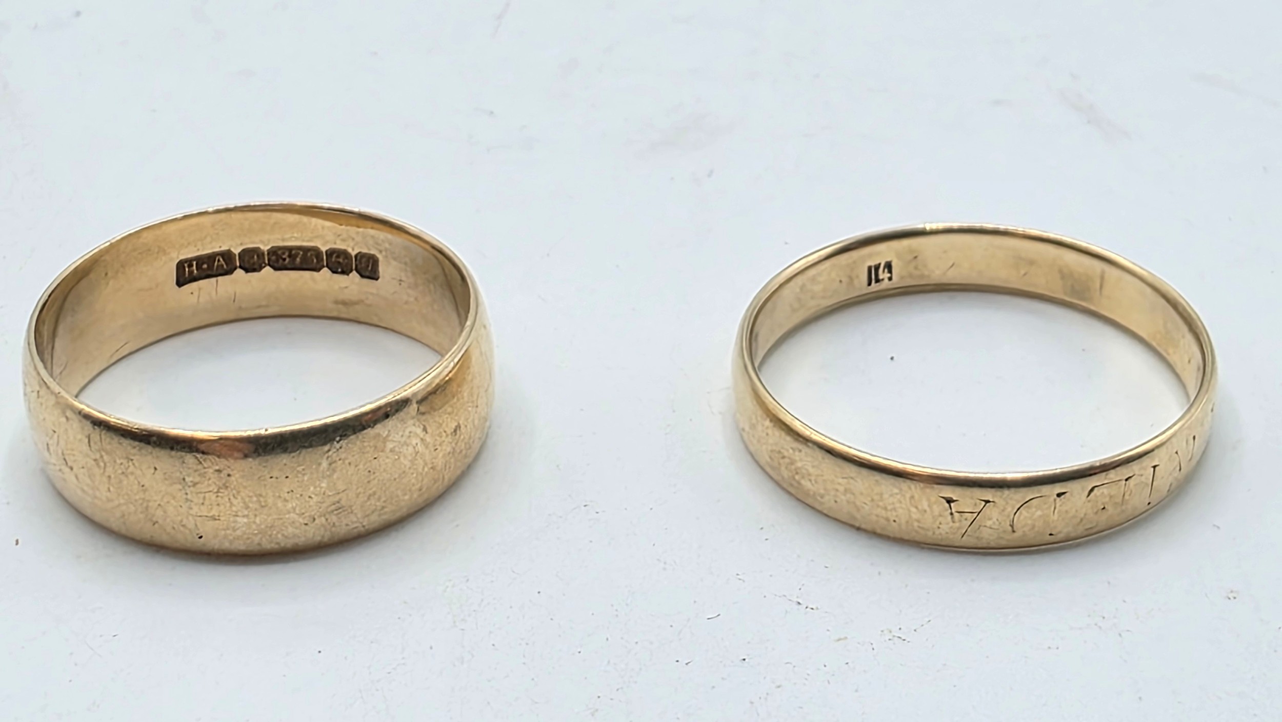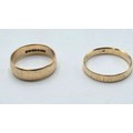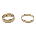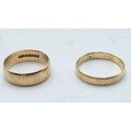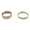 A 9ct gold wedding band Size O, 3.1 g, together with an unmarked yellow metal wedding band Size R, 2.5 g