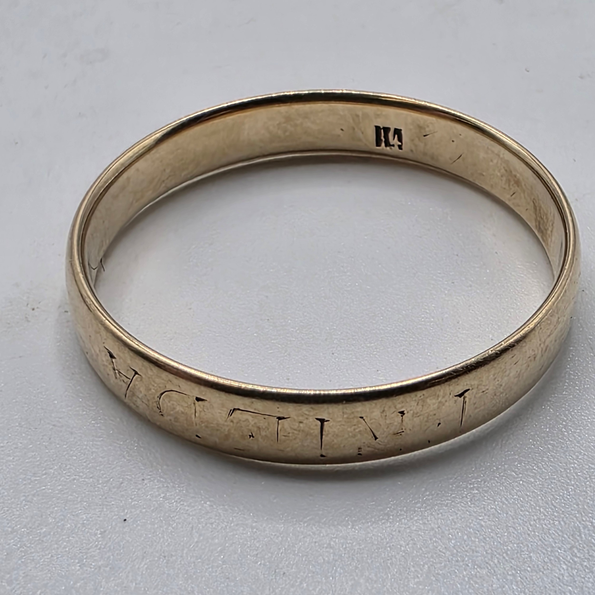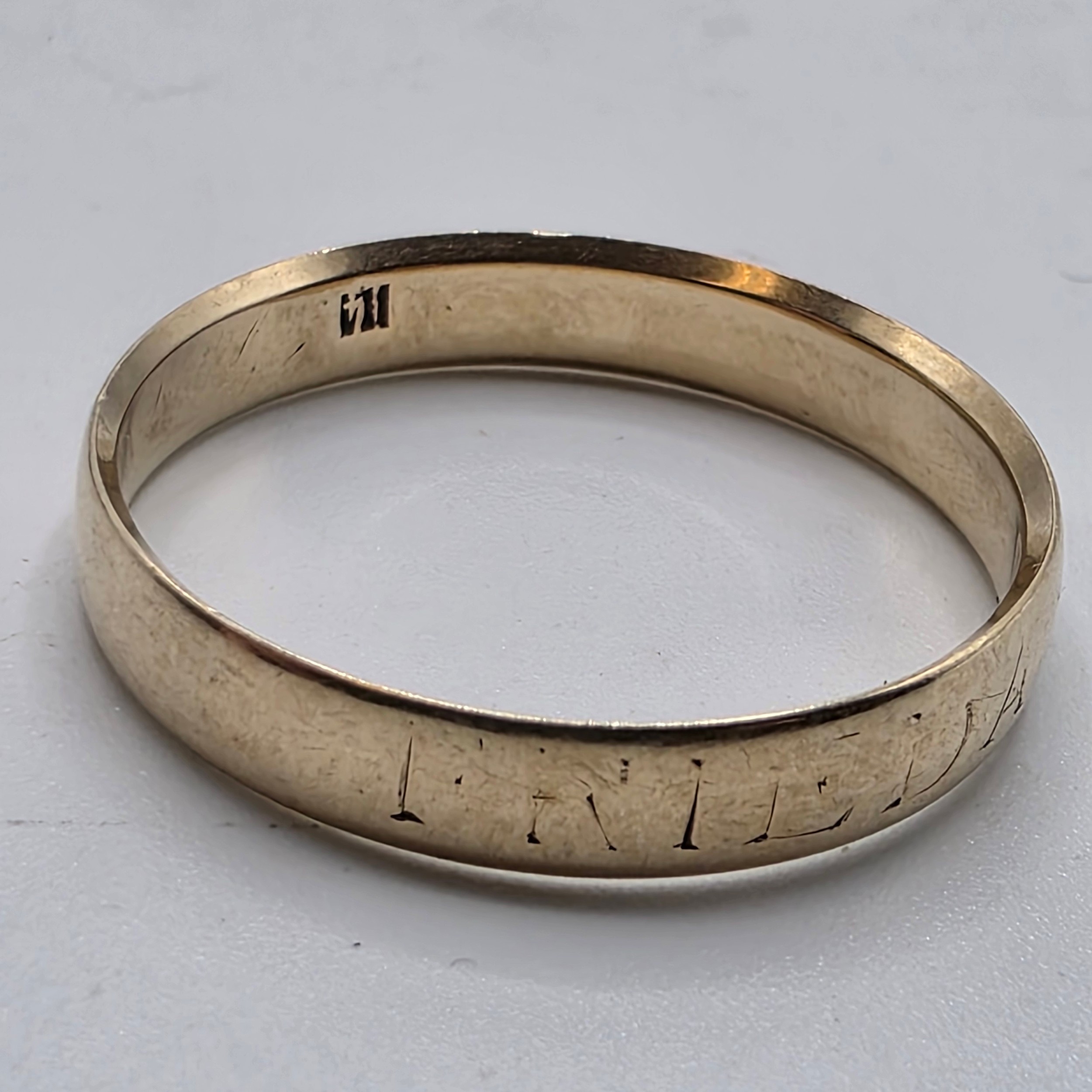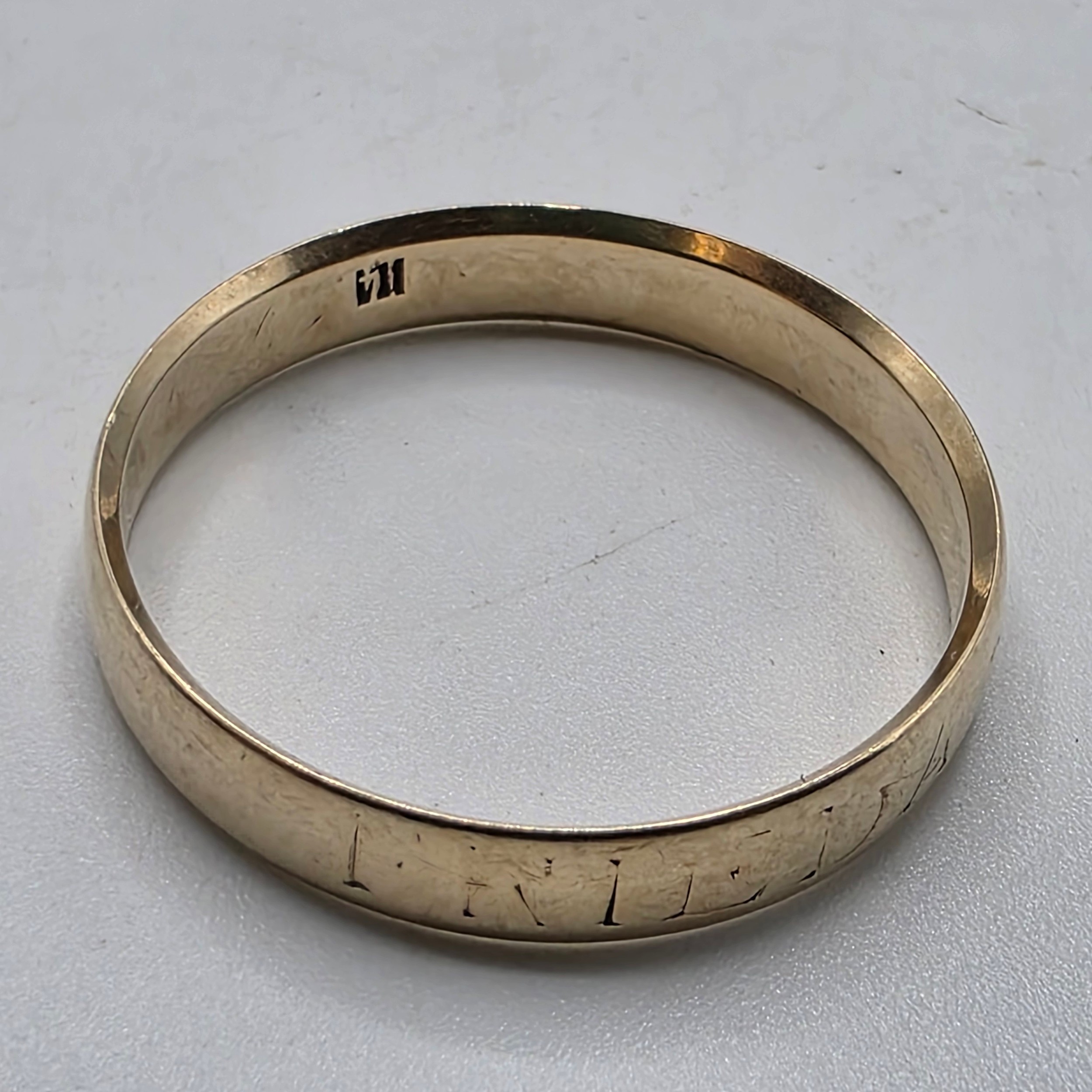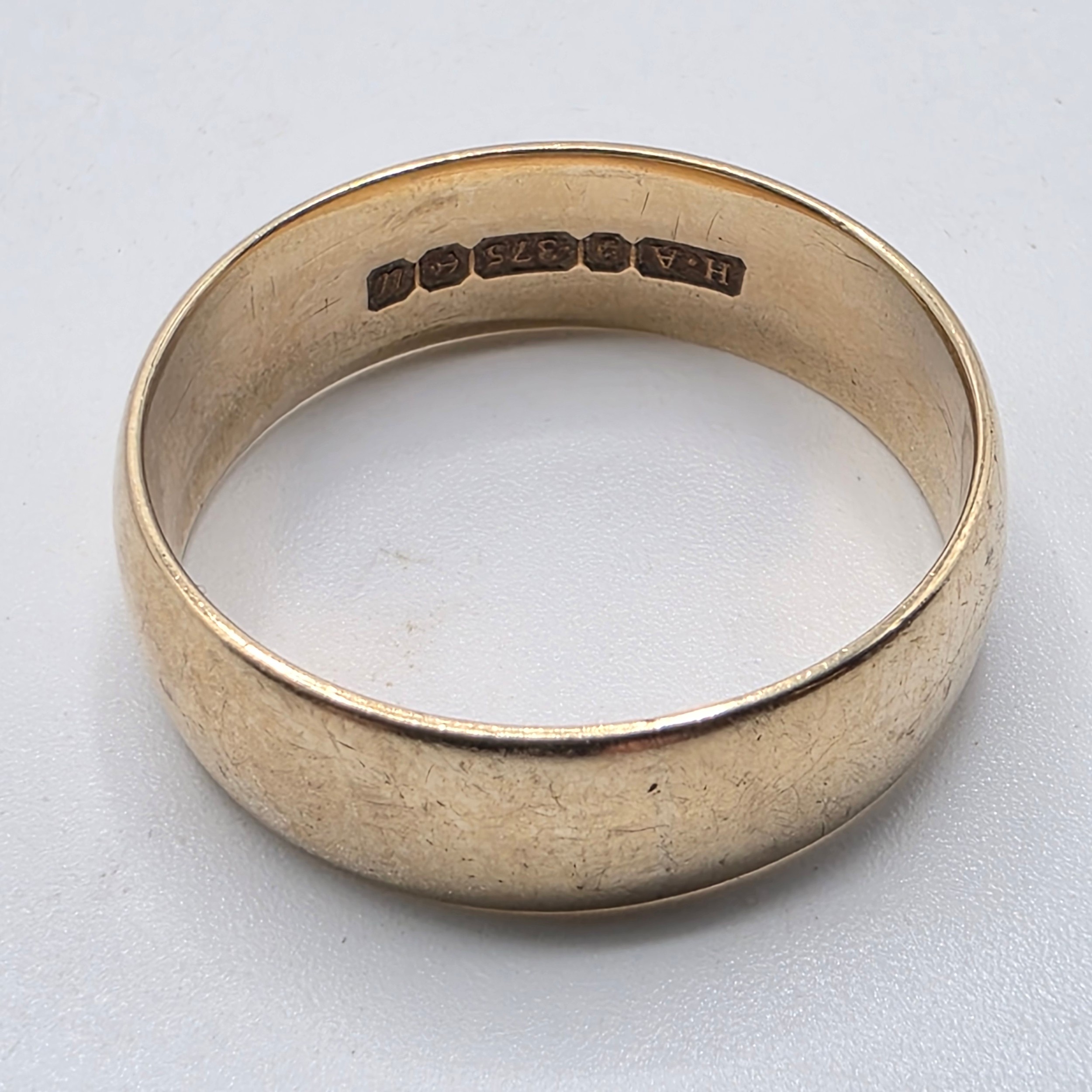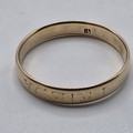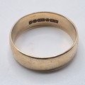 A 9ct gold wedding band Size O, 3.1 g, together with an unmarked yellow metal wedding band Size R, 2.5 g