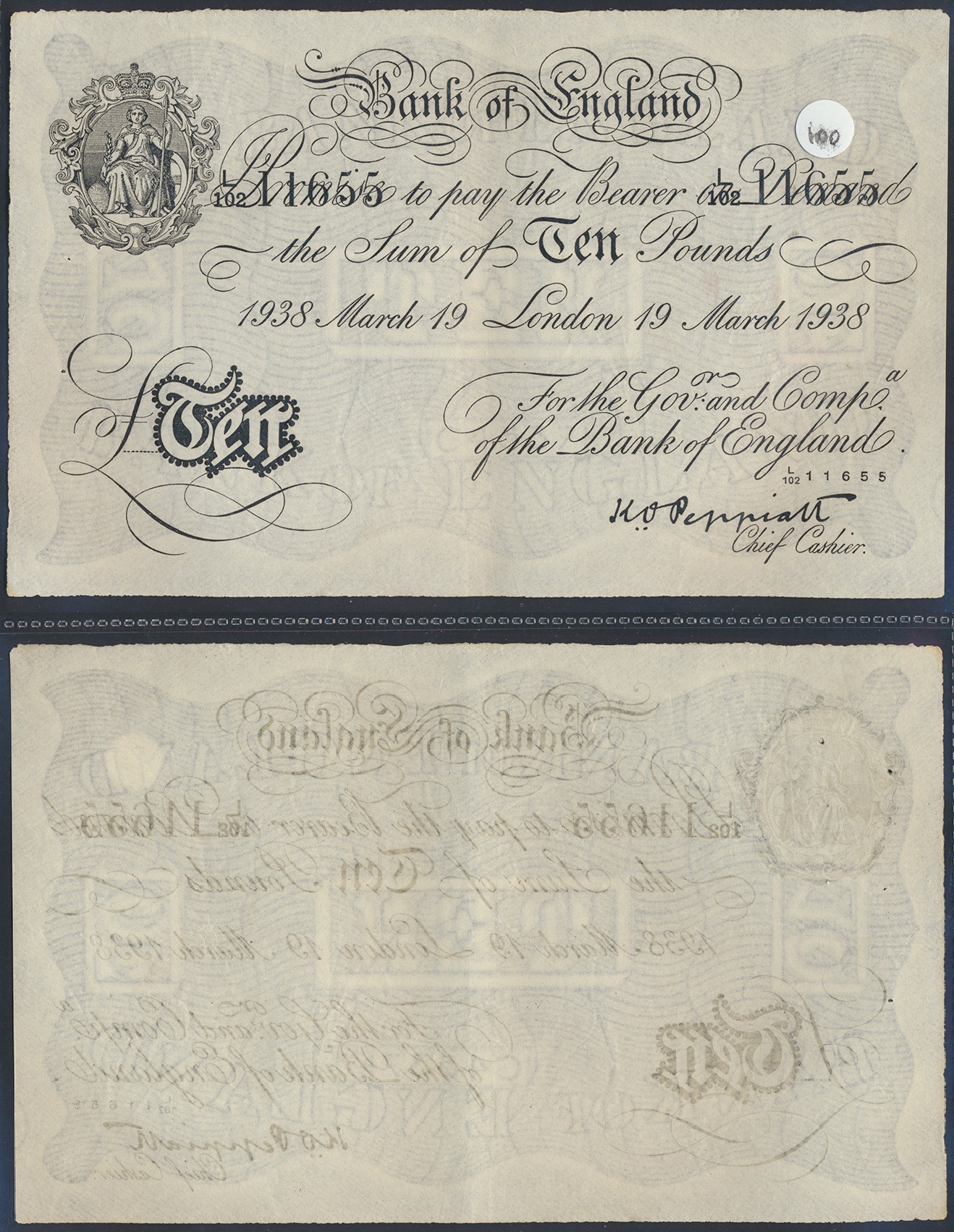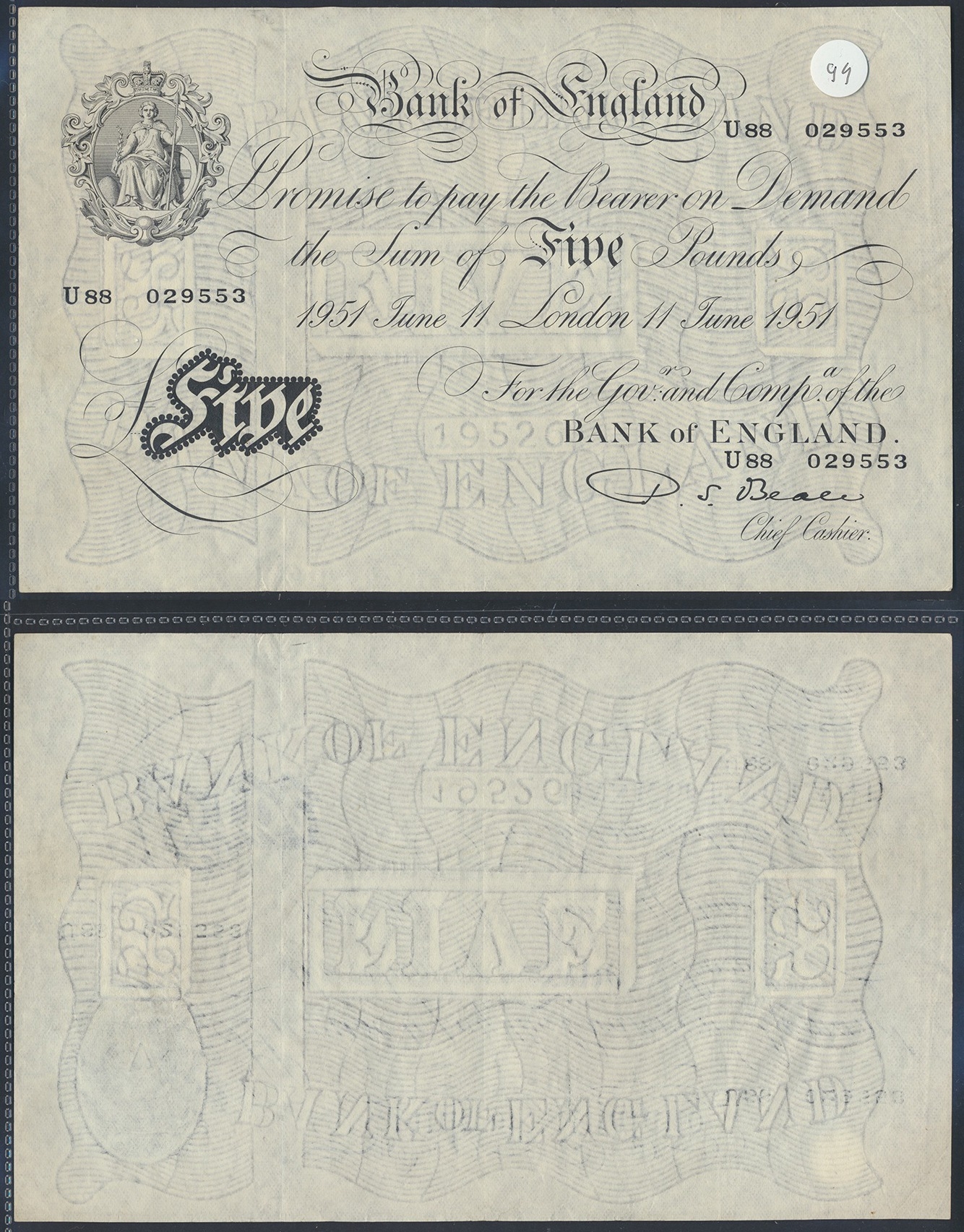 White banknotes with P.S. Beale 1951 (11 June) £5 U88 029553 about very fine and K.O. Peppiatt Operation Bernhard 1938 (19 March) £10 L/102 11655 fine. (R)