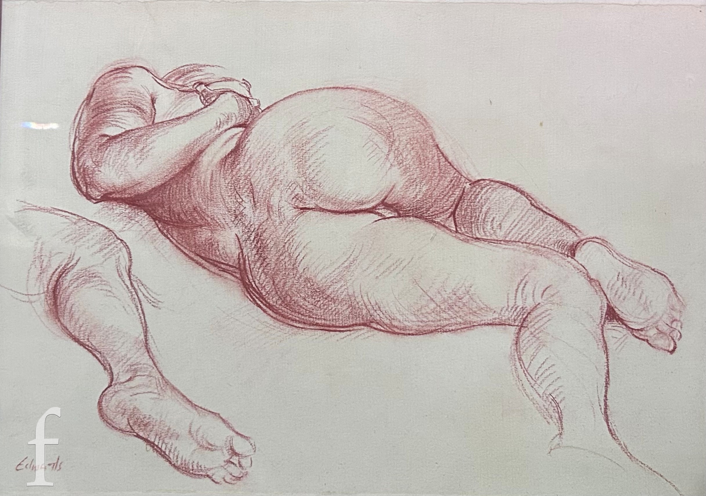 John Edwards R.A. (1940-2020) - Study of a reclining female nude, back view, sanguine chalk, signed, framed, 29cm x 39cm, frame size 50cm x 59cm, also six other drawings by the same hand. (7)