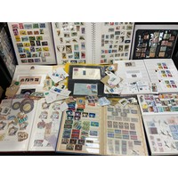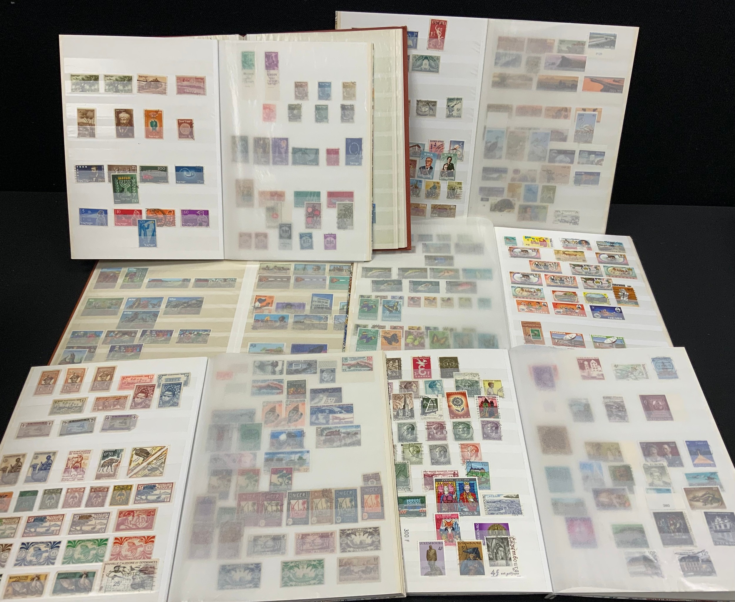 Stamps - seven stamp albums, various countries, SWA, Swaziland, Tuvalu, French Colonies, Zambia, etc, hundreds of stamps
