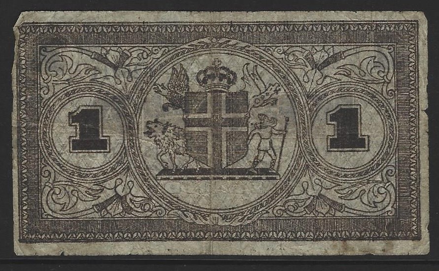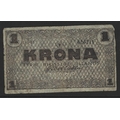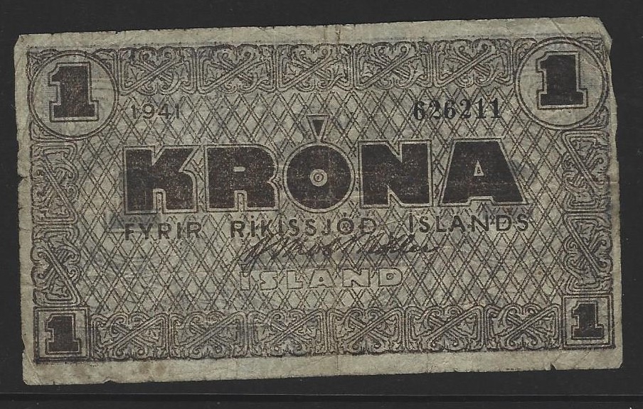 BANKNOTE. Iceland, 1 Krona, 1941, WWII emergency issue, serial number 626211 (first printing, issued 1945), P-22e, VG