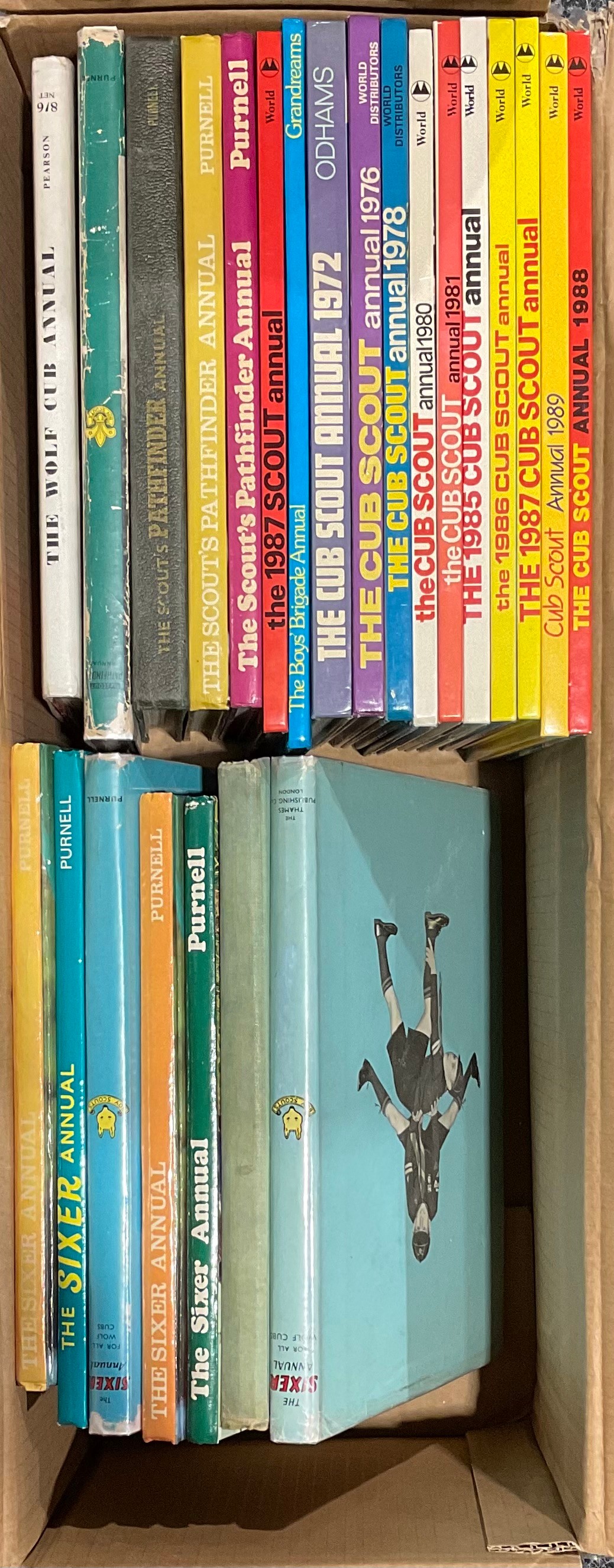 Books – Scouts and Cub Annuals: The Scout’s Pathfinder Annual, 4to, four issues: 1965 d. w., 1972, 1974 & 1978; Scout Annual, 1987; Boys’ Brigade Annual 1983; The Cub Scout Annual, ten issues: 1972, 1976, 1978 1980-81, 1985-89; The Wolf Cub Annual, 1961 d. w., 1963, d. w.; The Sixer annual for all Wolf Cubs, seven issues: 1960 d. w., 1962, 1970, 1974, 1977, all from the collection of Nicholas Wilde (qty)