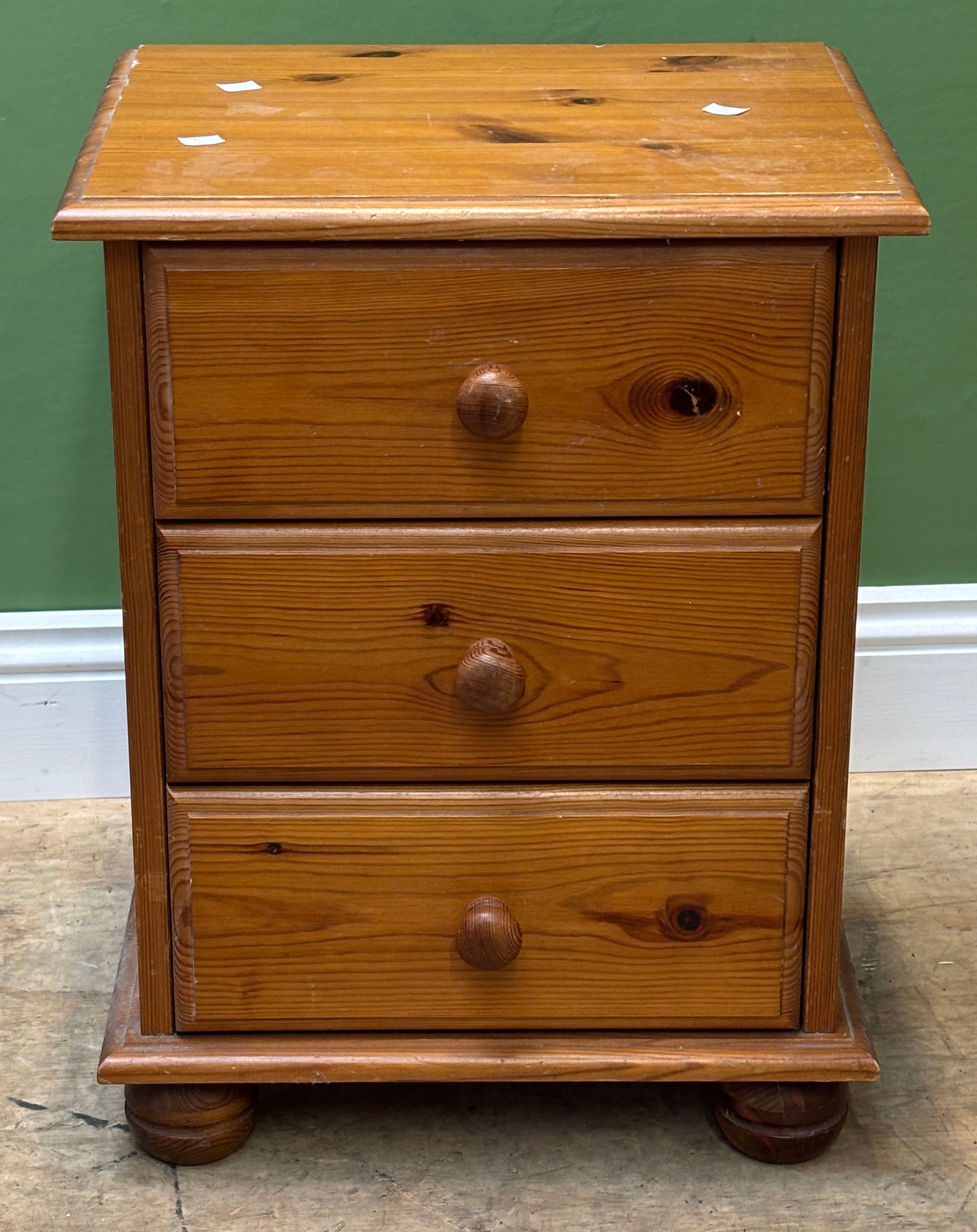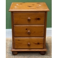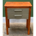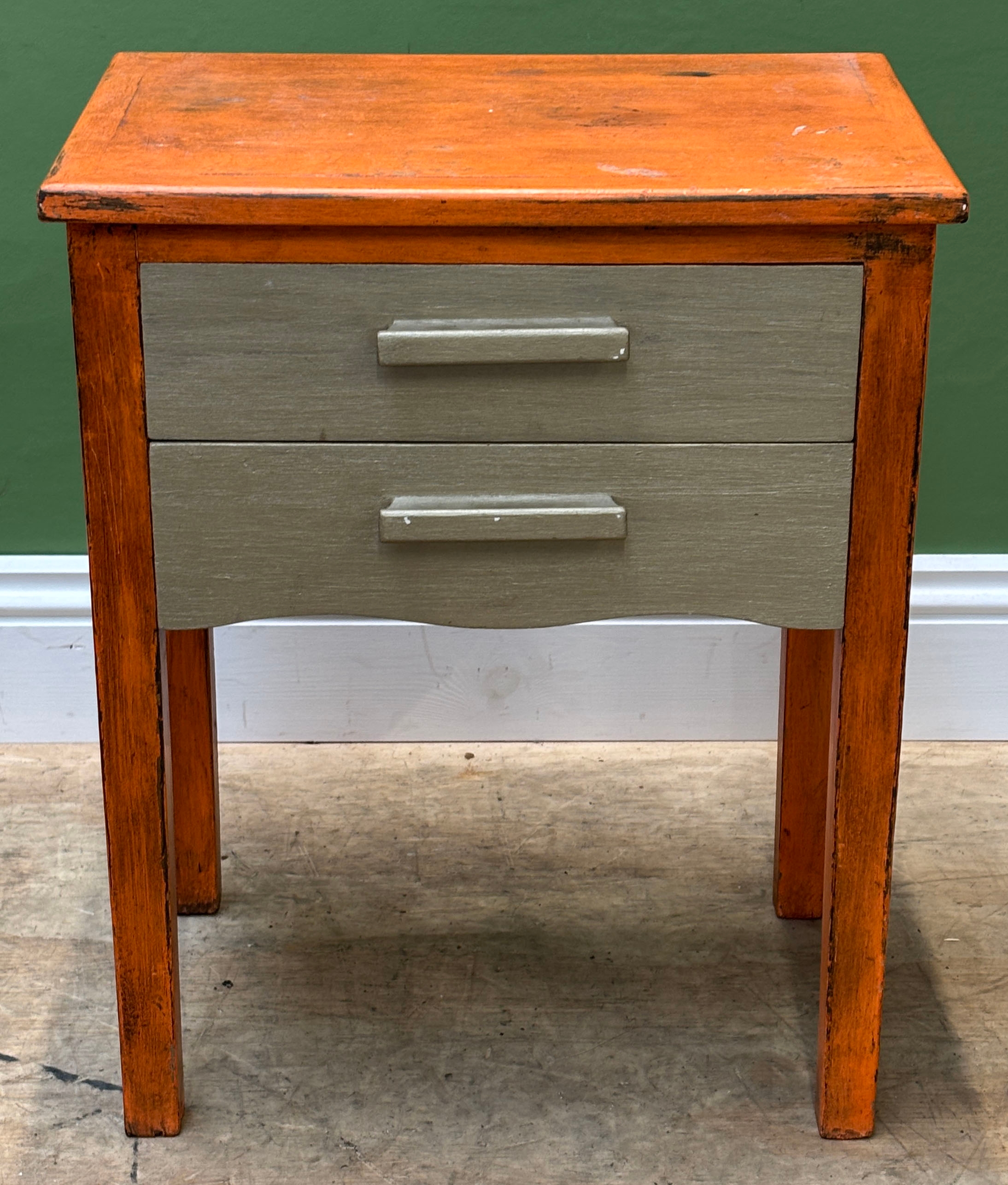 An orange and silver painted side table, 47x32x58cmH, together with a pine bedside table of three drawers