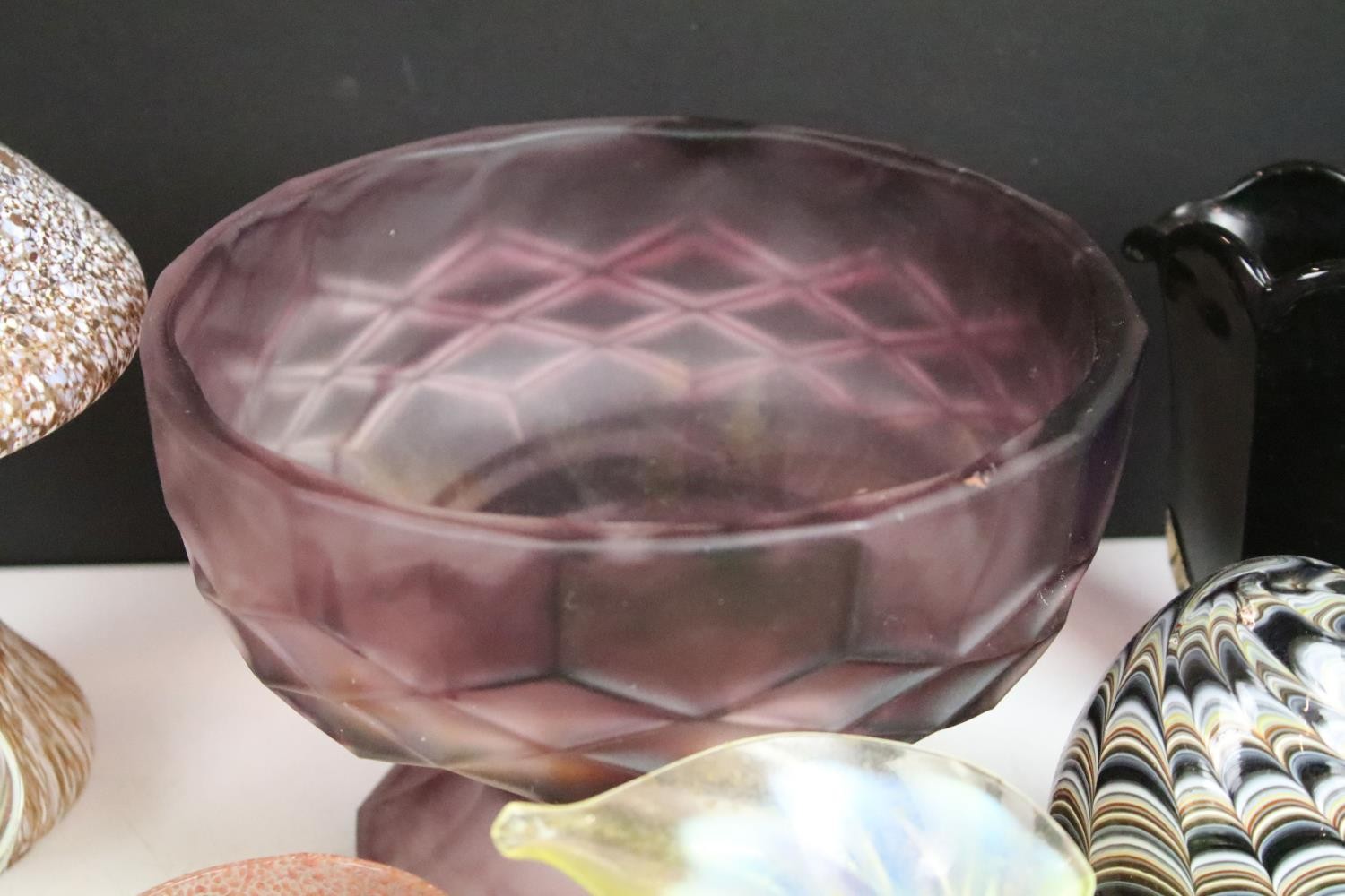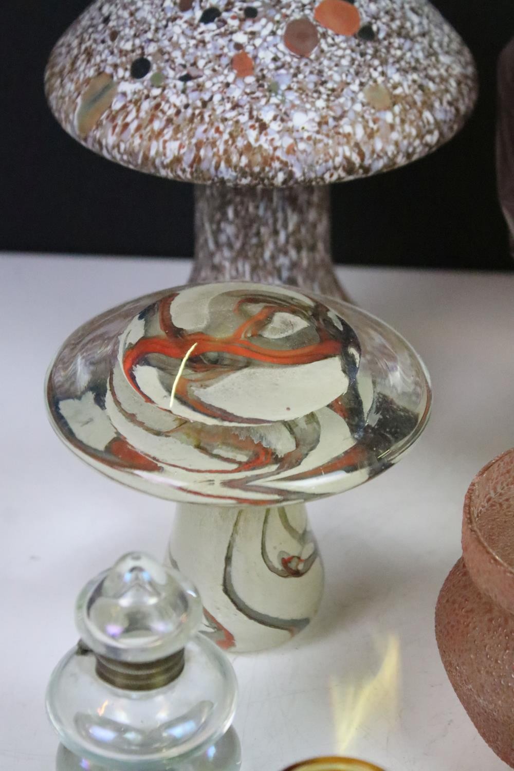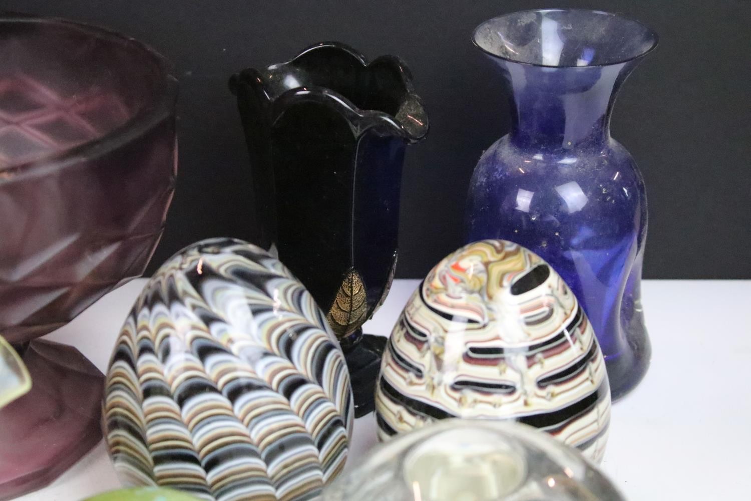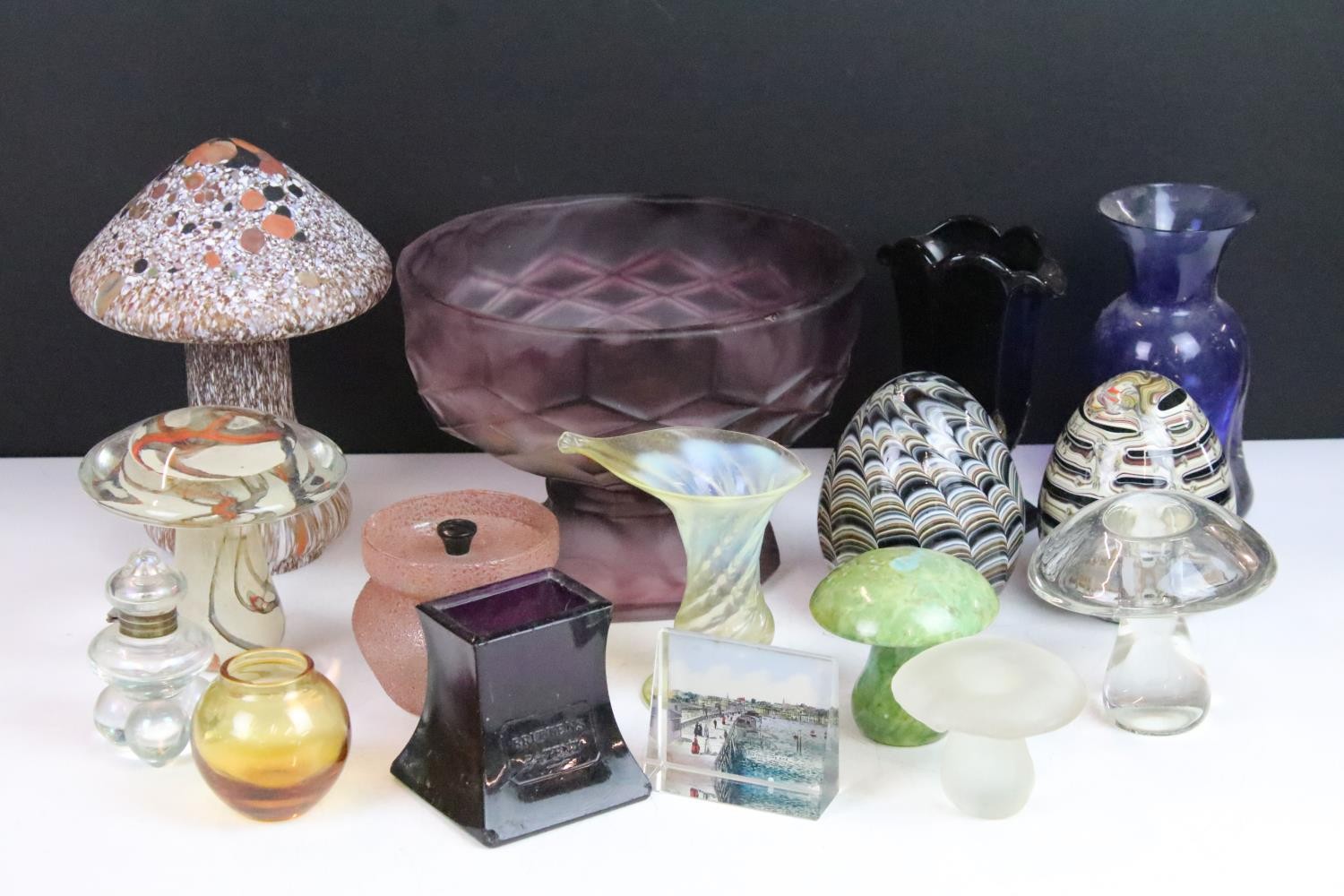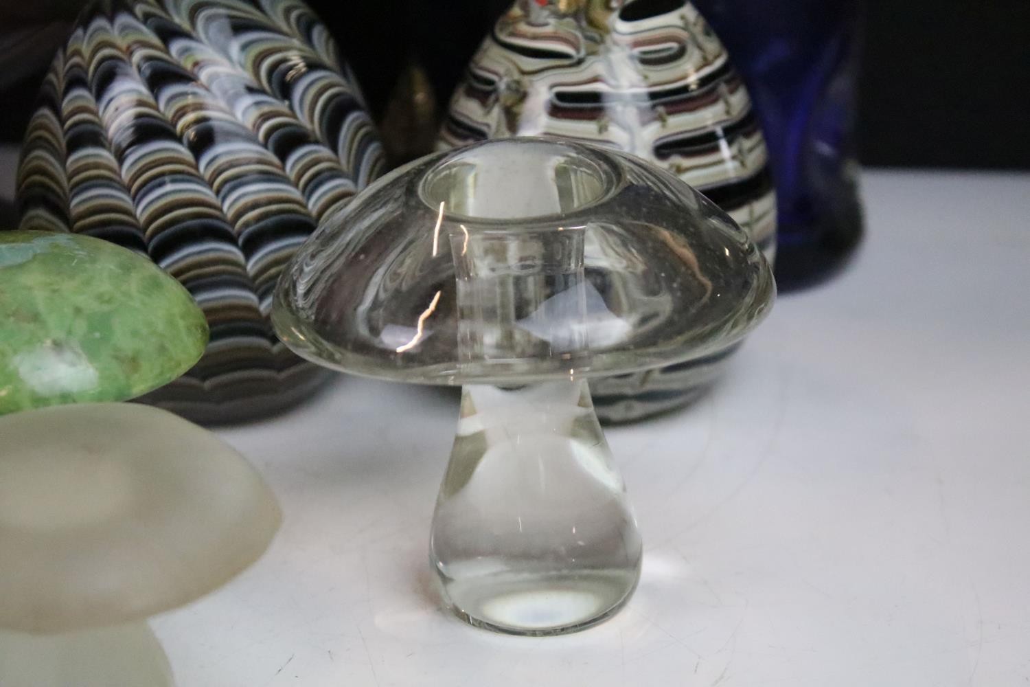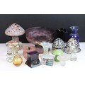 Collection of glass ware to include Kosta Boda large mushroom, Britten's Patent purple glass weight, soap bubble glass inkwell, Davidson style amethyst cloud glass footed bowl, two twist swirl eggs, black glass vase with gold leaf decoration, two hand blown mushrooms, preserve jar, seaside paperweight, hand carved toadstool, small glass mushroom, etc