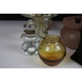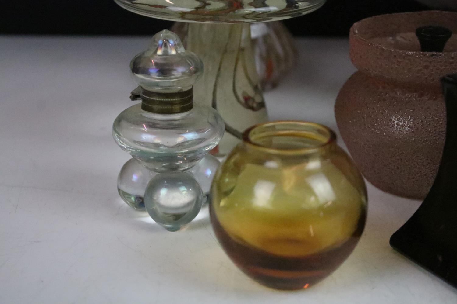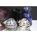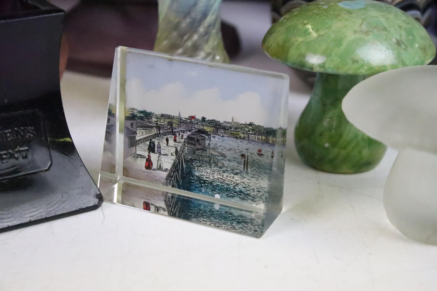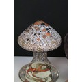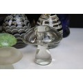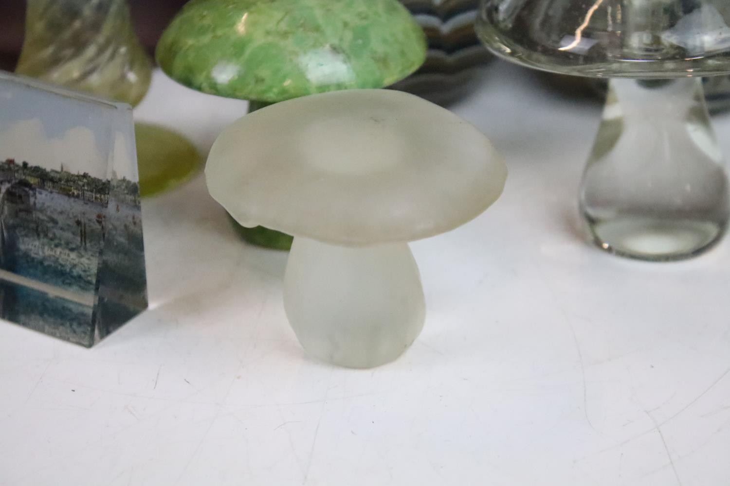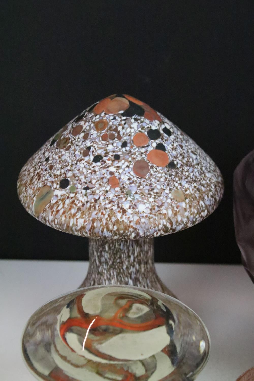 Collection of glass ware to include Kosta Boda large mushroom, Britten's Patent purple glass weight, soap bubble glass inkwell, Davidson style amethyst cloud glass footed bowl, two twist swirl eggs, black glass vase with gold leaf decoration, two hand blown mushrooms, preserve jar, seaside paperweight, hand carved toadstool, small glass mushroom, etc