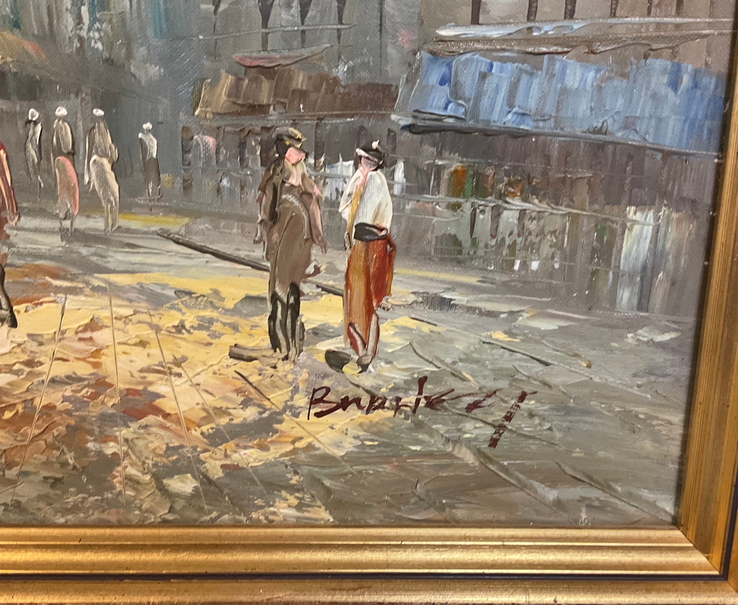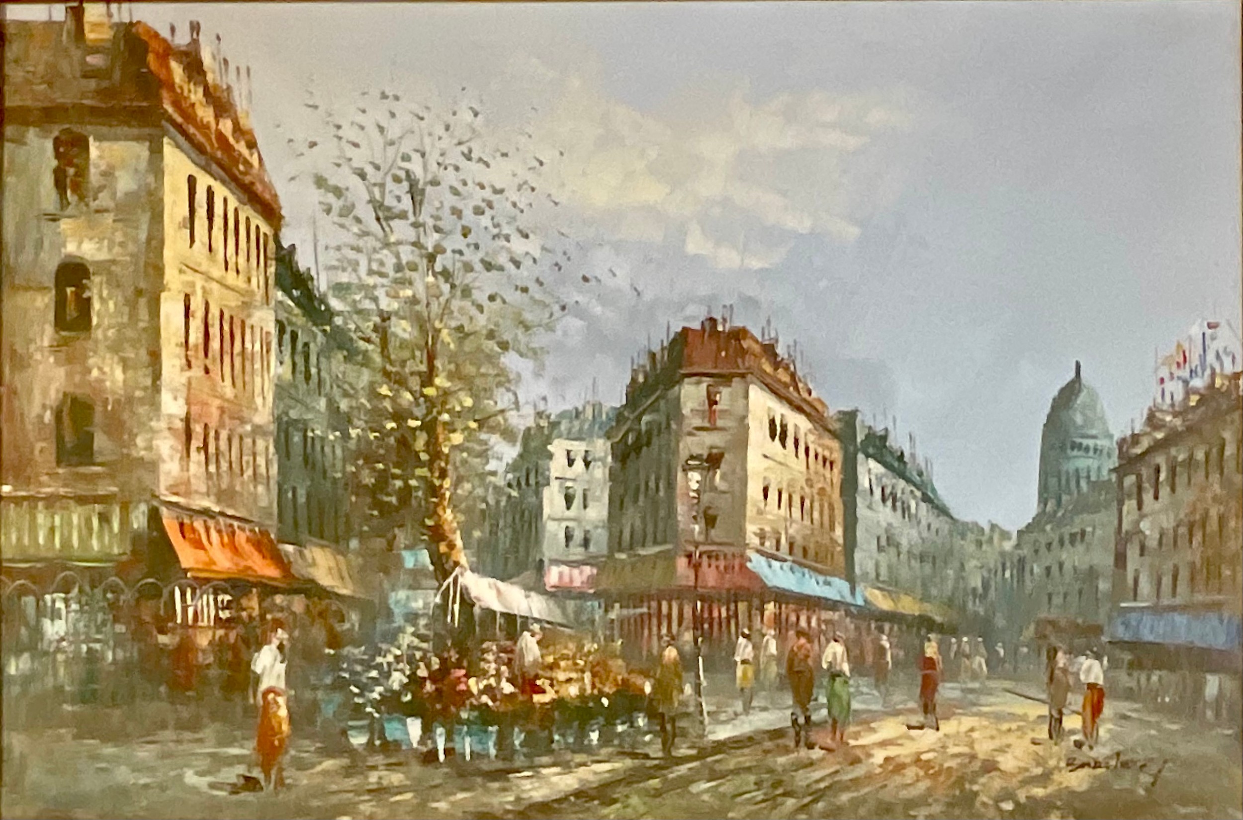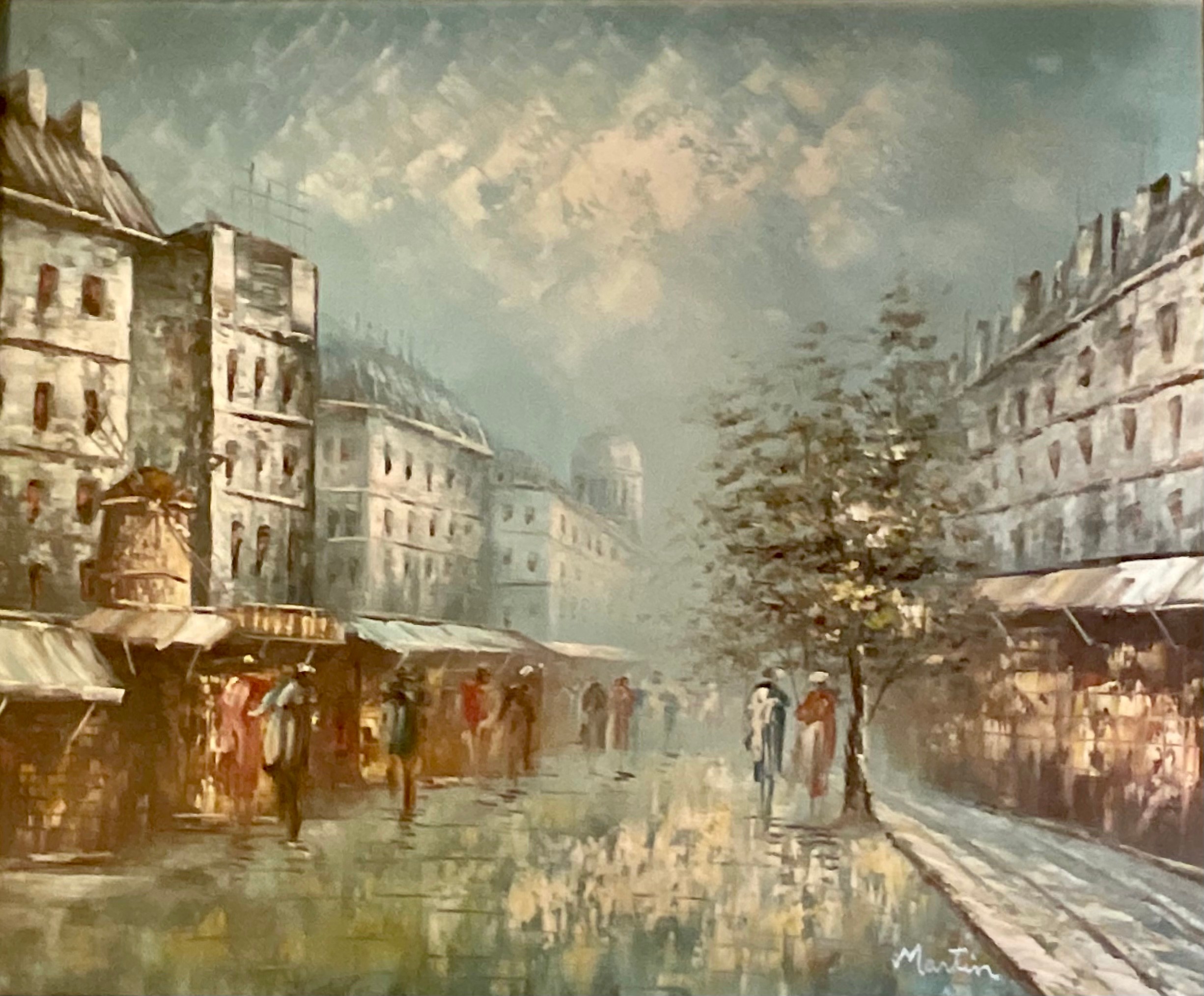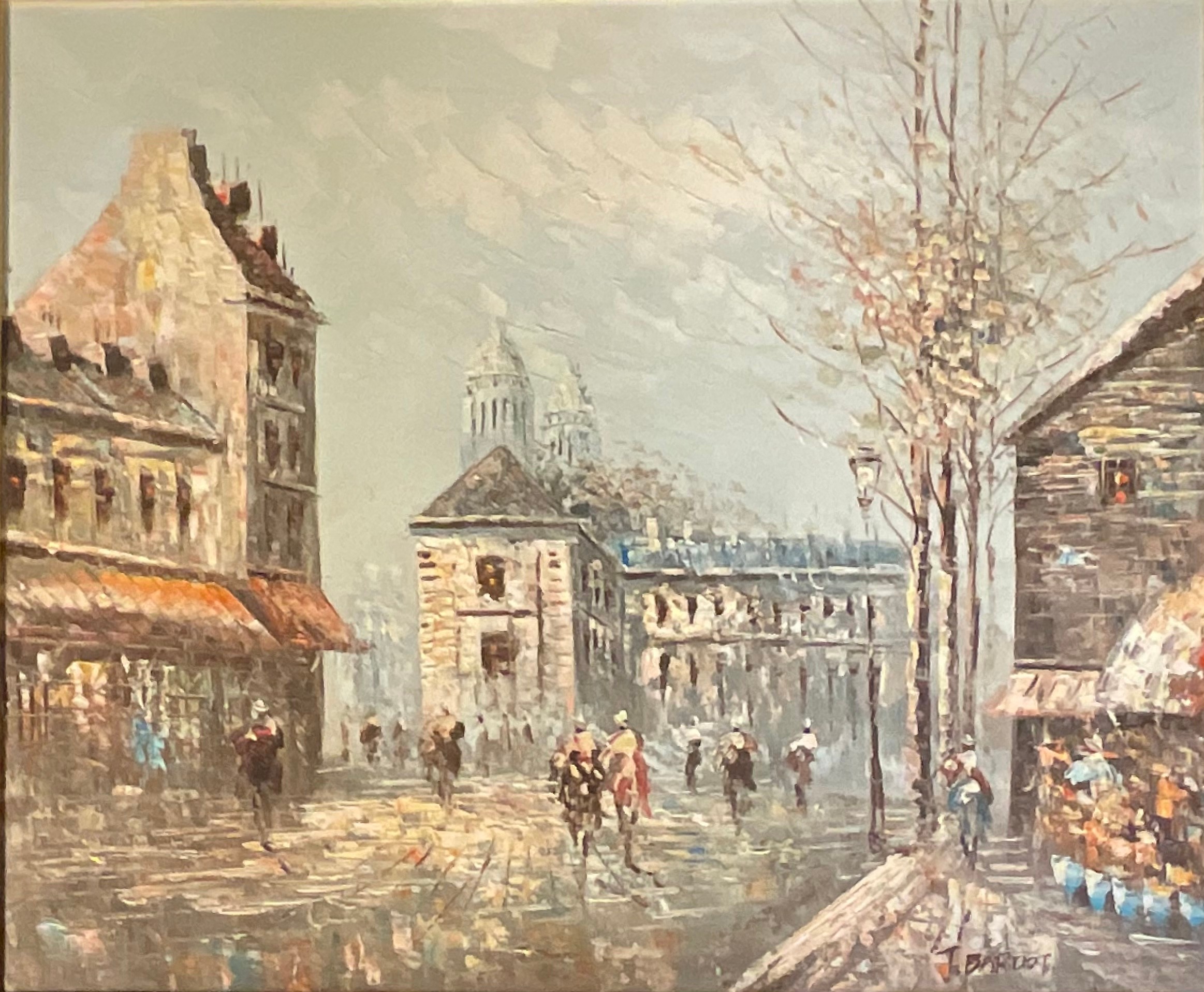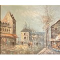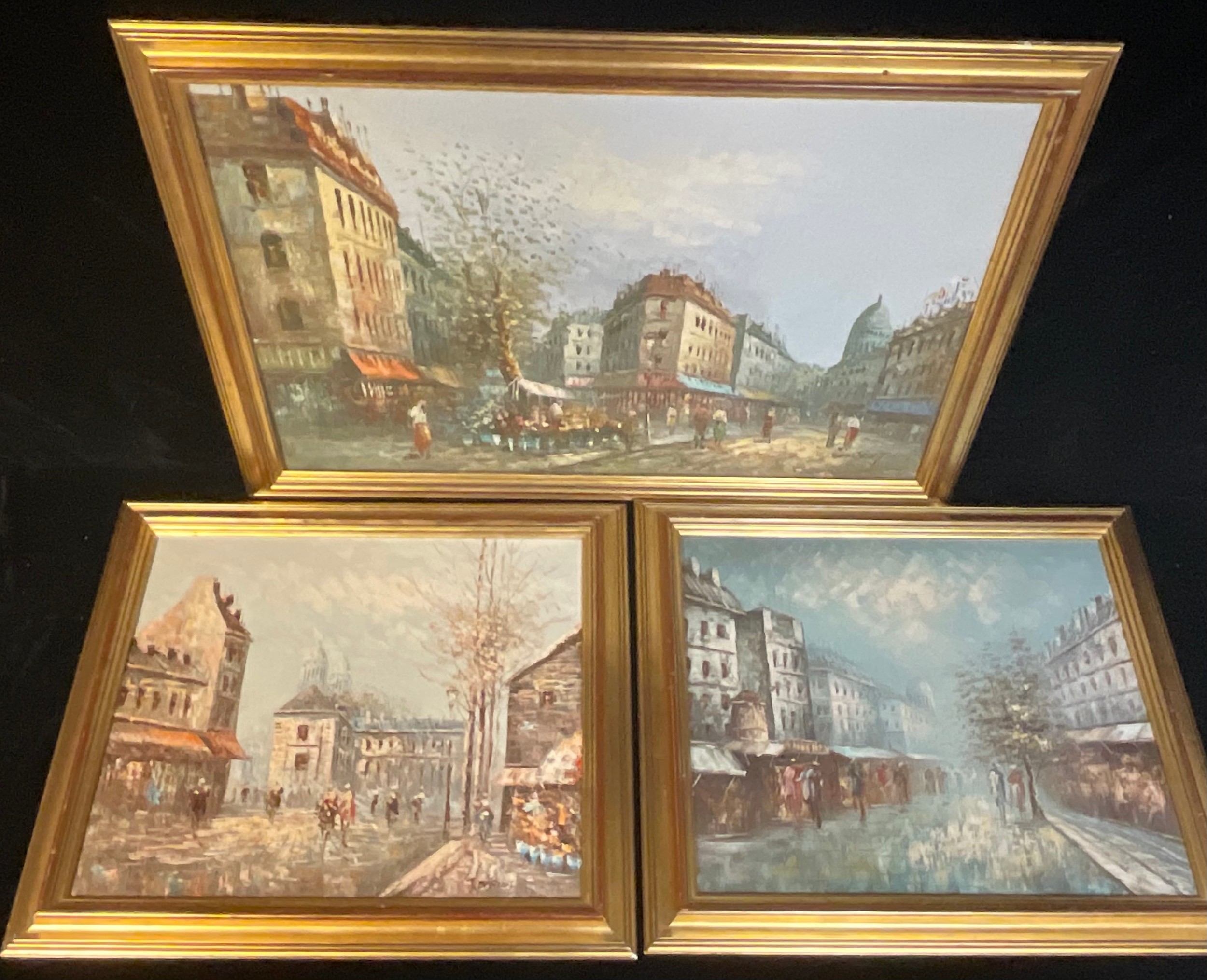 J. Bardot, Paris Street Scene, signed, oil on canvas, 49cm x 59cm; Martin, Moulin Rouge Paris, signed, oil on canvas, 49cm x 59cm; Continental School, Paris, indistinctly signed, oil on canvas, 59cm x 90cm (3)