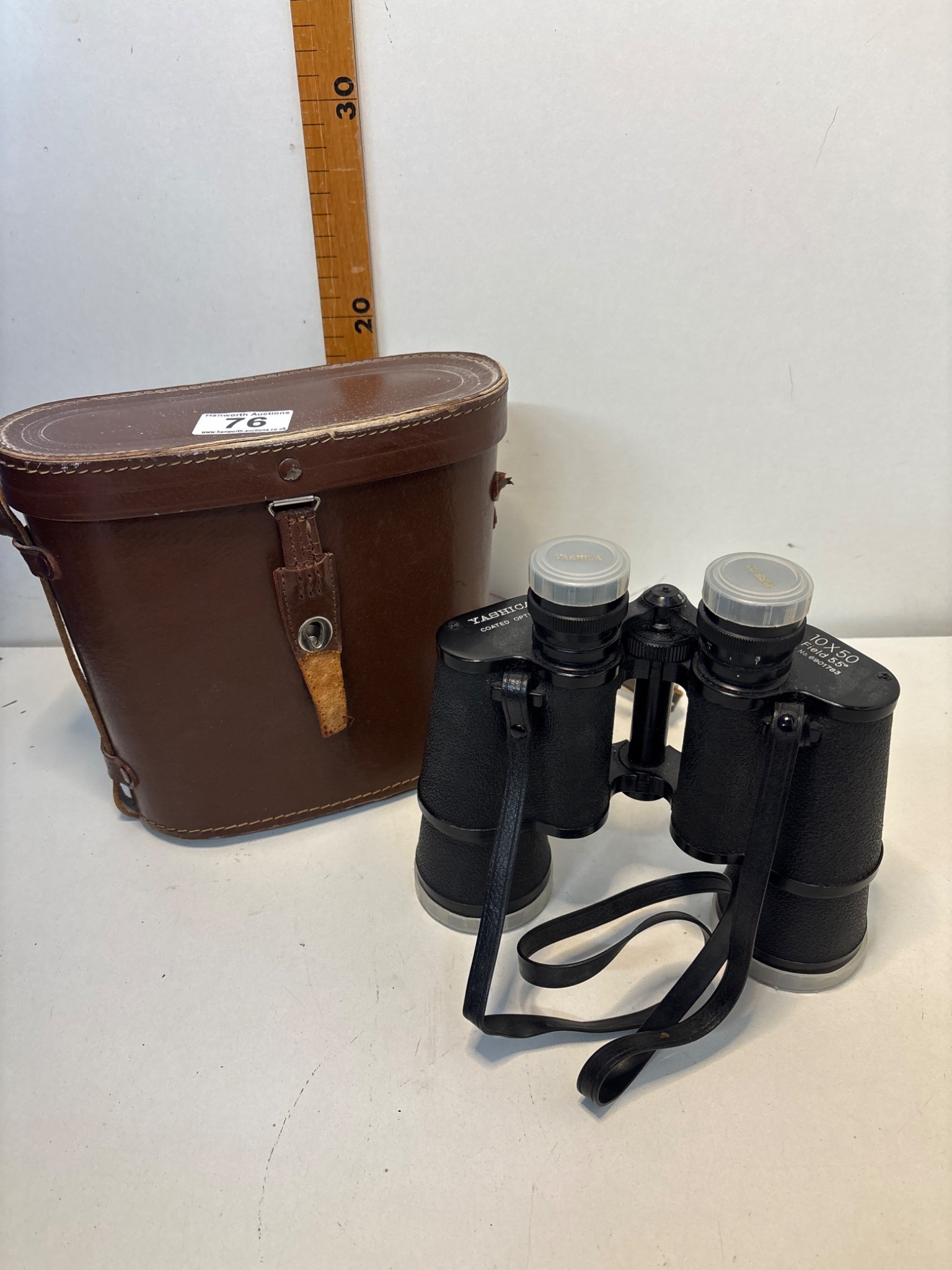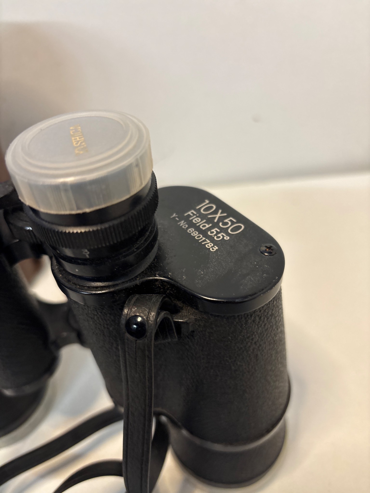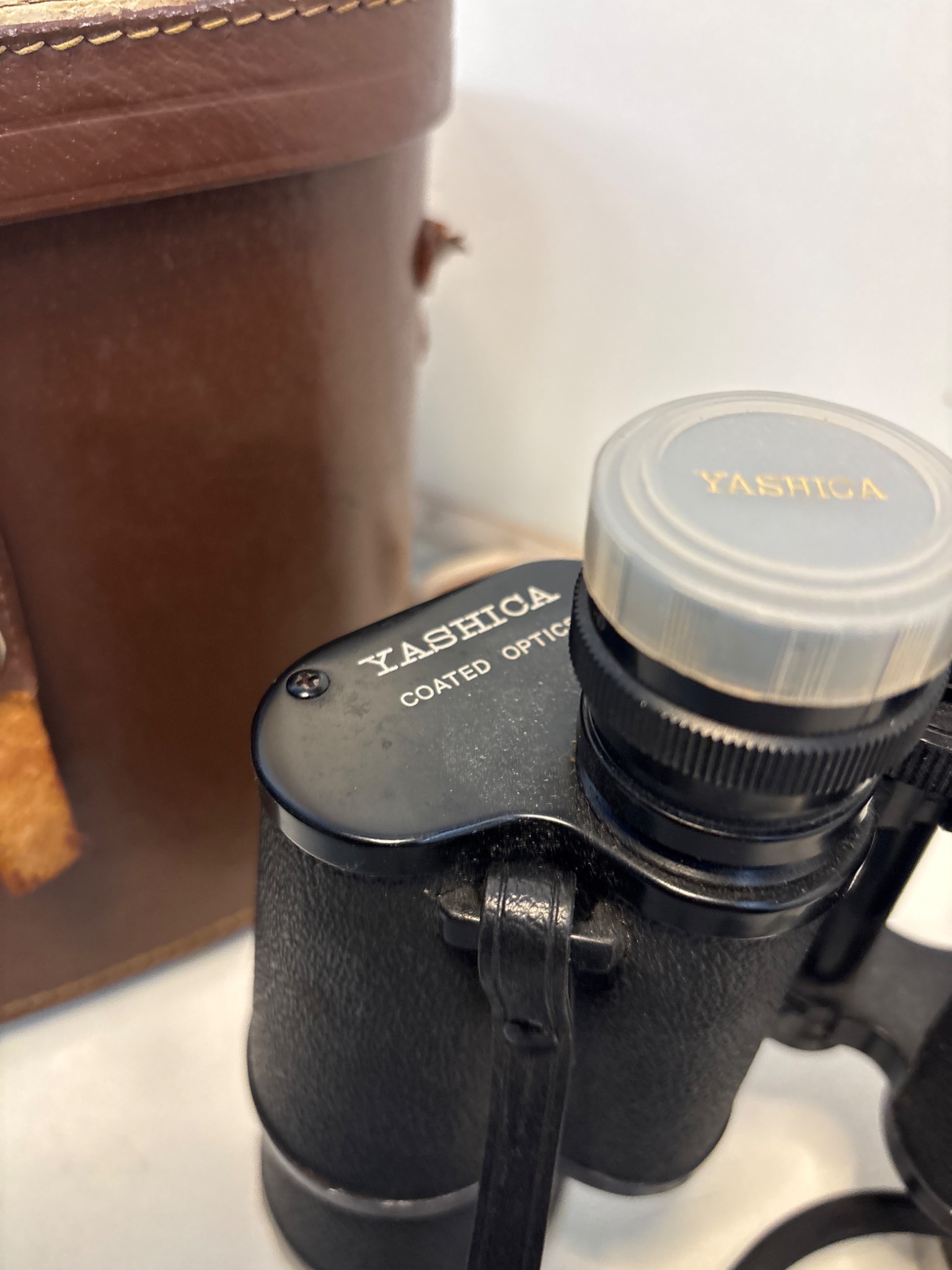 Yashica 10x50 coated optics binoculars with 5.5-degree field of view. Includes a protective leather case.