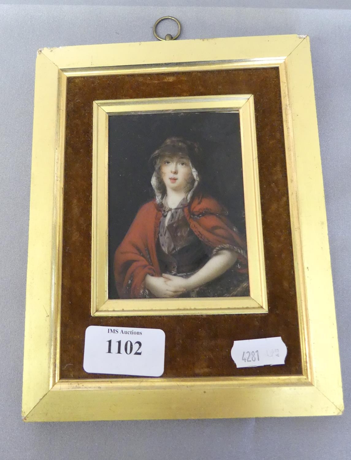 19th Century Antique Portrait Miniature of a Young Girl Waering Red Cloak, approx 7 x 9.5cm - Historical Christies Label (Edinburgh 1995).