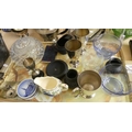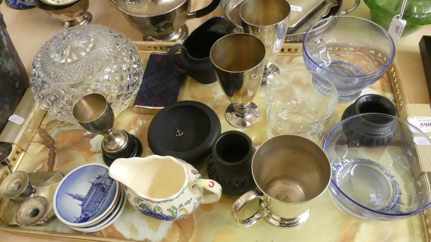 Tray Lot - Crystal Table Lamp Shade, EP Goblets, Masons Jug etc.