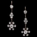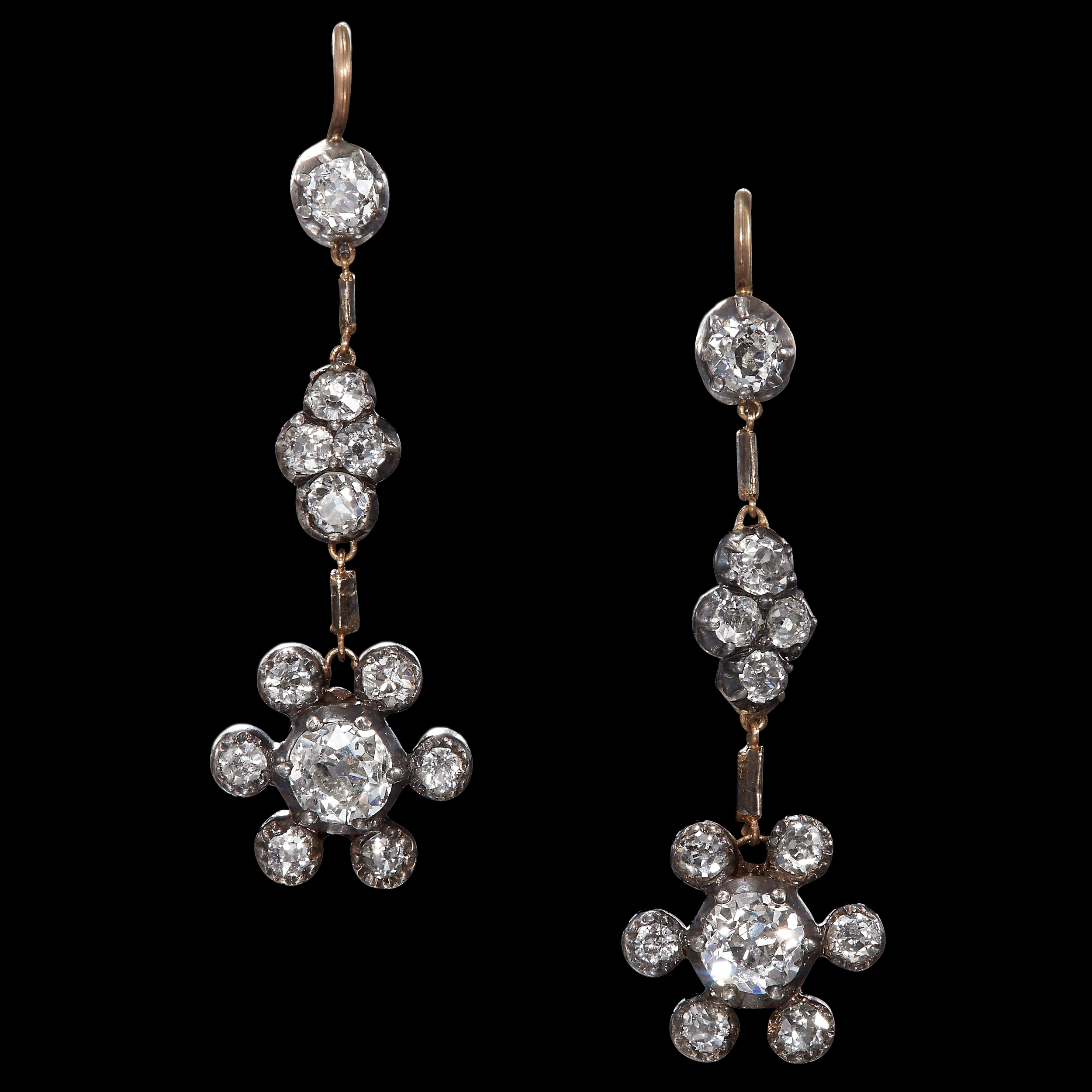 FINE PAIR OF ANTIQUE VICTORIAN DIAMOND DROP EARRINGS, Set with bright and lively diamonds and a larger diamond cluster drop. L. 3.9 cm. 5.5 grams.