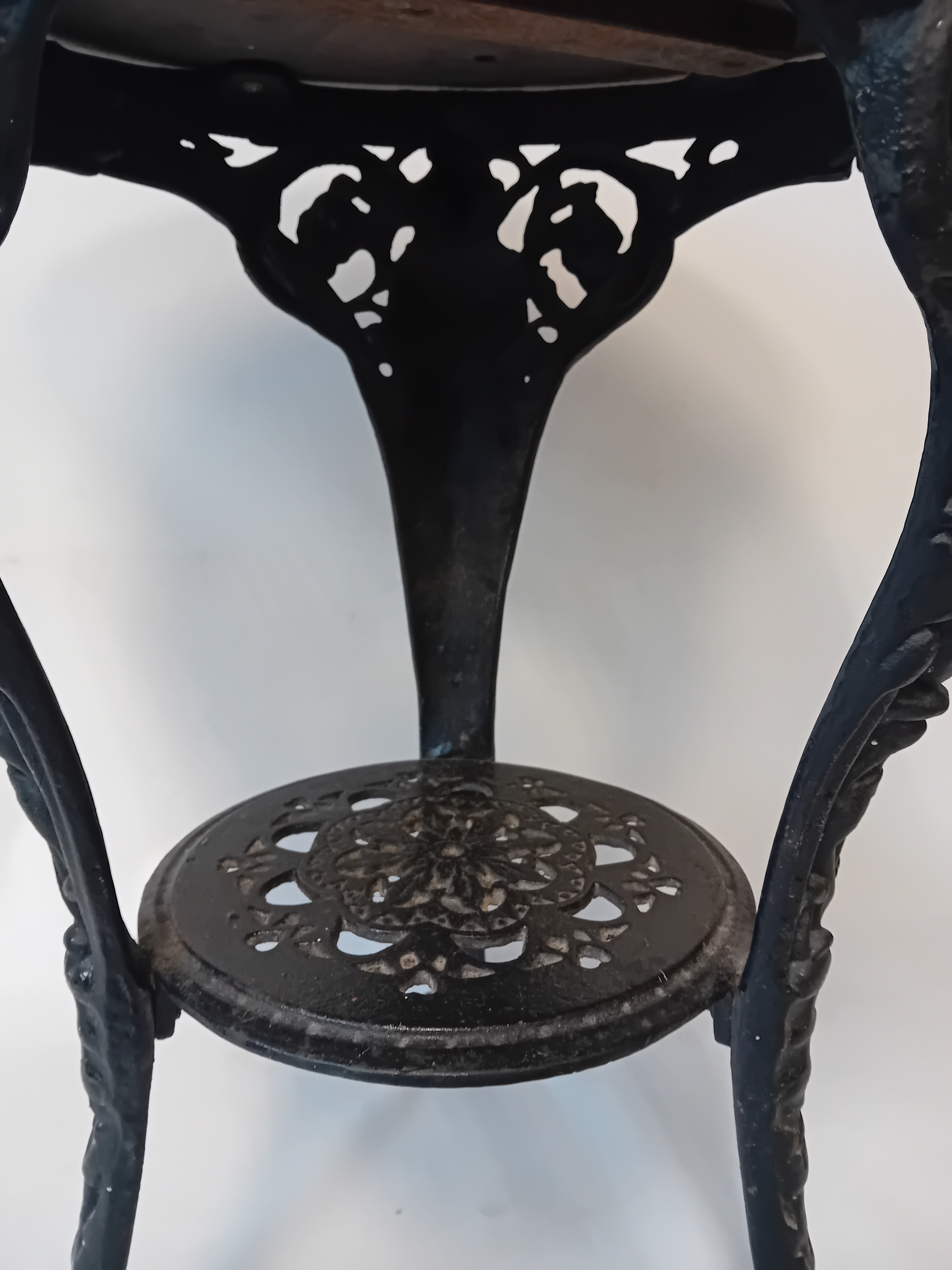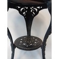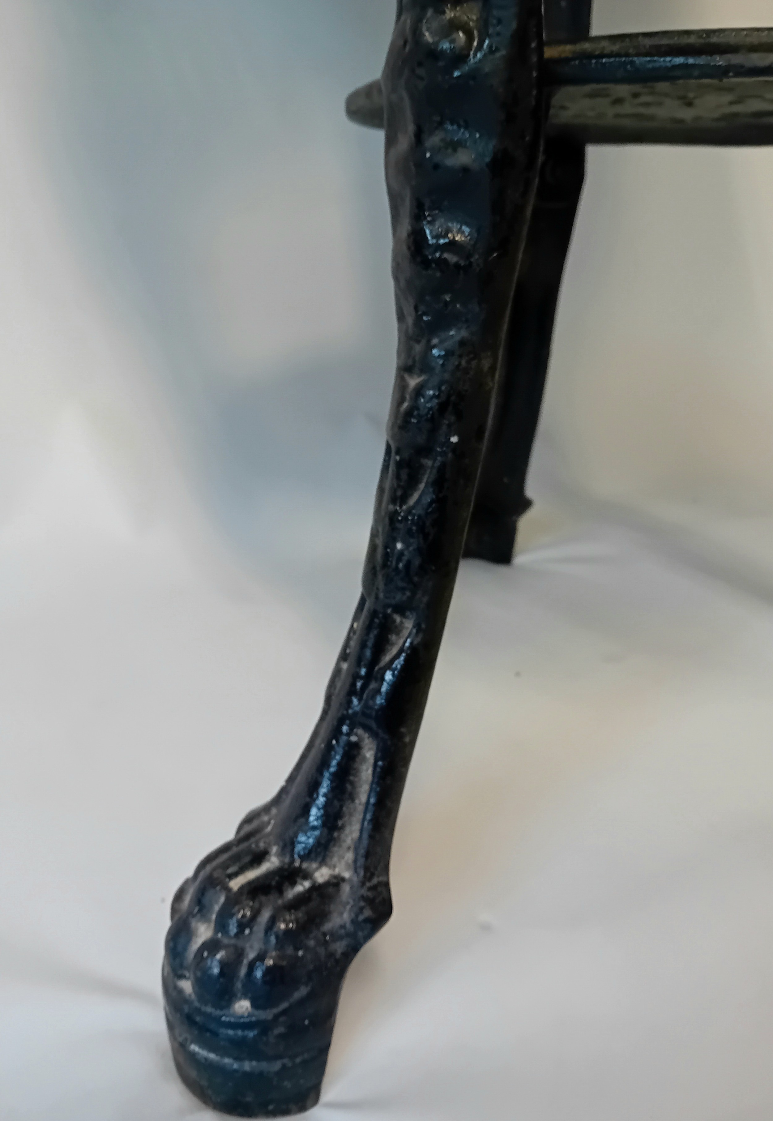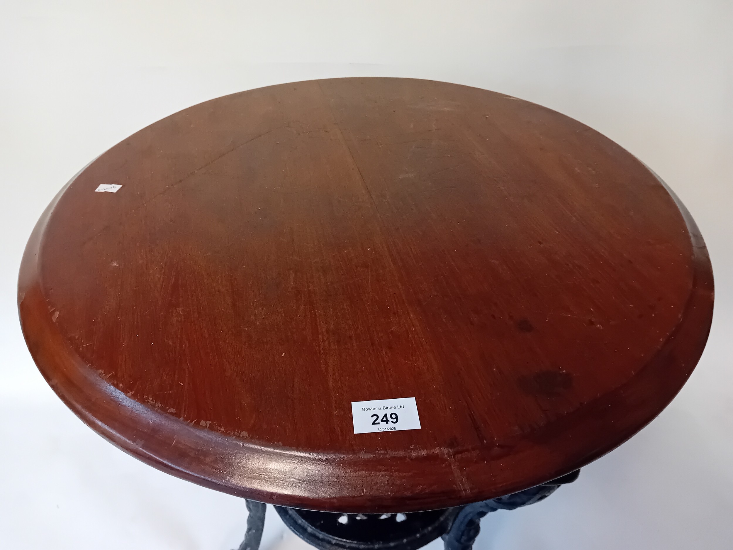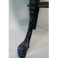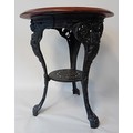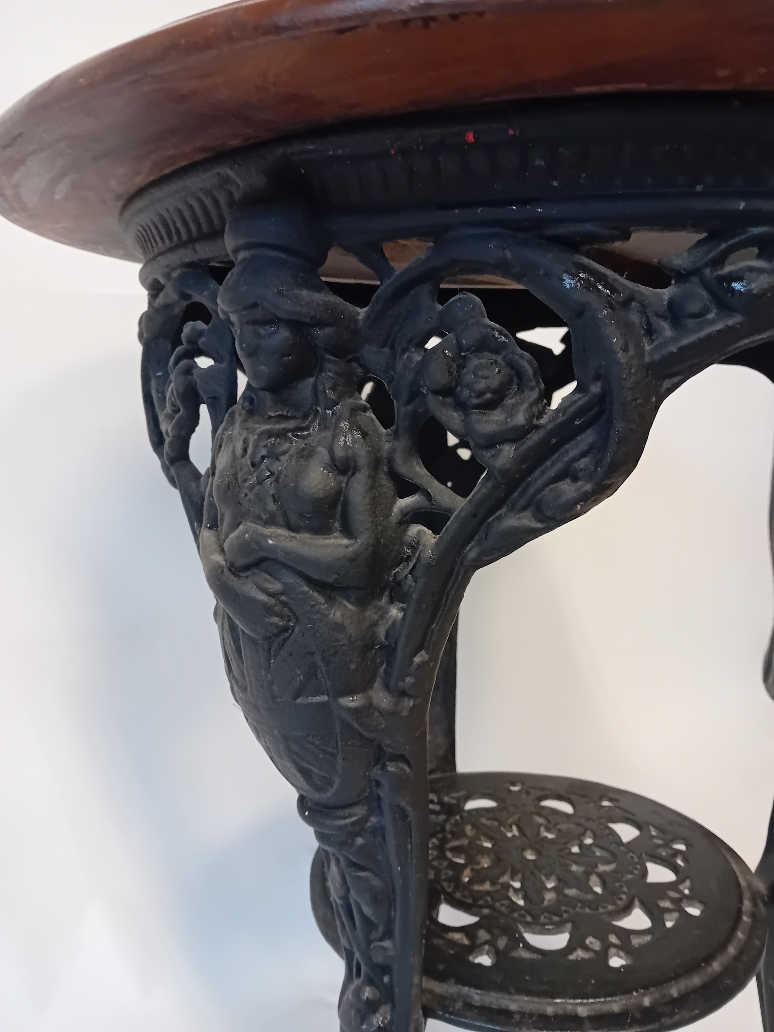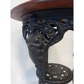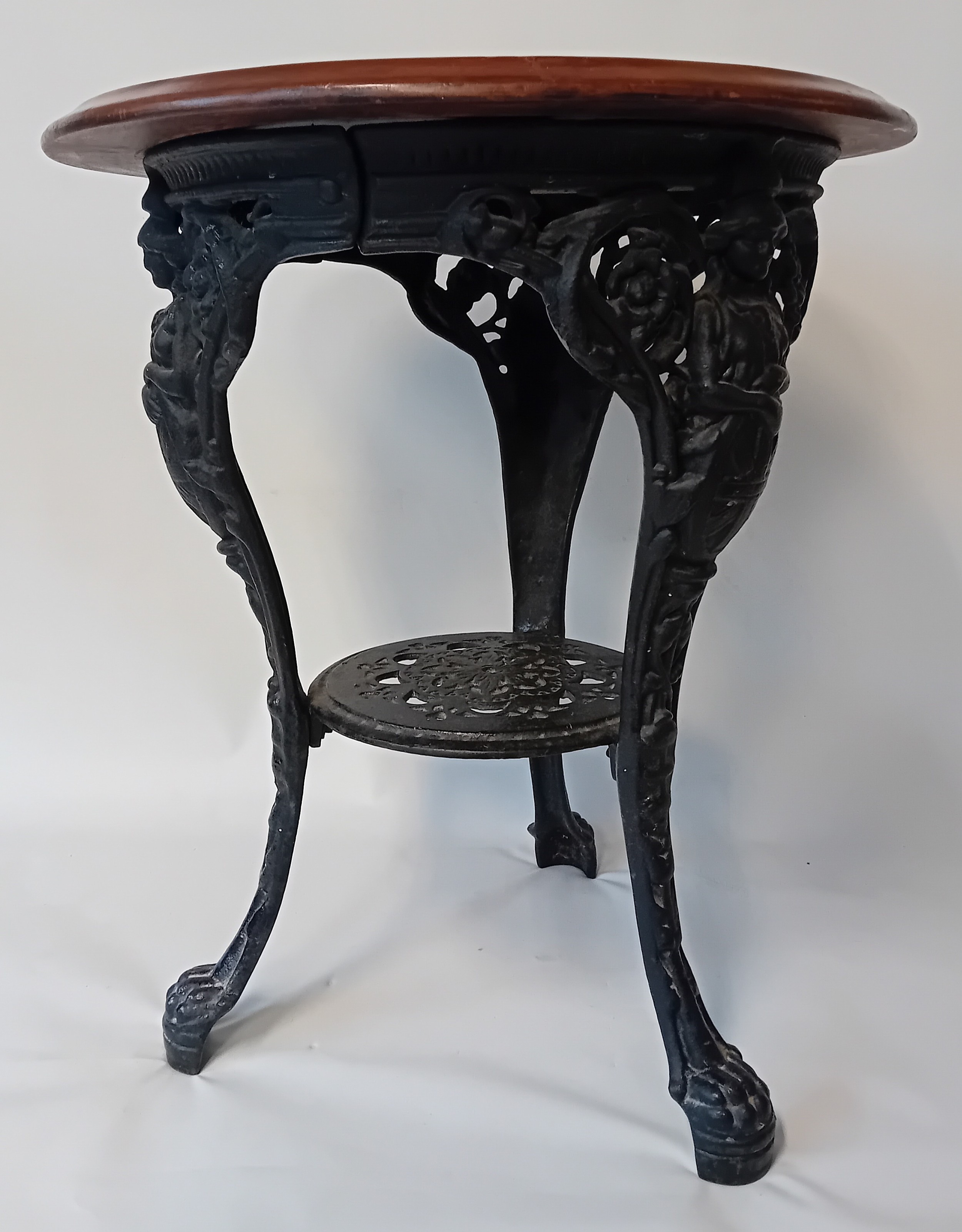 Vintage cast iron table with mahogany top, the base features three slayed legs with lion paw feet, decorative apron at the top depicting the figure of Britannia holding her shield.