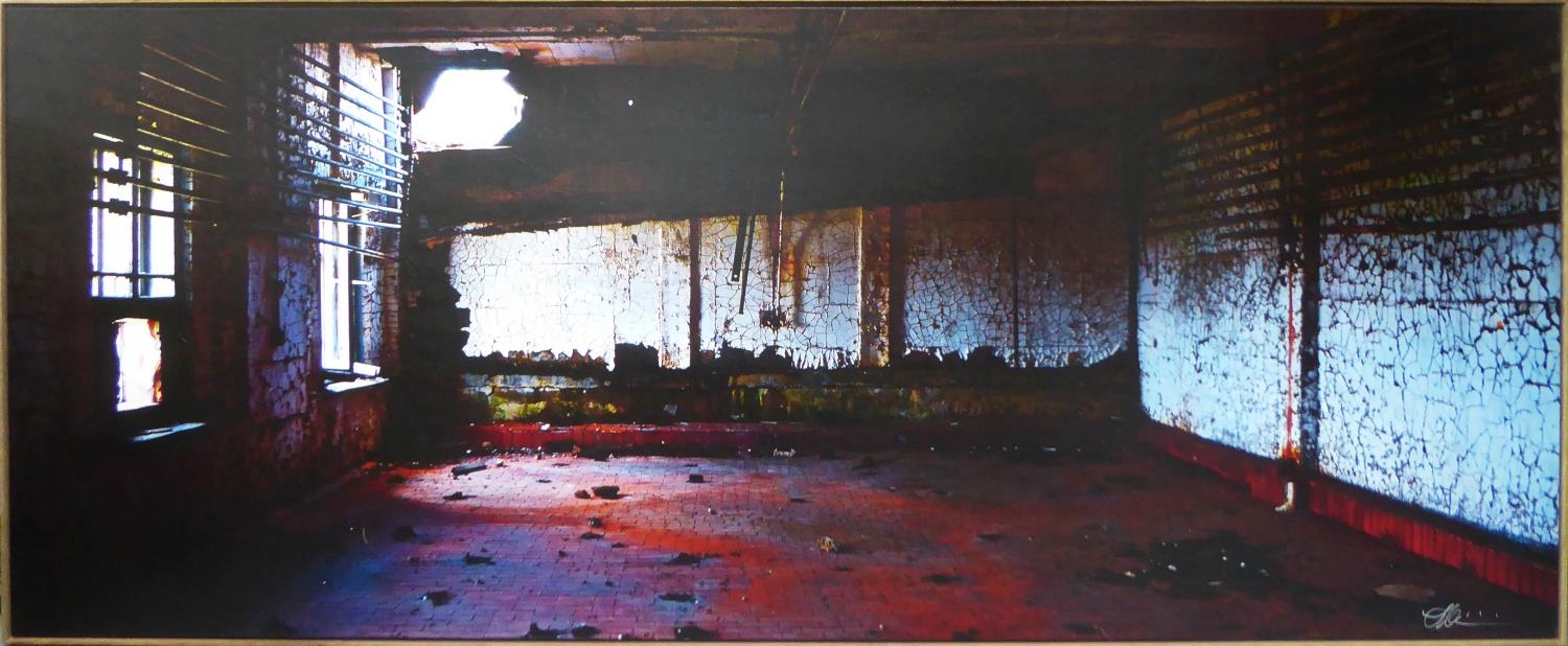 LOUIS OLIVIERI (NY photographer) 'Derelict Warehouse', photographic print on canvas, signed lower right, 102cm x 250cm, framed.