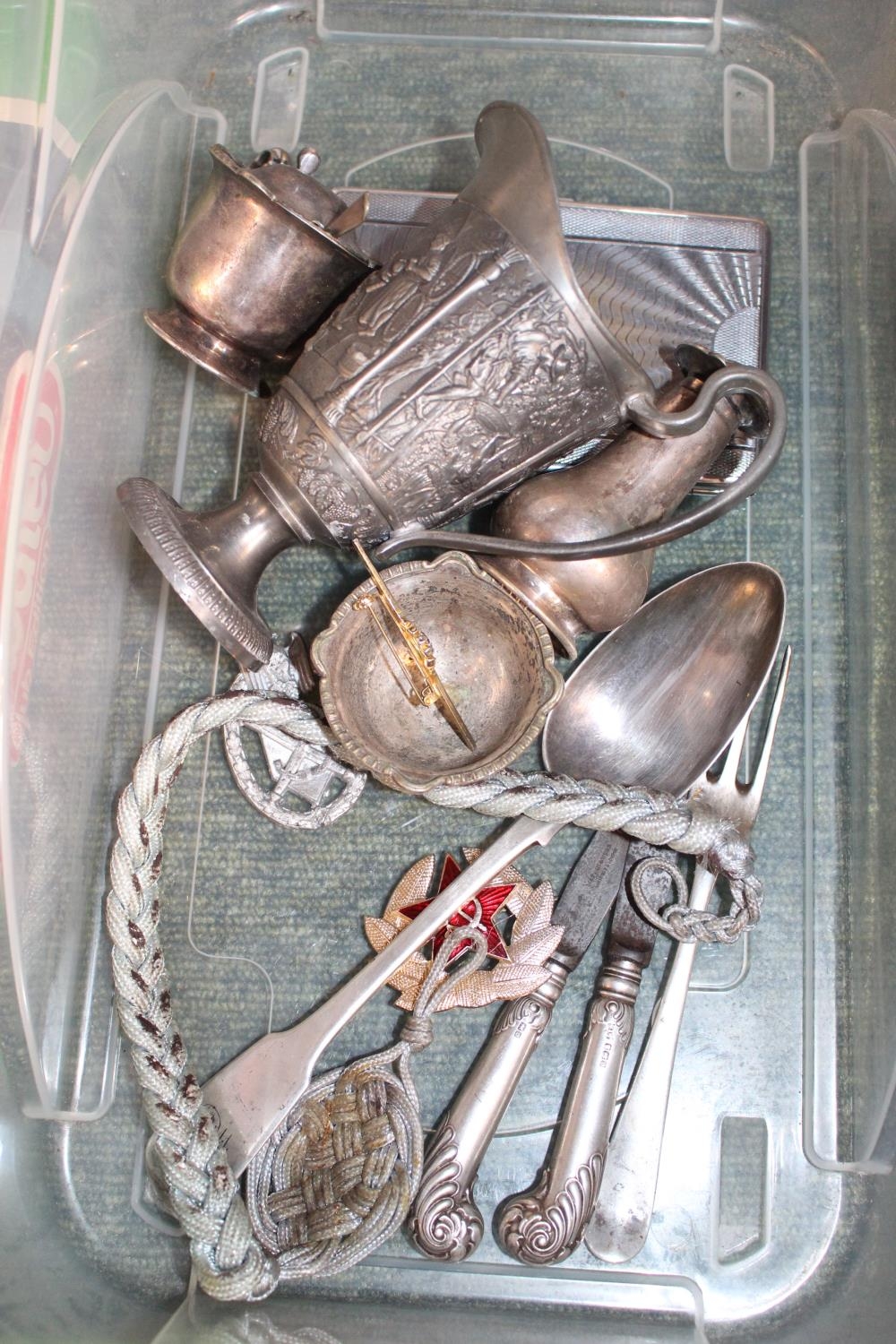 Collection of assorted Silver plated items and bygones inc. German Badge, Cigarette case etc