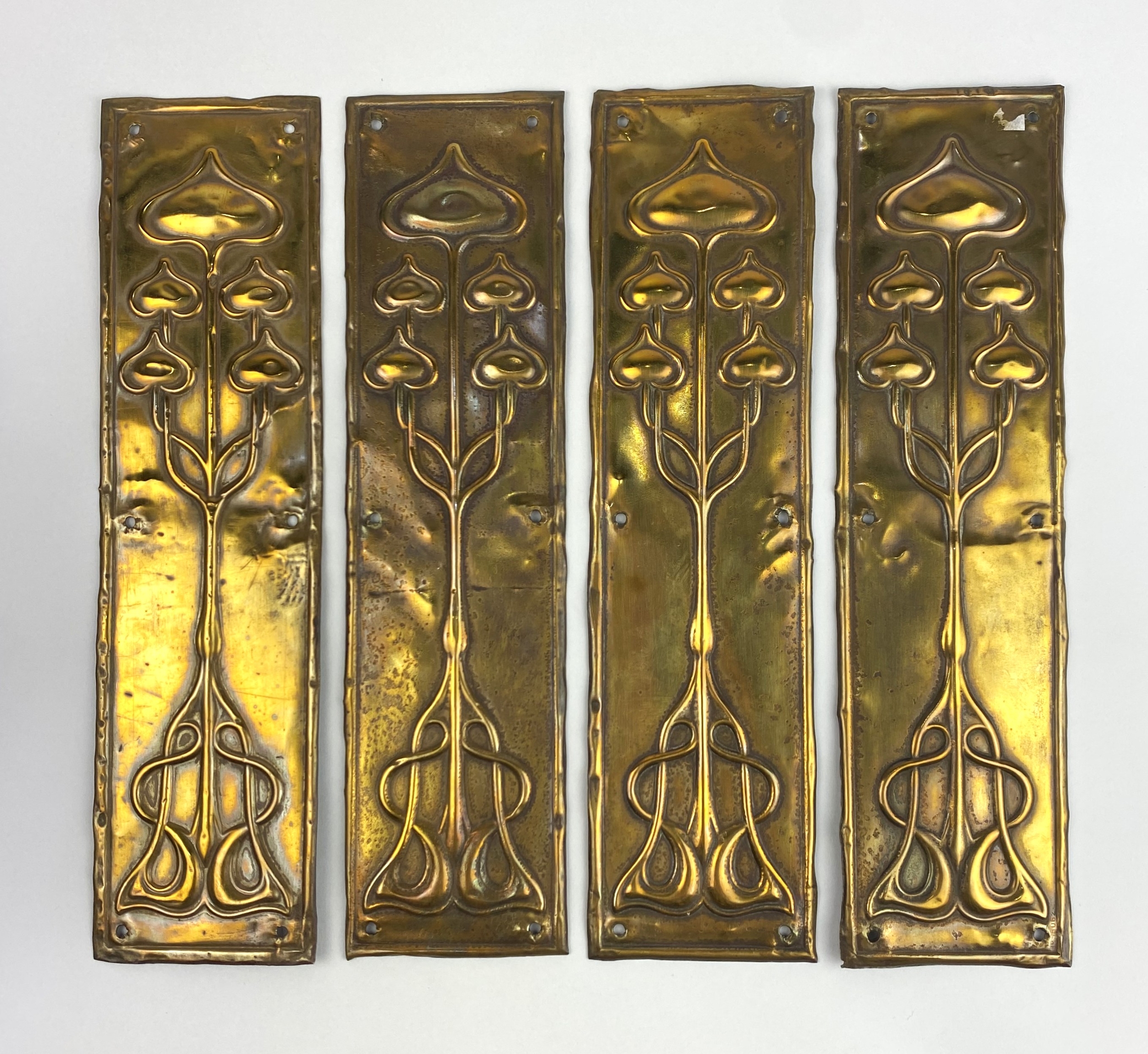 A set of four Art Nouveau brass finger plates, each with embossed stylised floral motif, 26.75cm x 7cm (AF) (4)